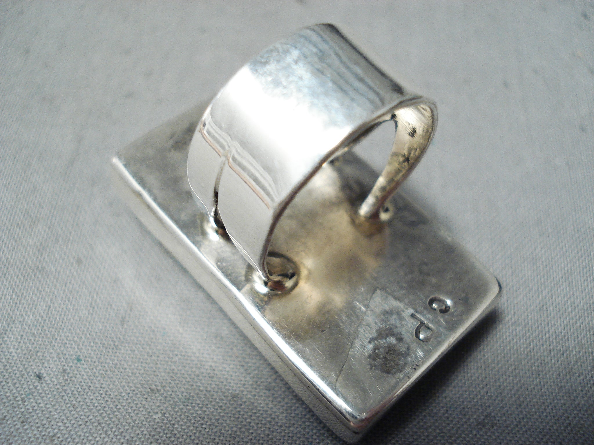Here we have an exceptional Navajo silver ring featuring 6 turquoise cornrows with silver borders, and a graduated double rail band that reduces to a solid silver band! So Incredible! The stones measure around 1-3/8" x 1/8". The ring face measures around 1-3/8" x 7/8". Signed by Navajo artist, Clinton Pete. The ring size is around 7. Sterling silver, marked. Sturdy 21 grams.