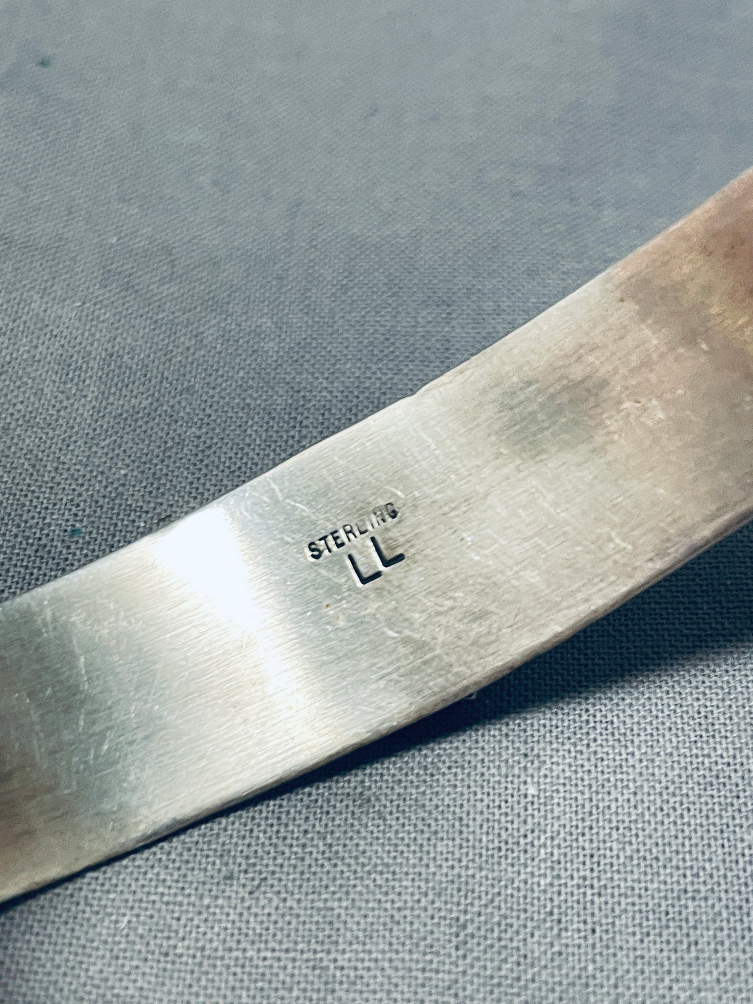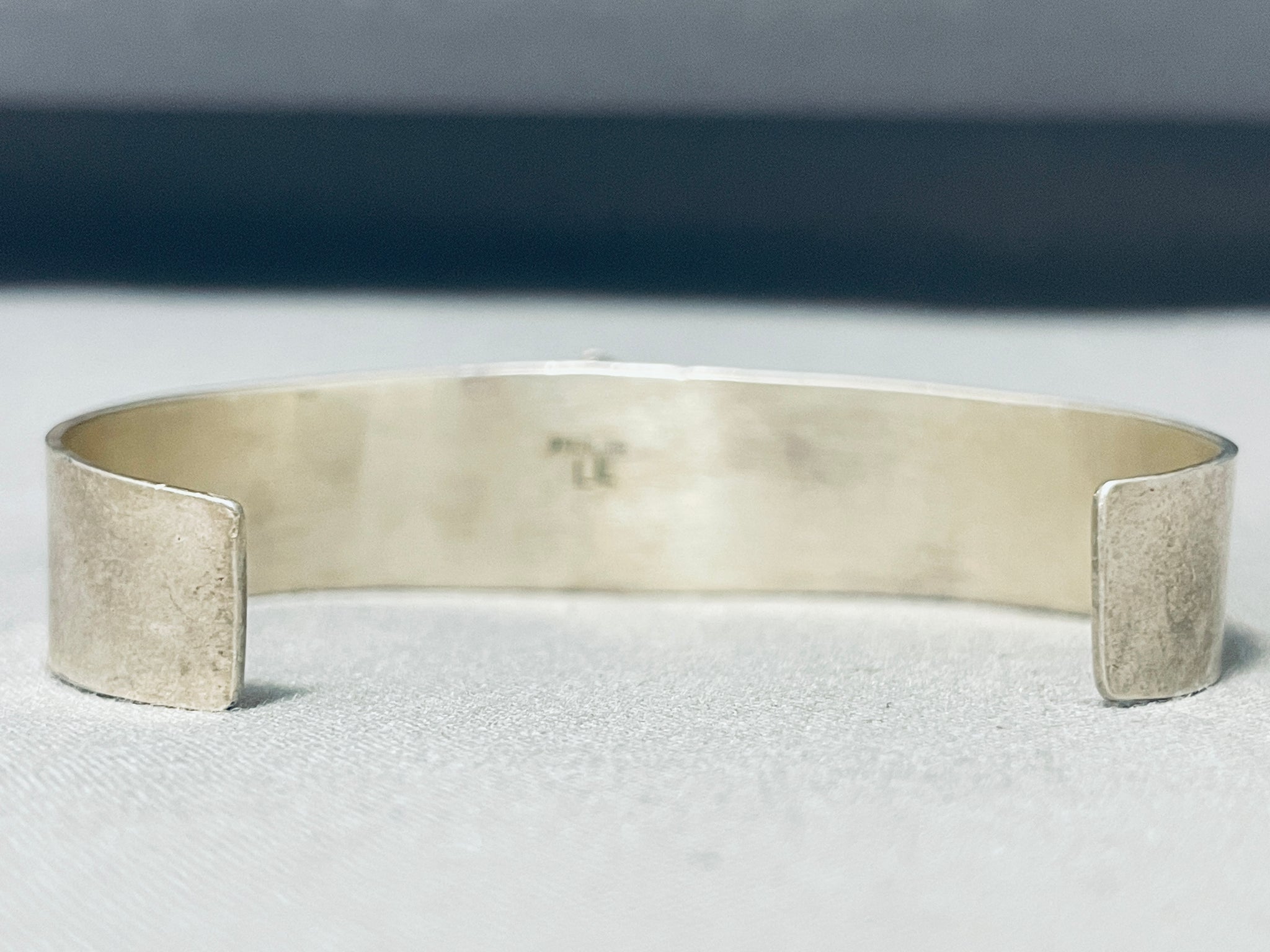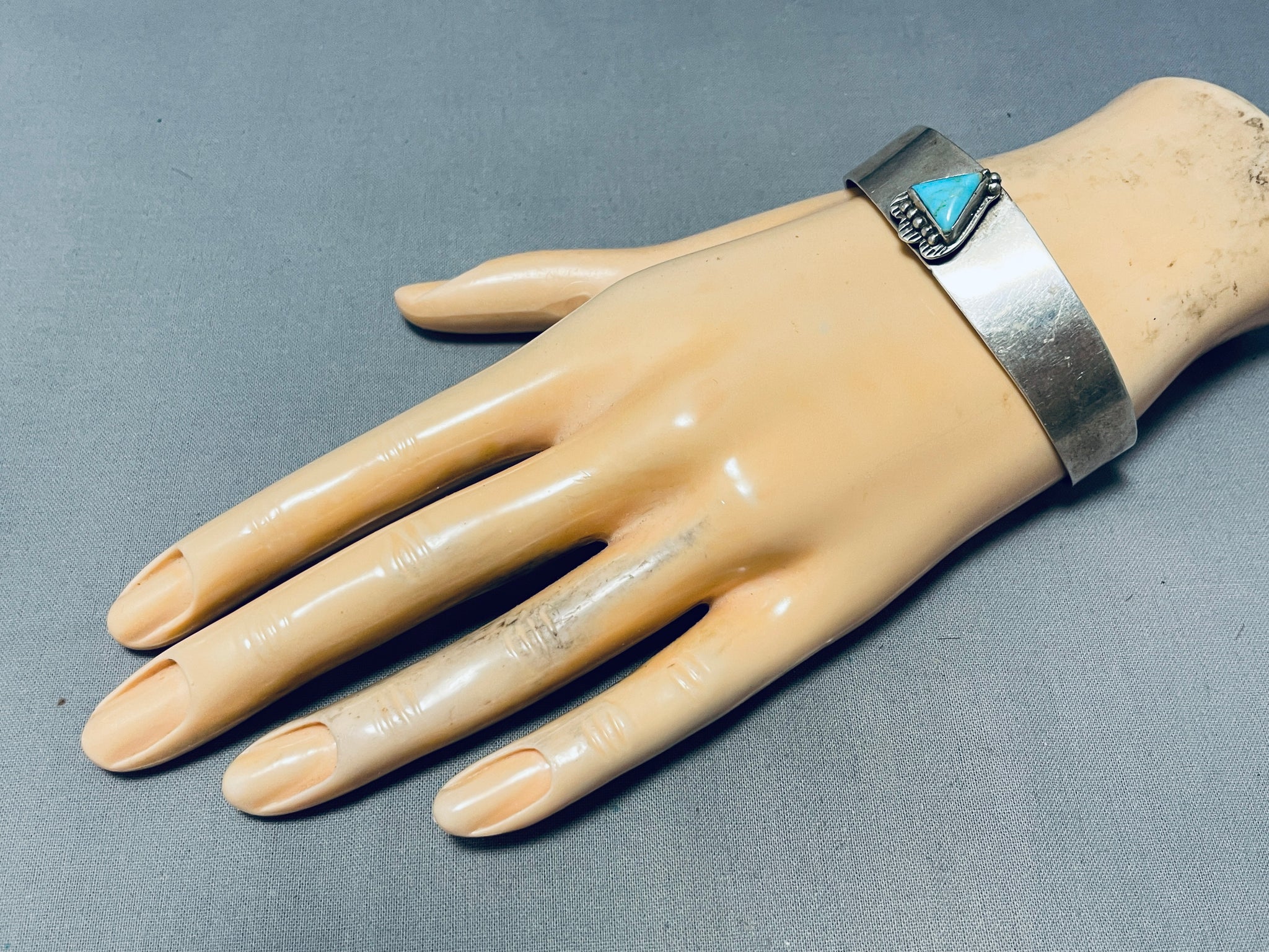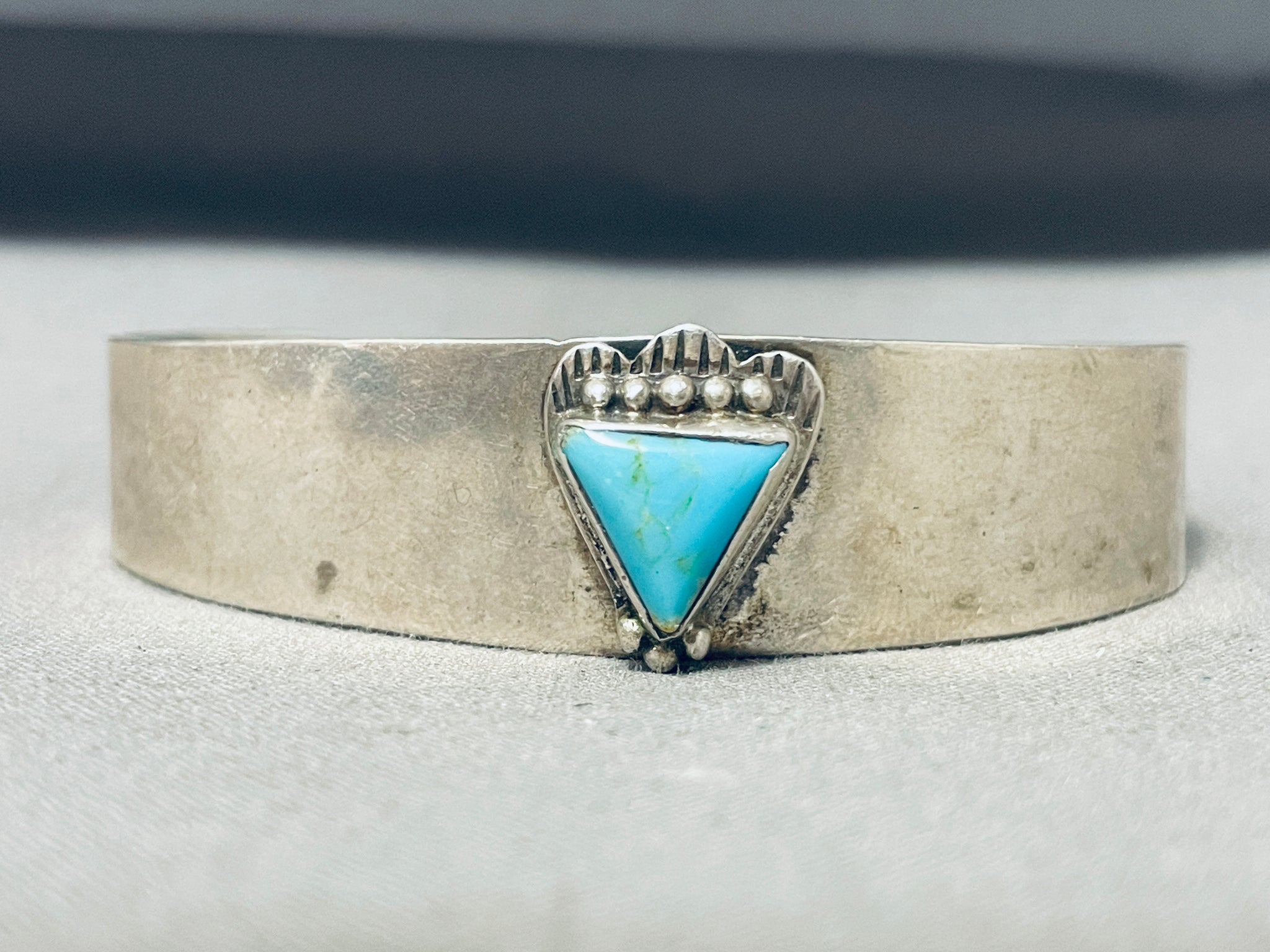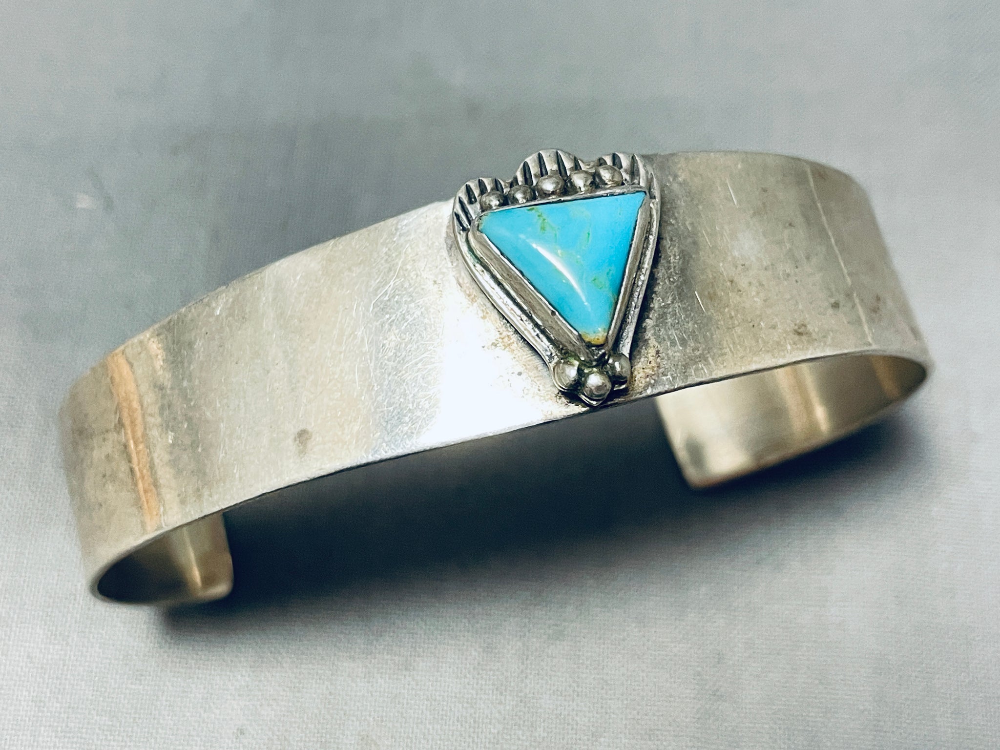 Up for sale is this magnificent vintage Navajo silver bracelet. The simplicity of the bracelet takes this piece to the next level as it hosts the fabulous triangular silver station with the vibrant Blue Gem turquoise stone with silver beads! A Marvelous Piece! The center stone measures around 7/16" x 3/8". The width of the bracelet measures around 5/8". Signed by Navajo artist, L.L.. Sterling silver, marked. The inside end to end measures around 5-3/8" with an additional 1-5/8" gap. Sturdy 24 grams.