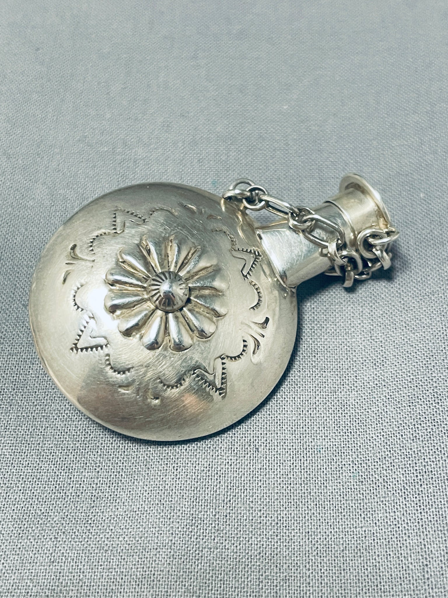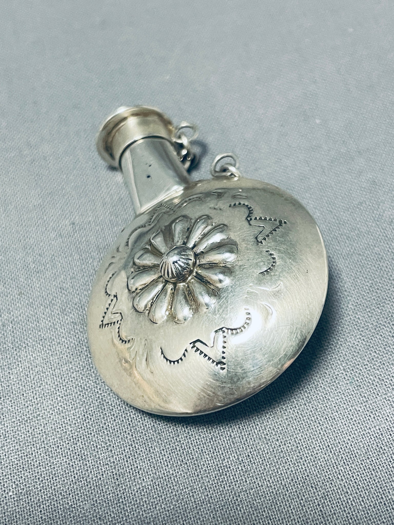 Up for sale is this remarkable vintage Navajo silver flask having a handcarved removeable lid with a silver kokopelli and a silver chain! This extraordinary piece has a large handcarved silver floral center and silver handstampings! Truly One of a Kind! The flask measures about 2" x 1-1/2". Sterling silver, marked. Sturdy 19 grams.
