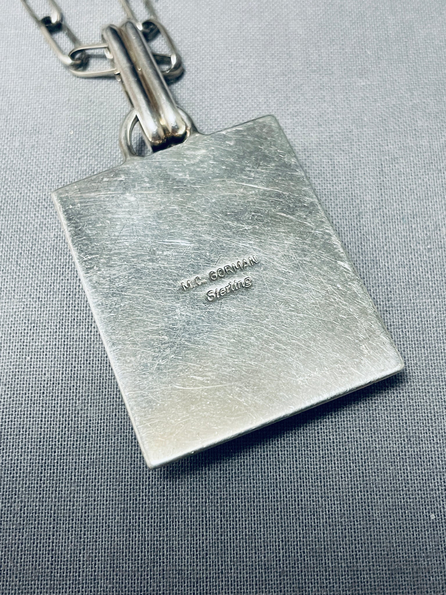This is a striking Navajo large single stone silver pendant necklace. This necklace contains a large very thick rectangular shaped turquoise silver pendant that measures a whopping 2-1/2" X 1-1/4" including the large silver bail. Located in the center of the large thick sturdy silver pendant is a beautiful rectangular shaped marvelous tight spiderweb matrix turquoise stone. The stone appears to be from the rare Blue Creek Nevada turquoise mine and is wonderfully placed in a shadowbox setting. This necklace contains a stunning handmade silver link chain with a traditional silver clasp. Sterling silver, marked. Cir. 1970's+. Signed by Navajo artist, MC Gorman. The length of the necklace measures around 28". Sturdy 37 grams.