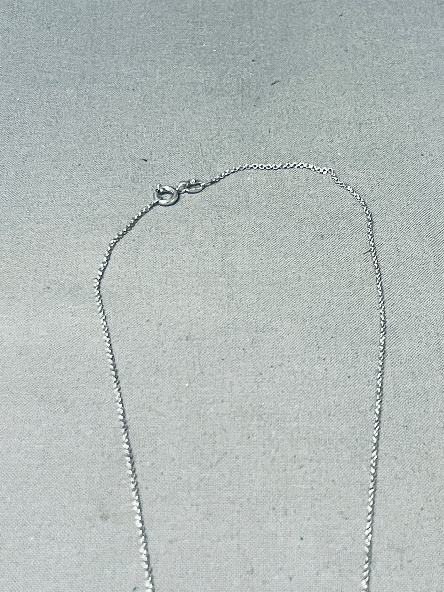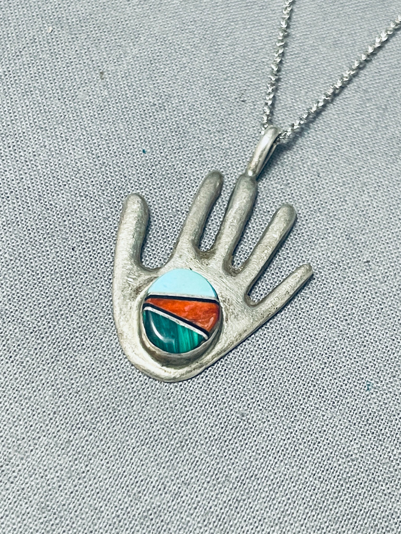 This is an exceptional vintage Navajo silver necklace. This 1-1/2" x 7/8" hand pendant has an impressive region of inlay stones that include turquoise and coral! It has a loop with a 1/8" bail opening but does come with this pretty 18" silver chain! Sterling silver, marked. Signed by Navajo artist, M. Sturdy 4 grams.