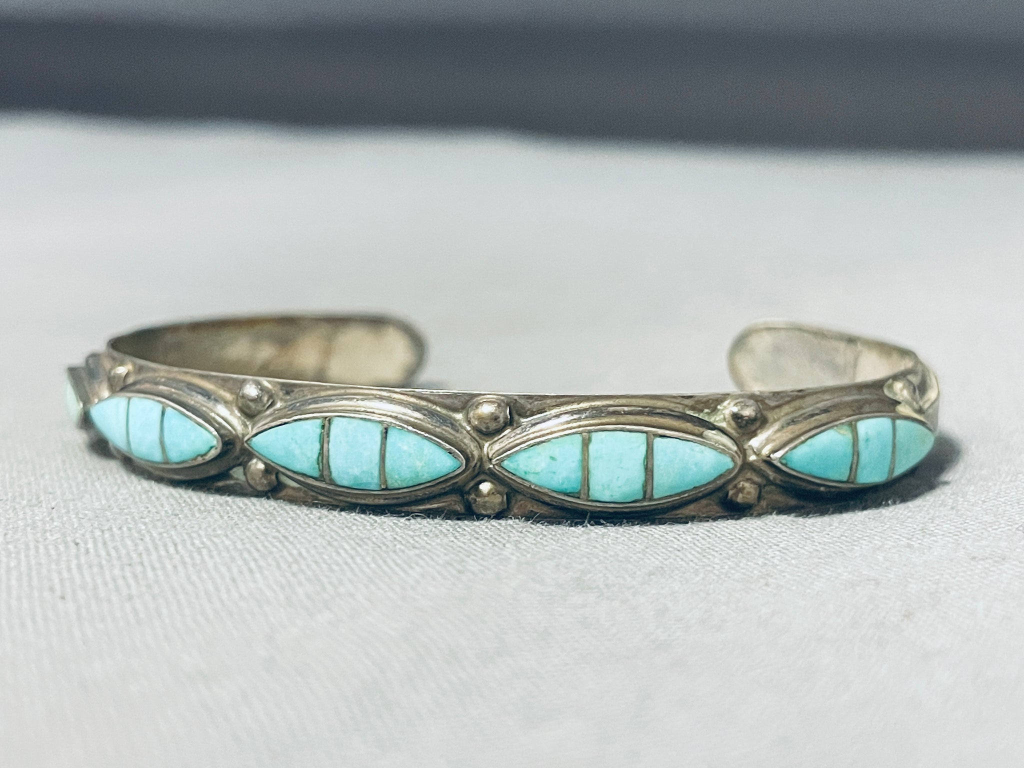 We are proud to offer this fascinating vintage Zuni silver bracelet. What a pretty bracelet! Five torpedos of inlay turquoise are horizontally set across the face of the bracelet, separated with dual silver beads and then met with a silver applique arrow at each side! The width of the bracelet measures around 1/4". Sterling silver. The inside end to end measures around 5-1/2" with an additional 1-1/8" gap. Sturdy 12 grams. Cir Mid Century