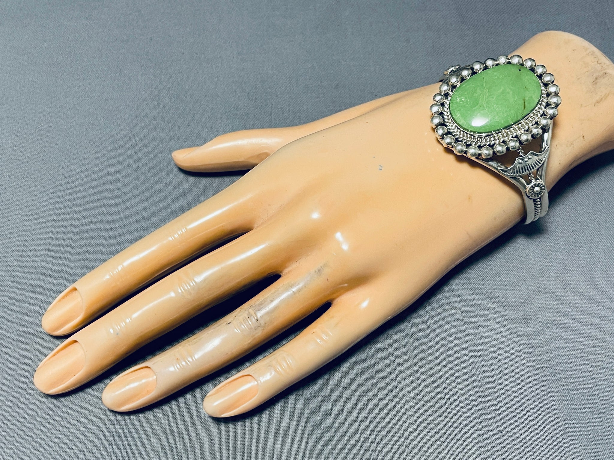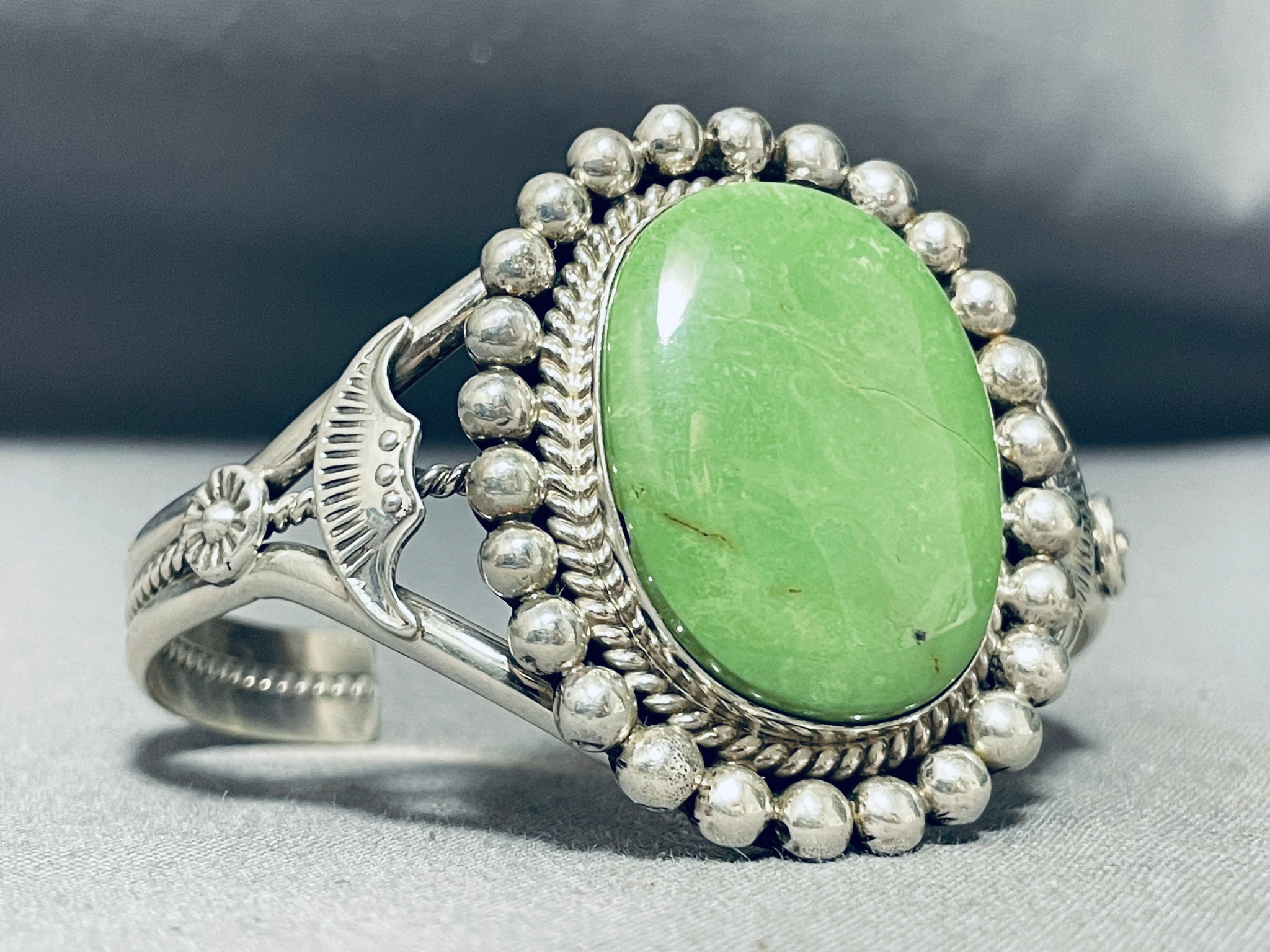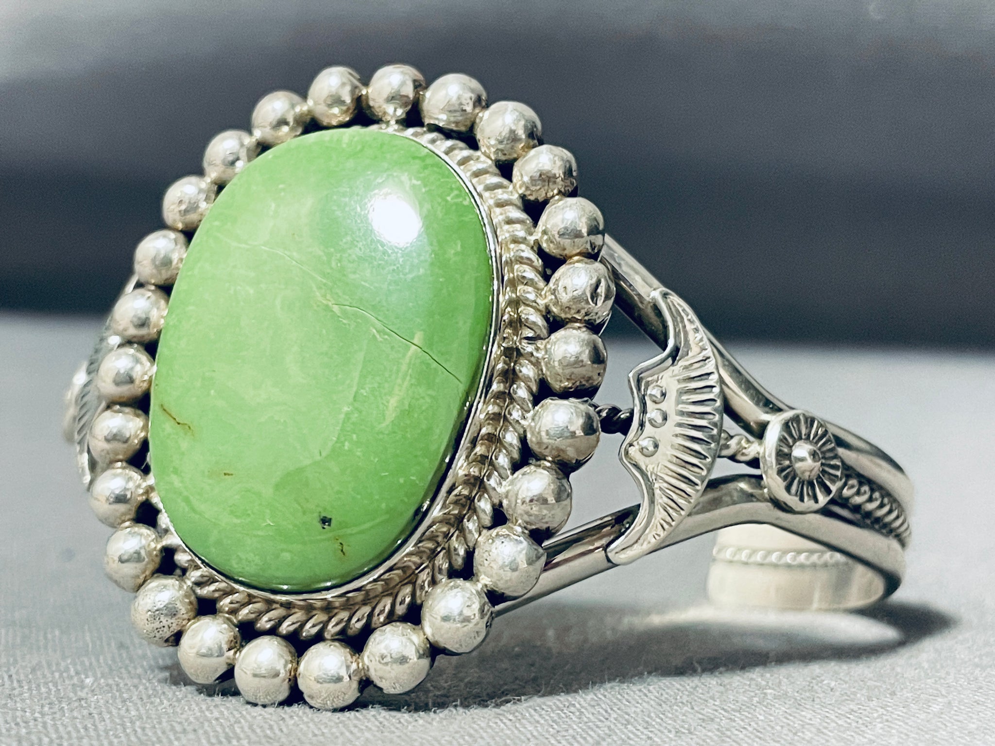 Very Detailed Work Native American Navajo Gaspeite Sterling Silver Signed Bracelet
