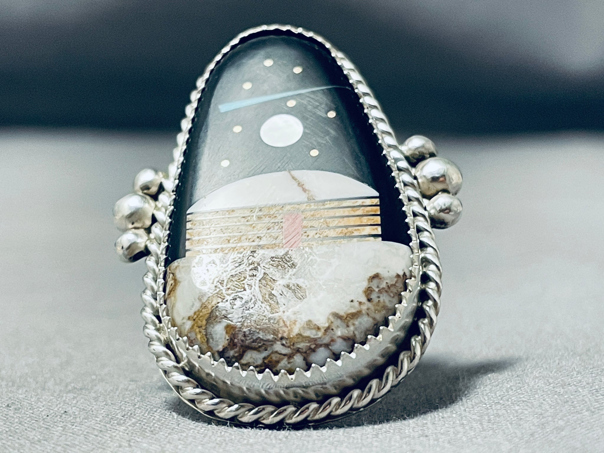 This is an incredible Navajo very intricately inlaid silver ring. This ring contains a beautiful hand inlaid native scenery that includes a hogan with a night sky background, snow on the ground and a shooting star with a full moon. The inlay of this ring consists of White Buffalo turquoise, onyx, mother of pearl, coral and tan shell. Bordering the fat teardrop shaped inlaid face of the ring is a thick silver rope with accenting silver raindrops. The ring contains a sturdy double silver shank. The ring face measures around 1-5/8" x 1-1/4". Signed by Navajo artist, Cal Desson. The ring size is around 8. Sterling silver, marked. Sturdy 15 grams.