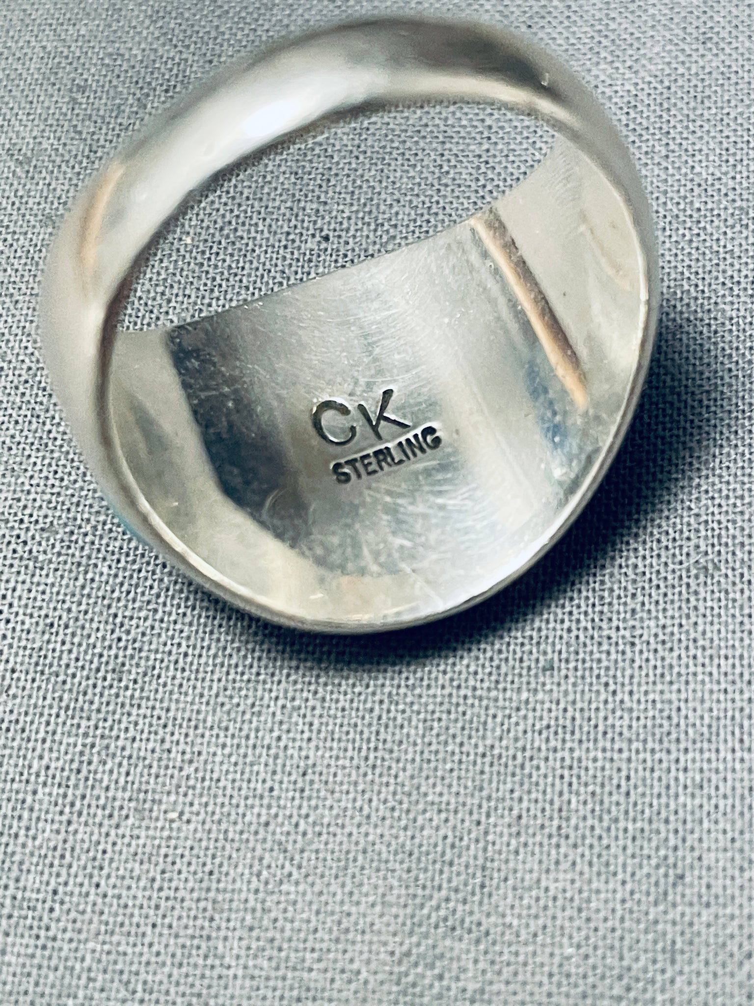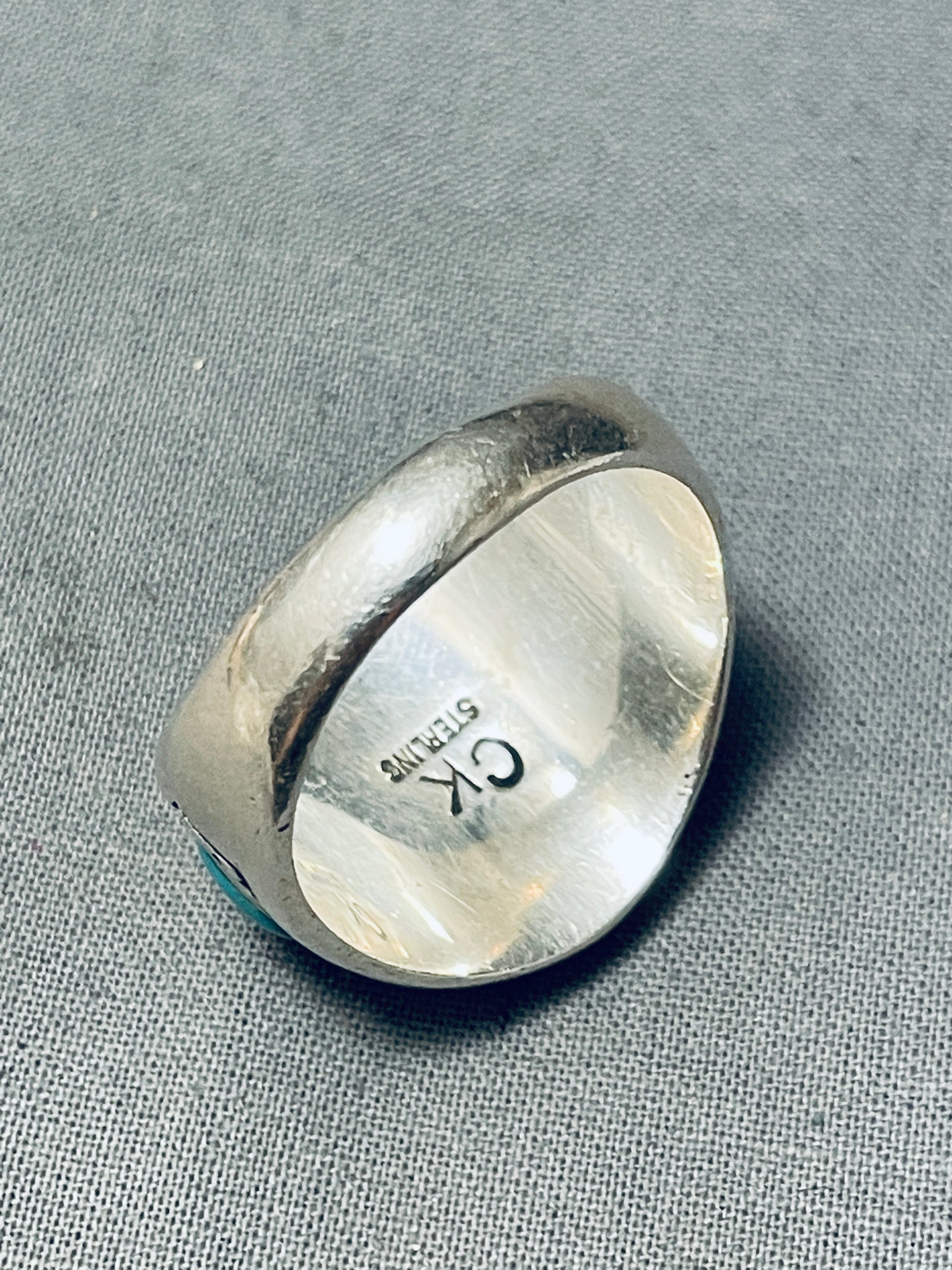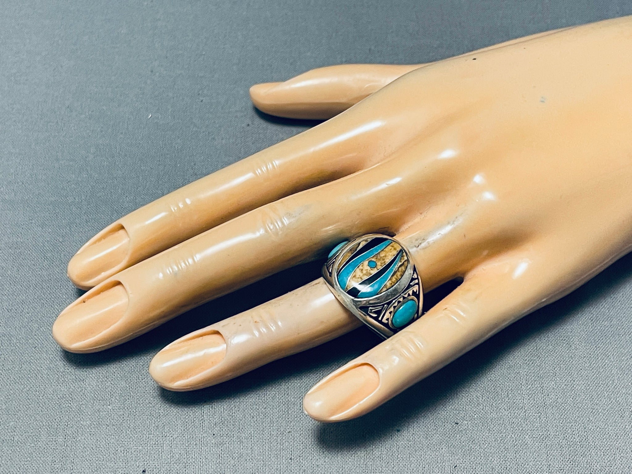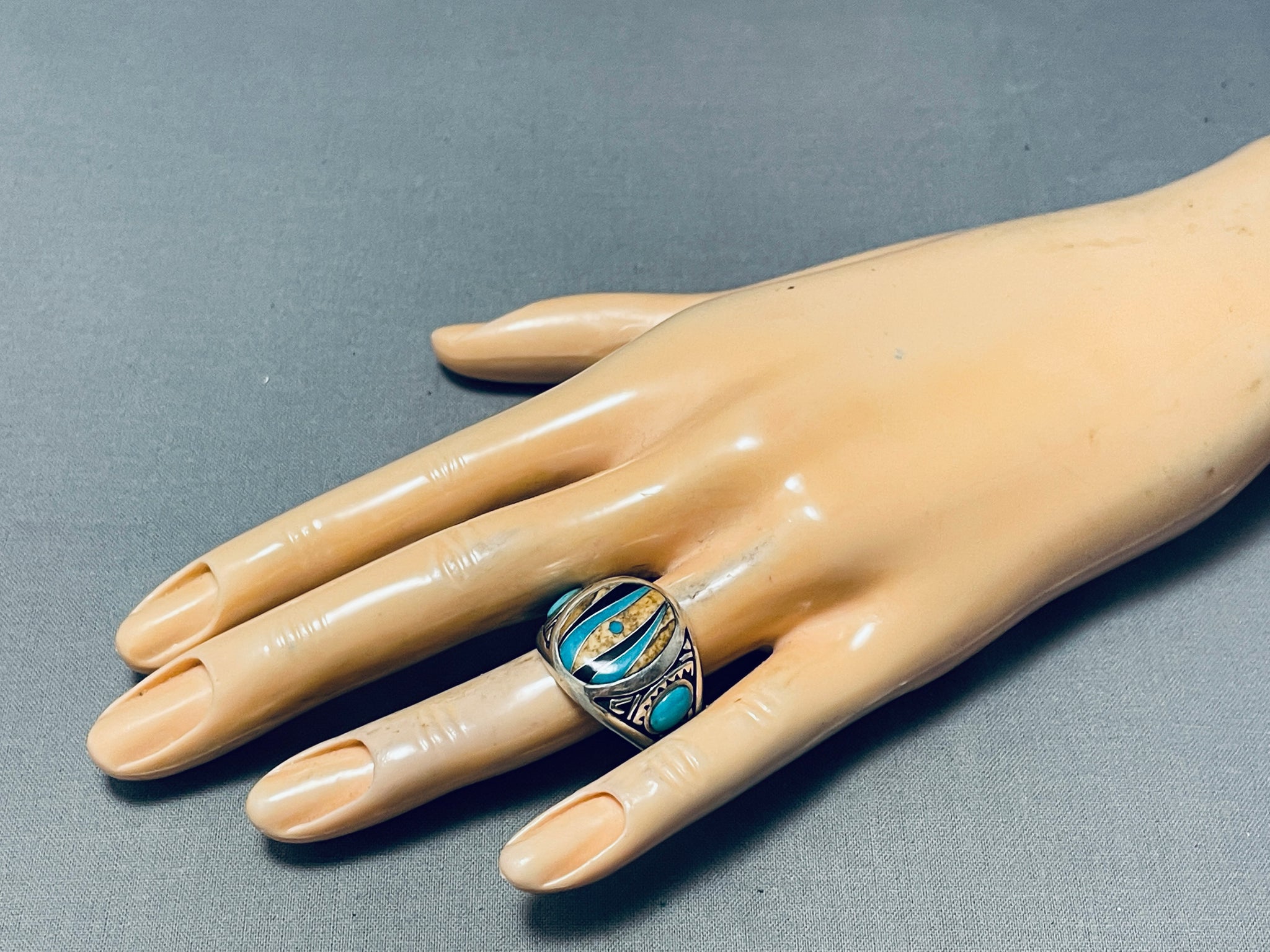 This is a fascinating Southwestern inlaid silver mens ring. This wonderful ring contains a beautiful intricate inlaid center piece that consists of onyx, turquoise, and tan stones. Resting at the sides of the thick silver ring are wonderful turquoise stones with accenting stampings. The ring face measures around 3/4" x 7/8". Signed by artist, CK. The ring size is around 12.5. Cir. 1980's+. Sterling silver, marked. Sturdy 11 grams.