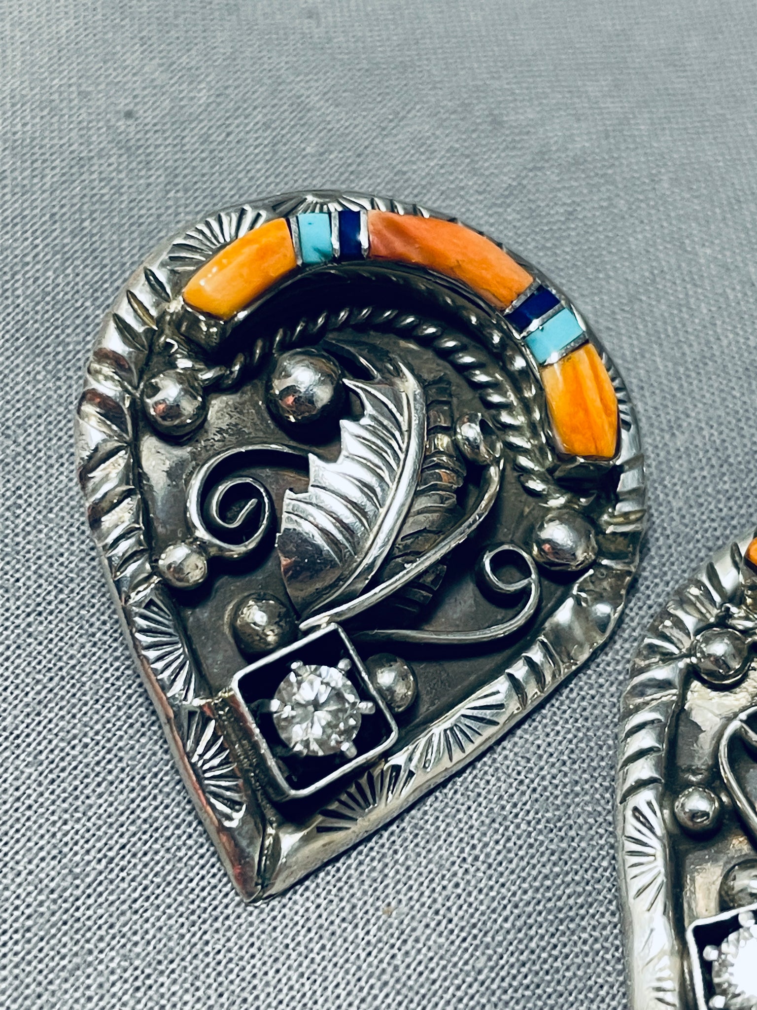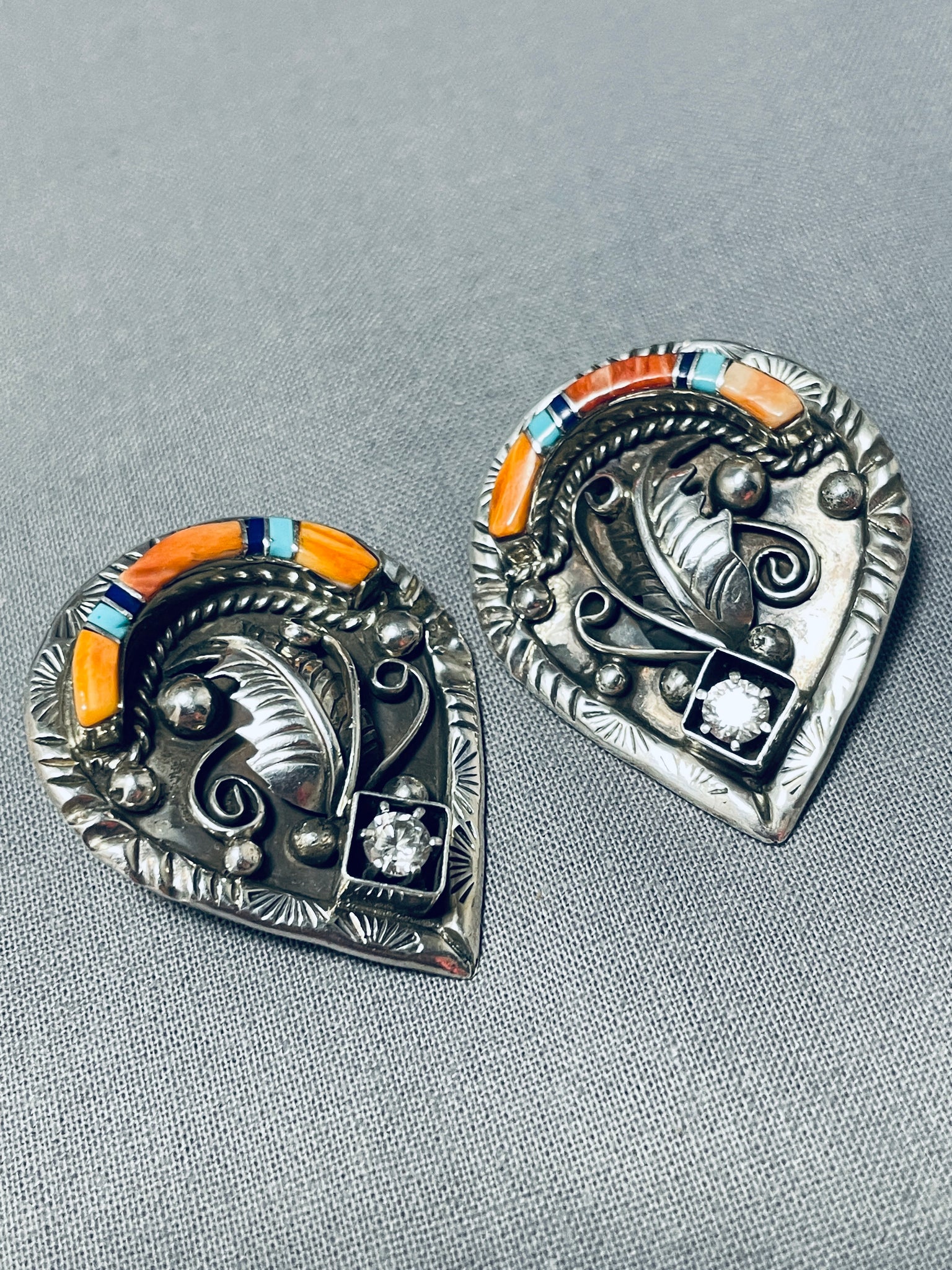 Very Intricate Vintage Native American Navajo Turquoise Sterling Silver Leaf Earrings