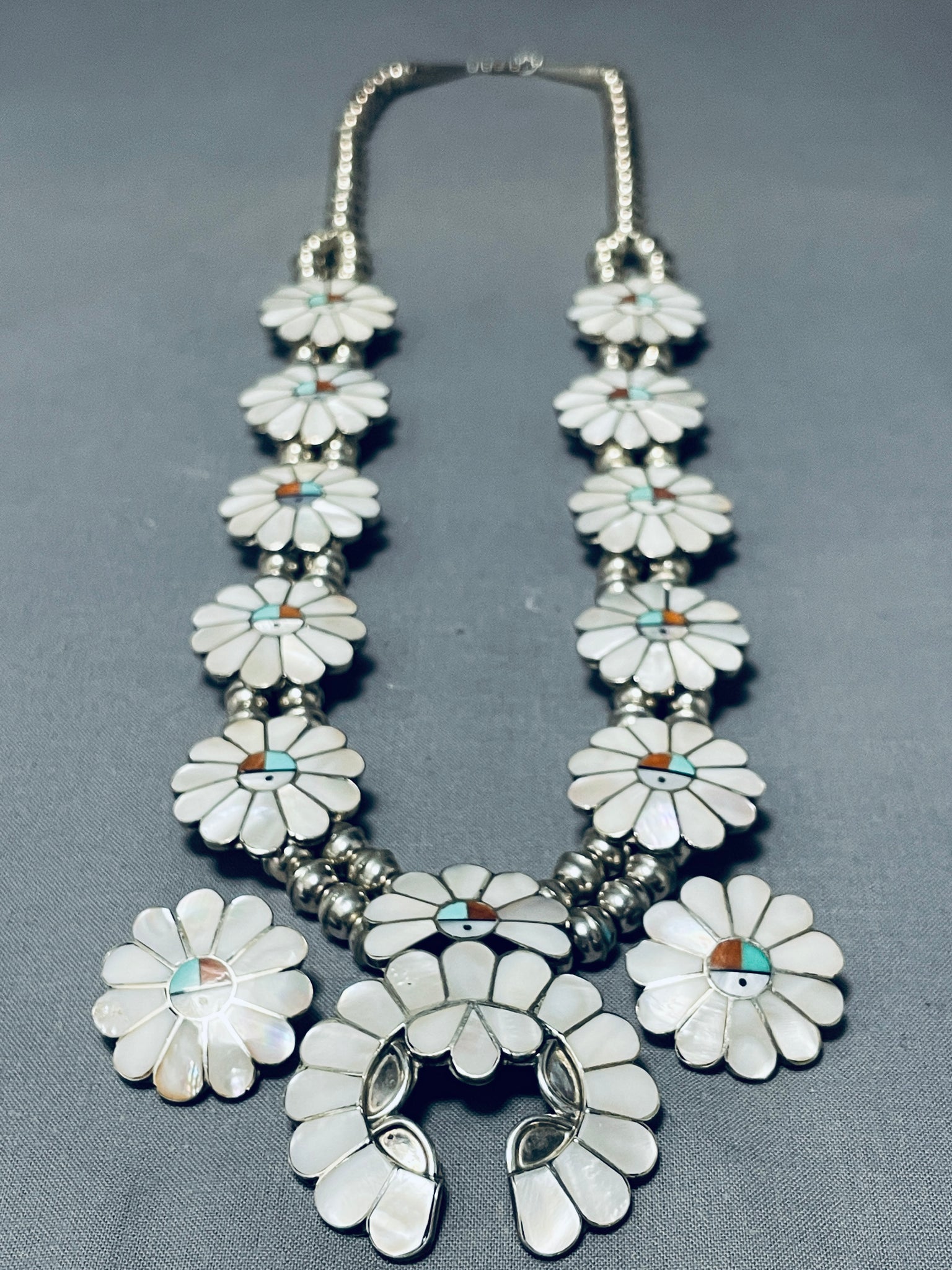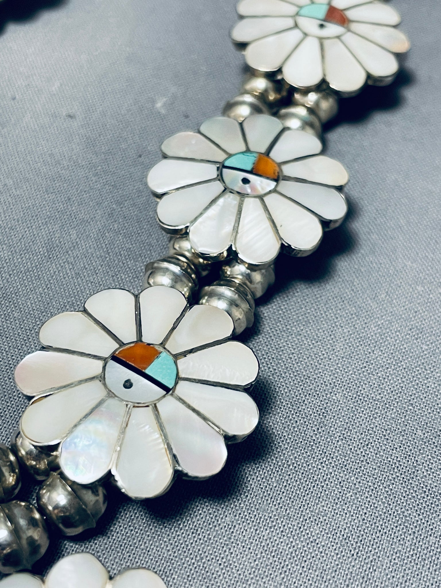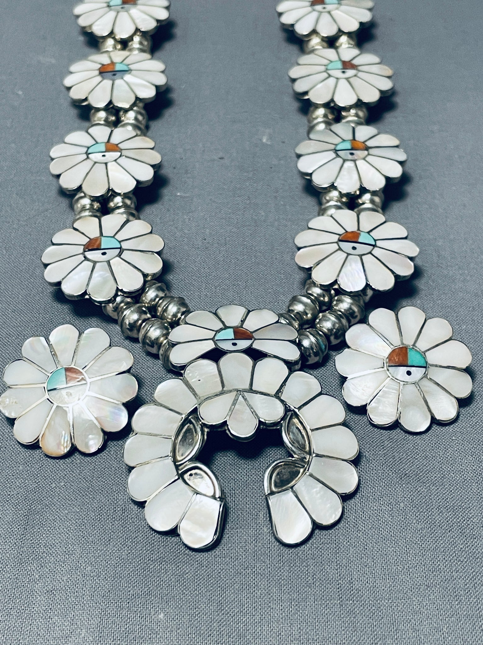 Very Intricate Vintage Native American Zuni Turquoise Sterling Silver Squash Blossom Necklace