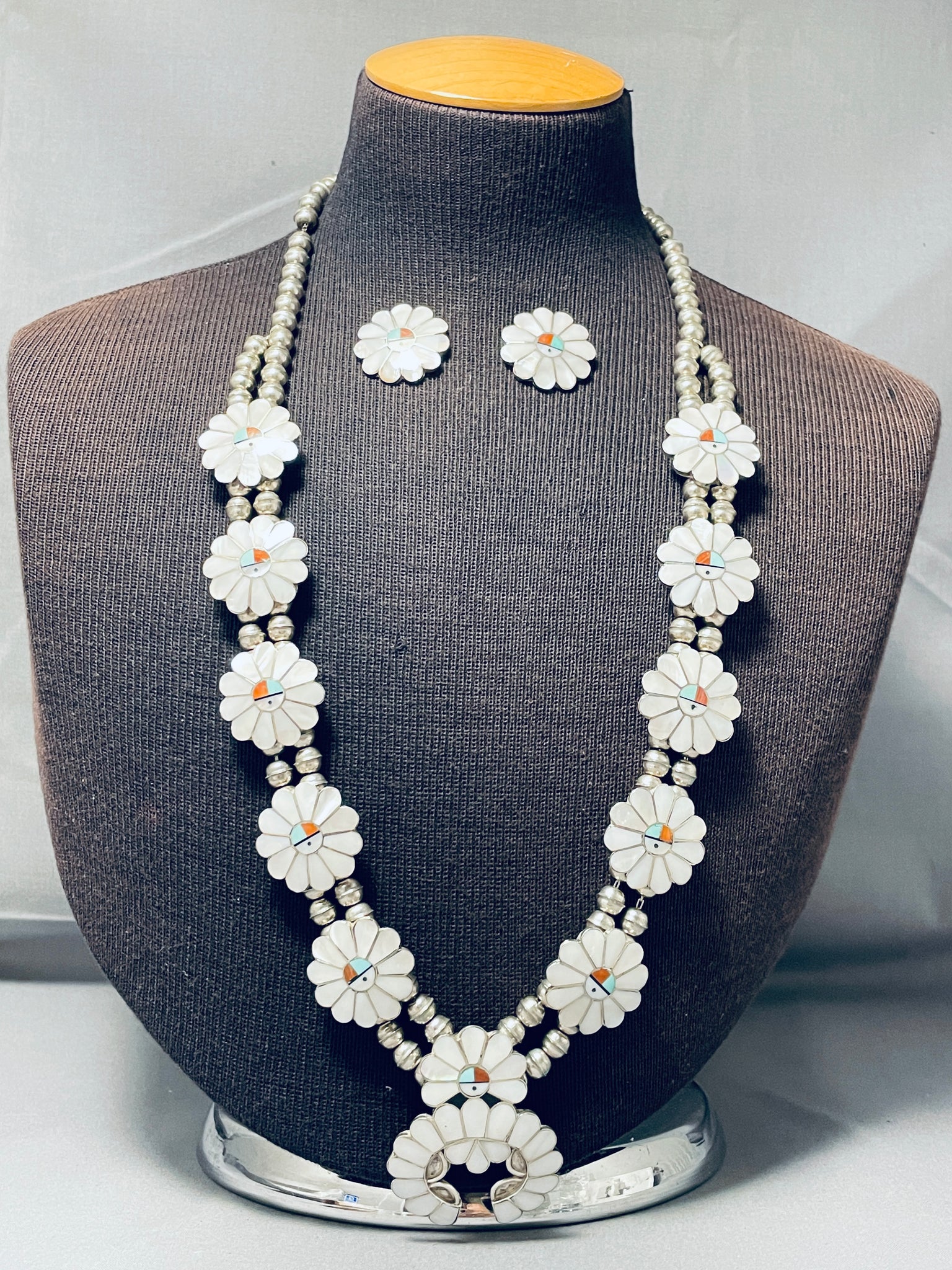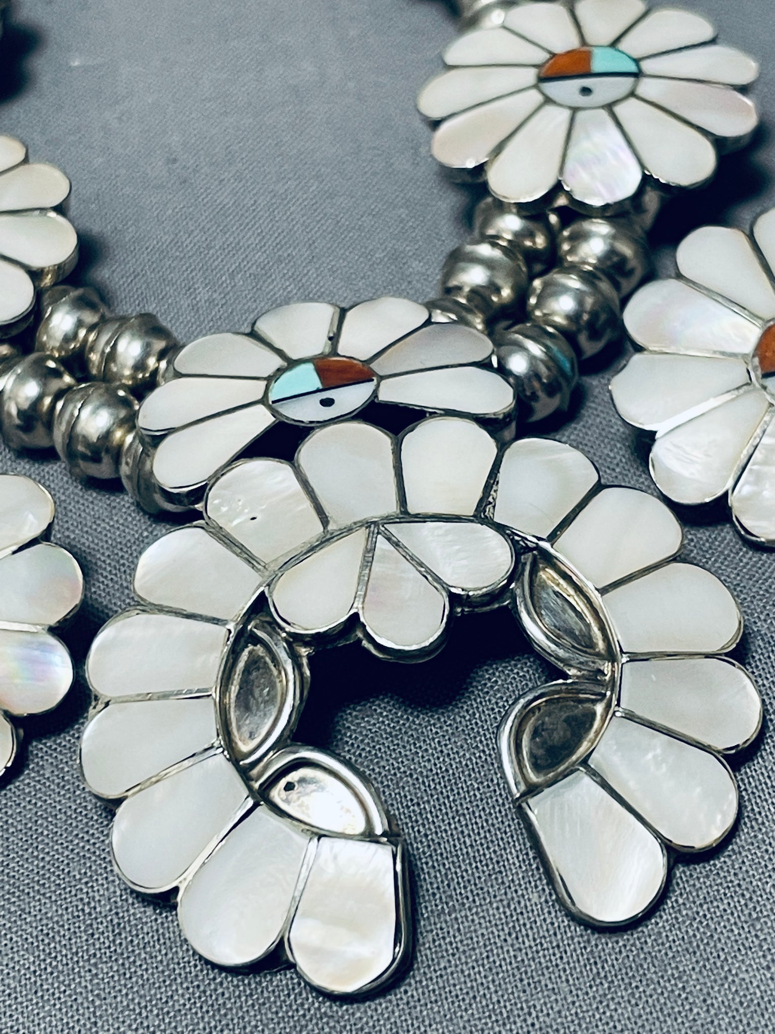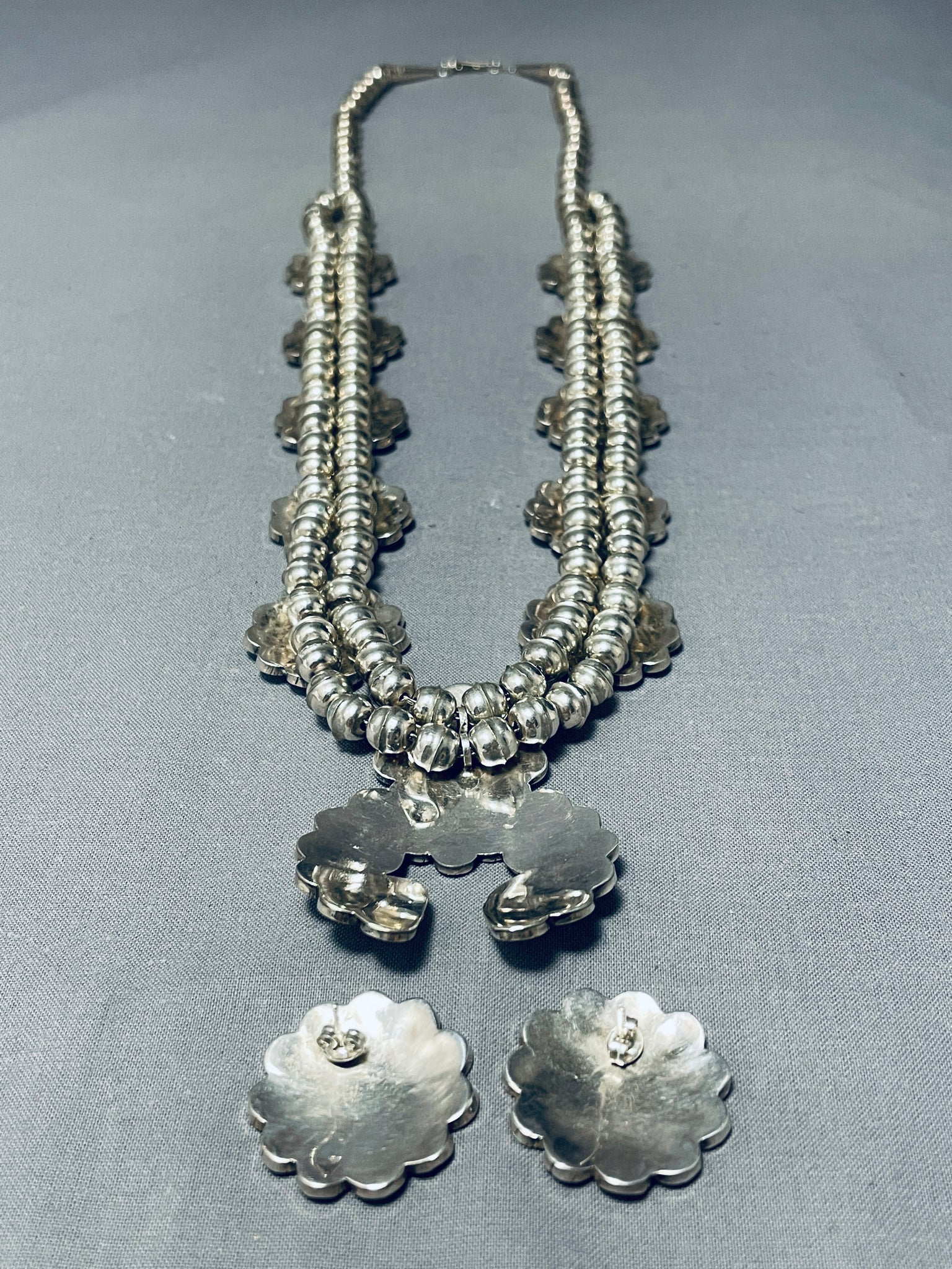 Very Intricate Vintage Native American Zuni Turquoise Sterling Silver Squash Blossom Necklace