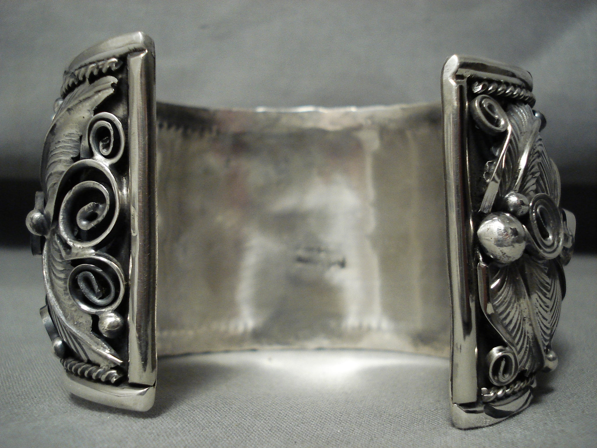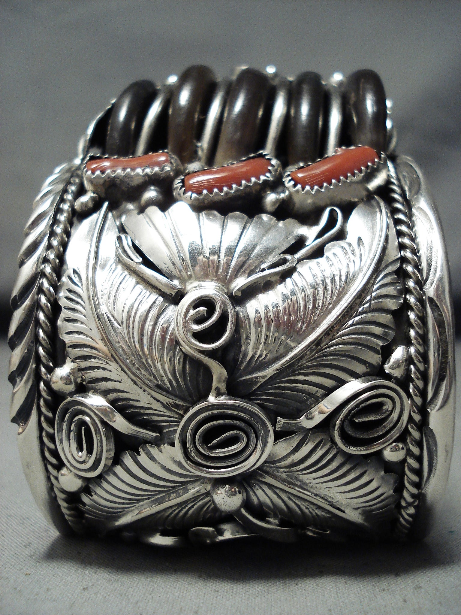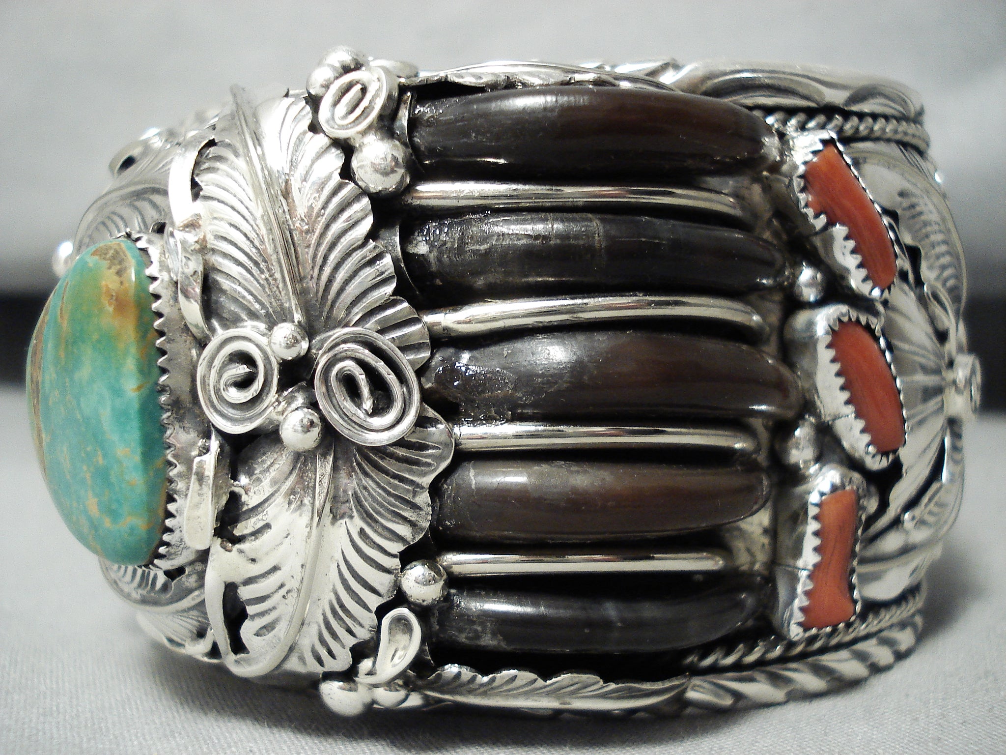 This is a tremendous vintage Navajo very large silver cuff bracelet consisting of impeccable turquoise, coral and silver works. This bracelet is an absolutely WOW bracelet as the detailing is just top notch. Located on one half of the cuff are two very large Royston turquoise stones and located on the other half of the cuff are three large chunky coral stones. Situated throughout the entire wide, thick and heavy cuff are impeccable and intricate silver works that consist of large hand carved leaves, swirling stems, fans and raindrops. Bordering the cuff are superior deep wave patterns with accenting silver ropes that run from one end to the other. The largest stone measures around 1" x 7/8". The width of the bracelet measures around 2". Signed by Navajo artist, Mike Thomas . Sterling silver, marked. Cir. 1970's+. The inside end to end measures around 6-3/4" with an additional 1-1/2" gap. Sturdy 160 grams.