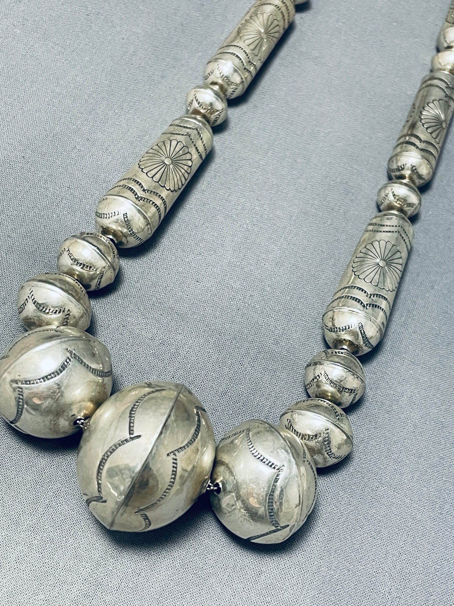 This is a superlative Navajo all silver bead necklace. This remarkable necklace contains a beautful plethora of mind blowing graduating all silver beads with the largest round silver bead measuring around 1-1/4" in diameter. Located on the beautiful long tubule shaped shaped silver beads are remarkable flower and sun stampings and the largest tubule bead measures around 1-3/4" X 1/2". I absolutely love the detailing and beauty of this necklace. Sterling silver. Cir. 1970's+. The length of the necklace measures around 27". Sturdy 88 grams.