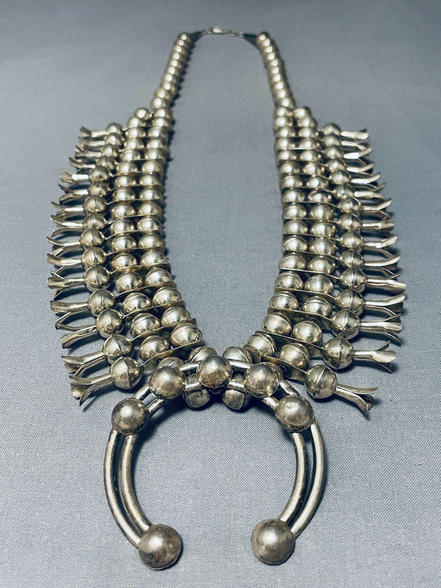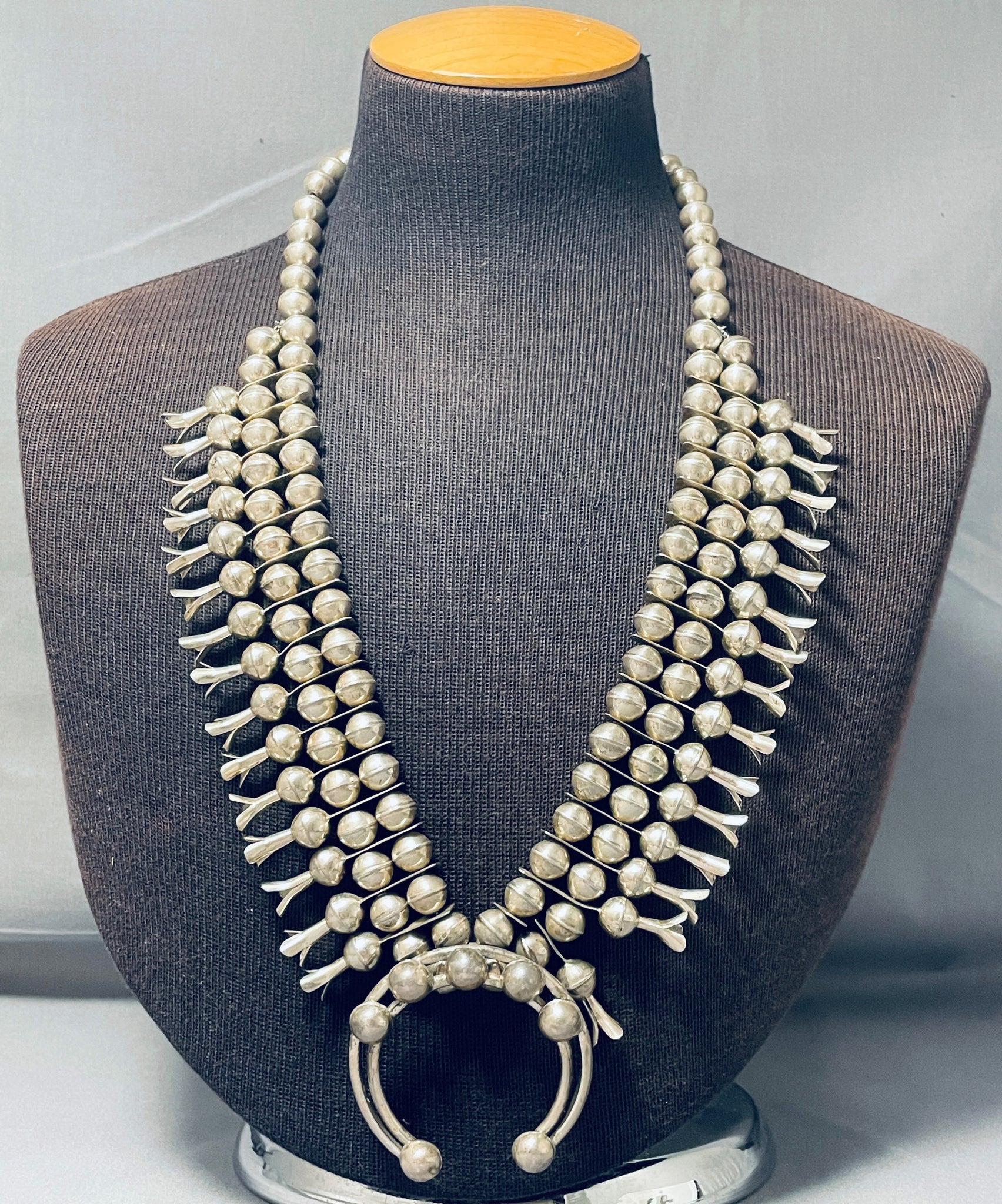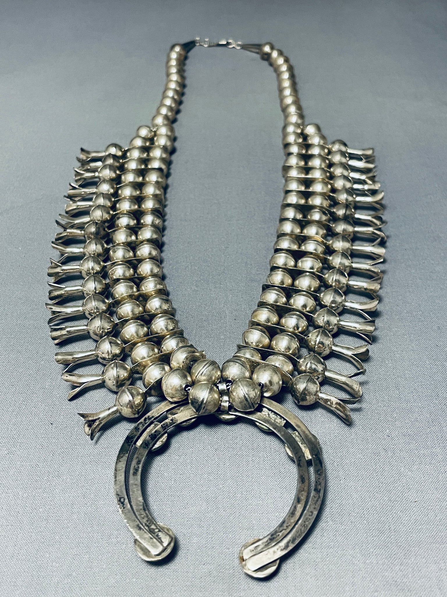 Very Rare Tripe Bead Row Vintage Native American Navajo Sterling Silver Squash Blossom Necklace