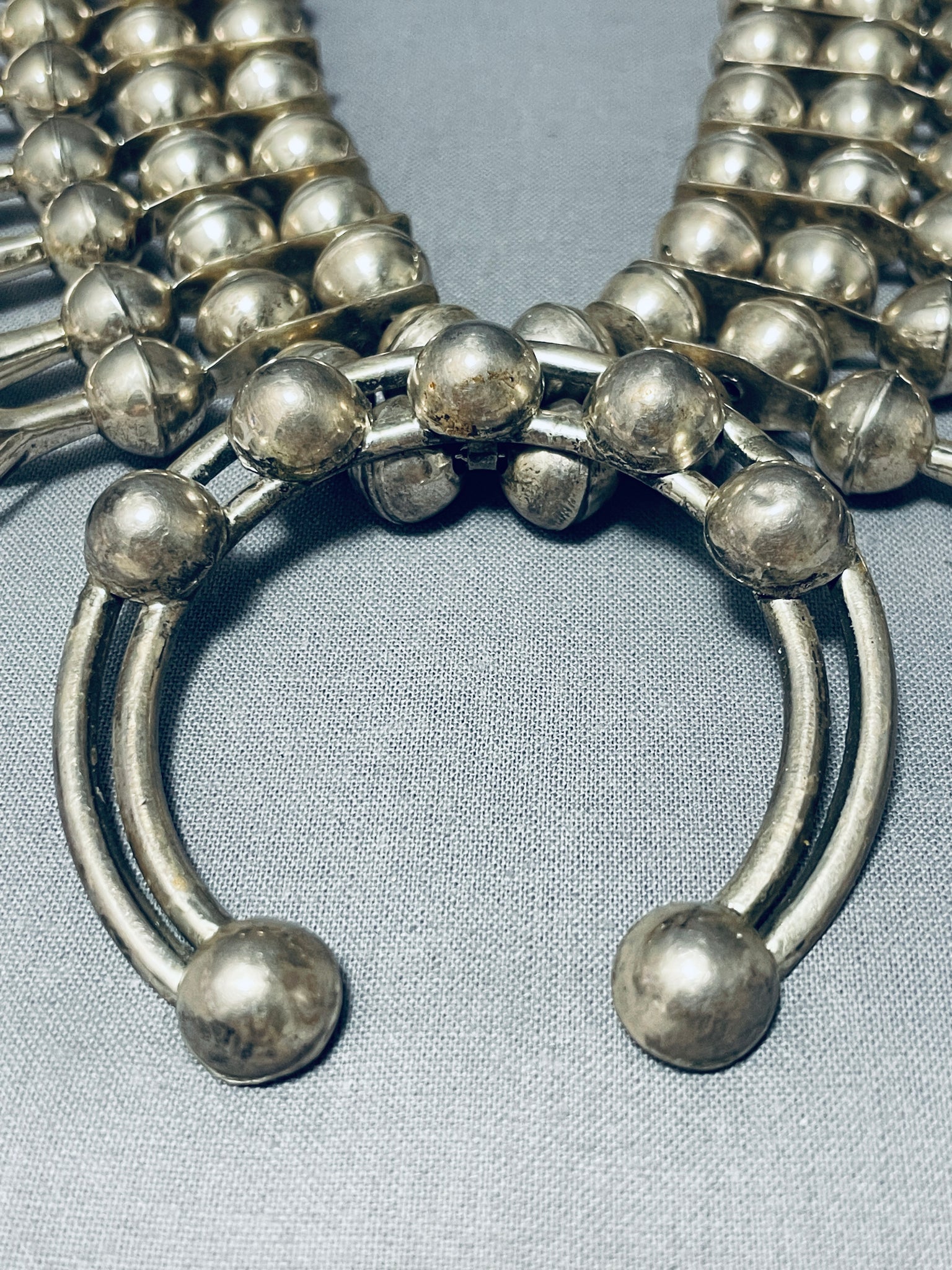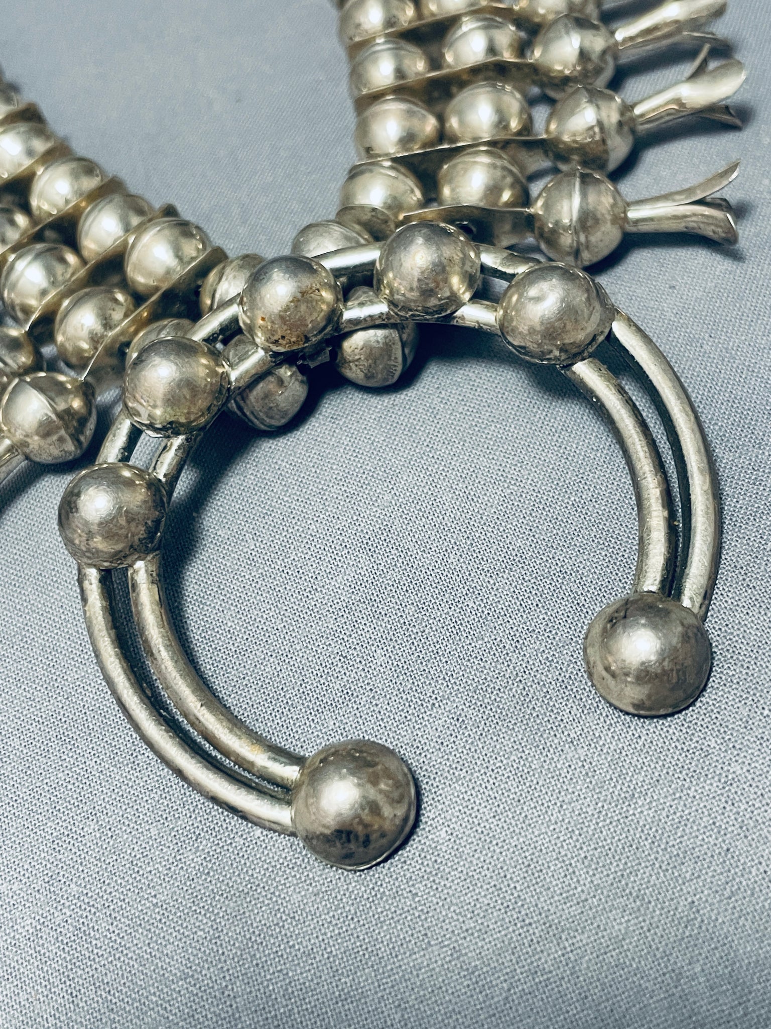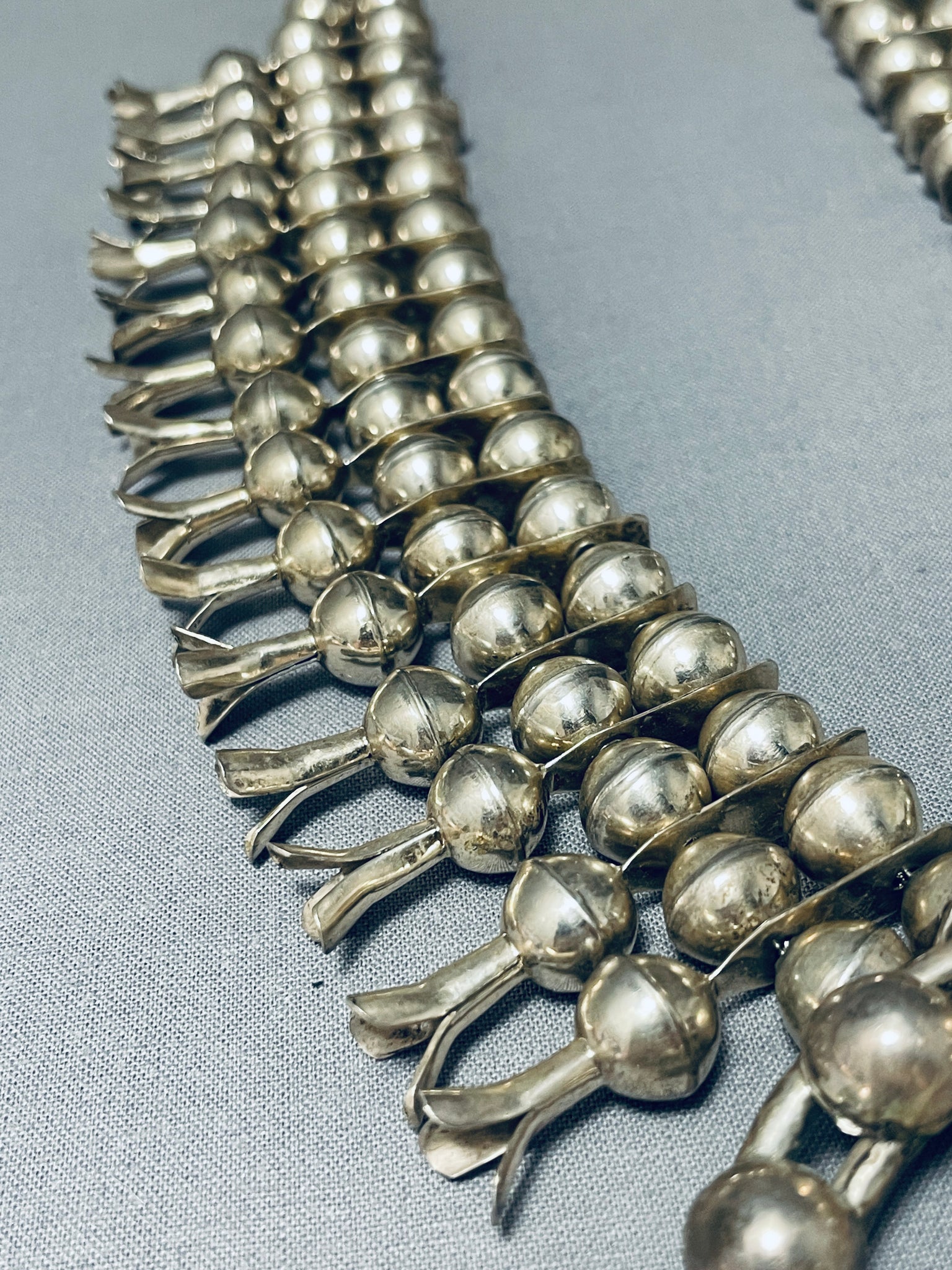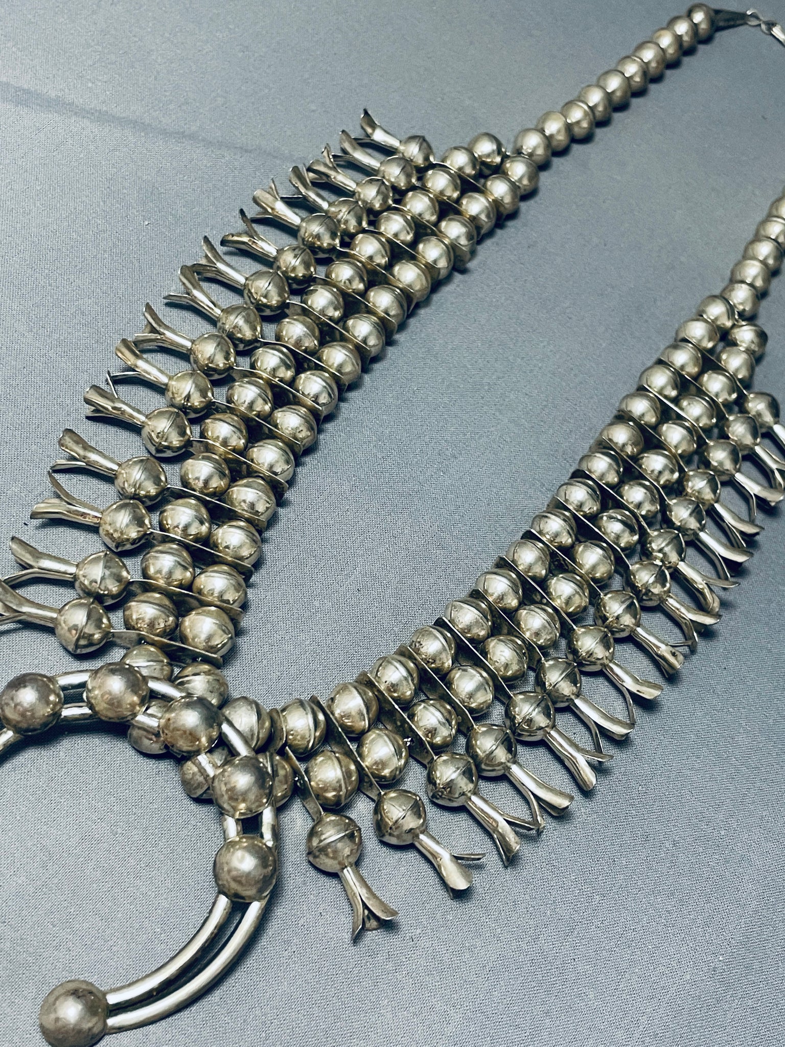 Very Rare Tripe Bead Row Vintage Native American Navajo Sterling Silver Squash Blossom Necklace