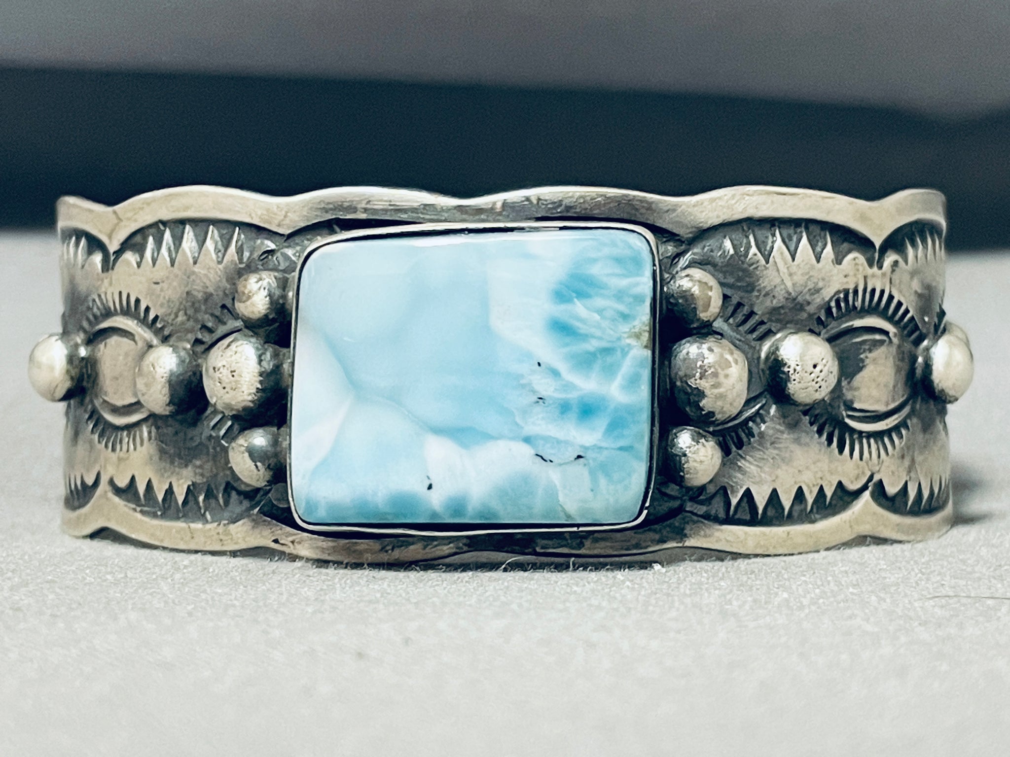 We are proud to offer this breathtaking vintage Navajo silver bracelet. This is such a fantastic bracelet! The huge square-cut Larimar stone is absolutely breathtaking! The cuff has scalloped edging, with handstamped designs and large silver beads decorating all around! Fabulous! The center stone measures around 7/8" x 3/4". The width of the bracelet measures around 7/8". Sterling silver. The inside end to end measures around 5-7/8" with an additional 1" gap. Sturdy 54 grams.