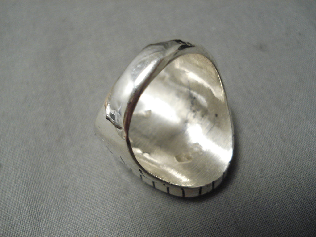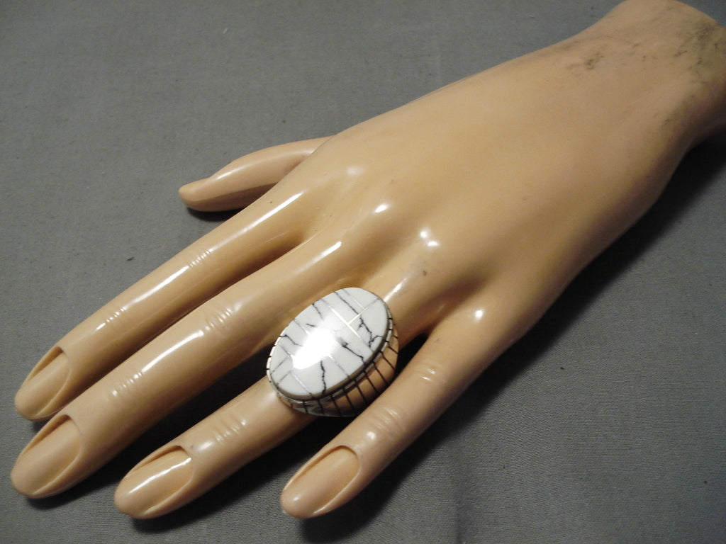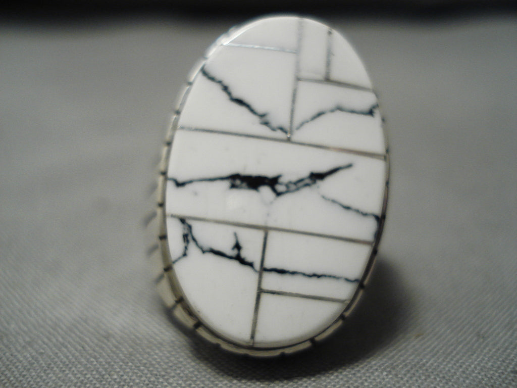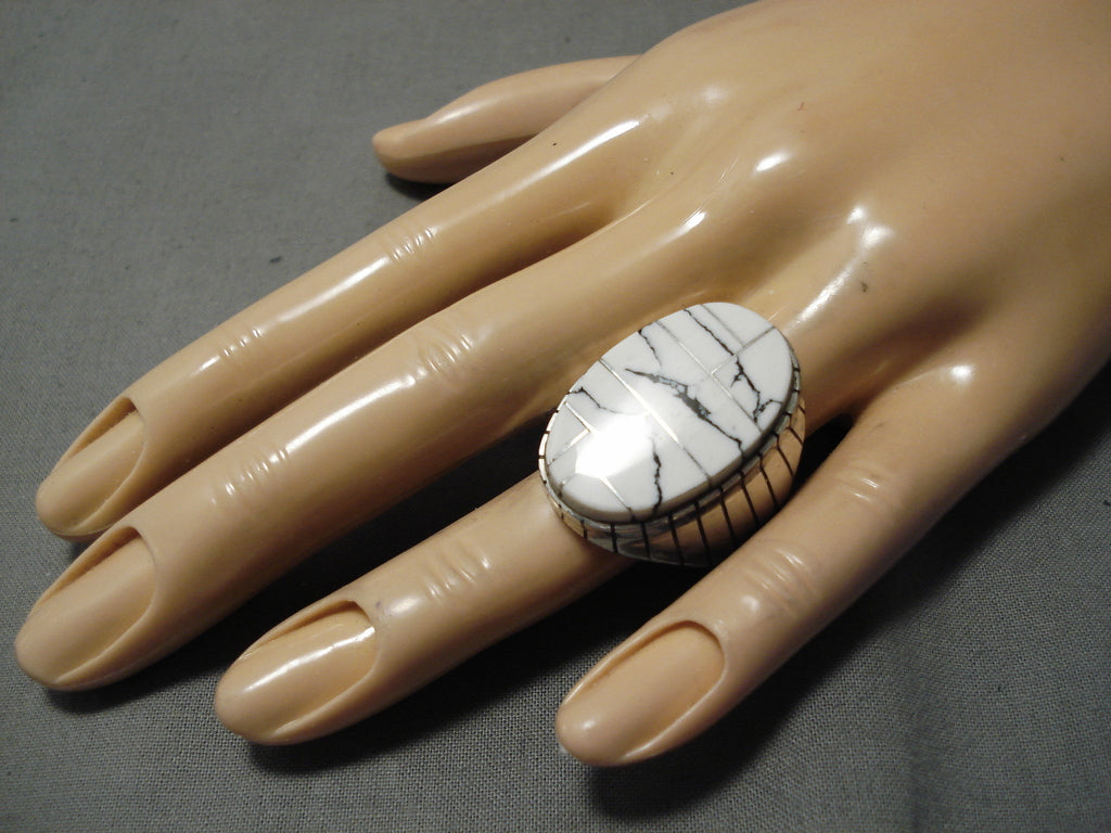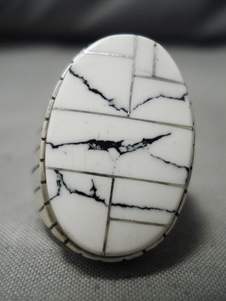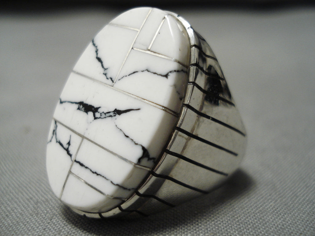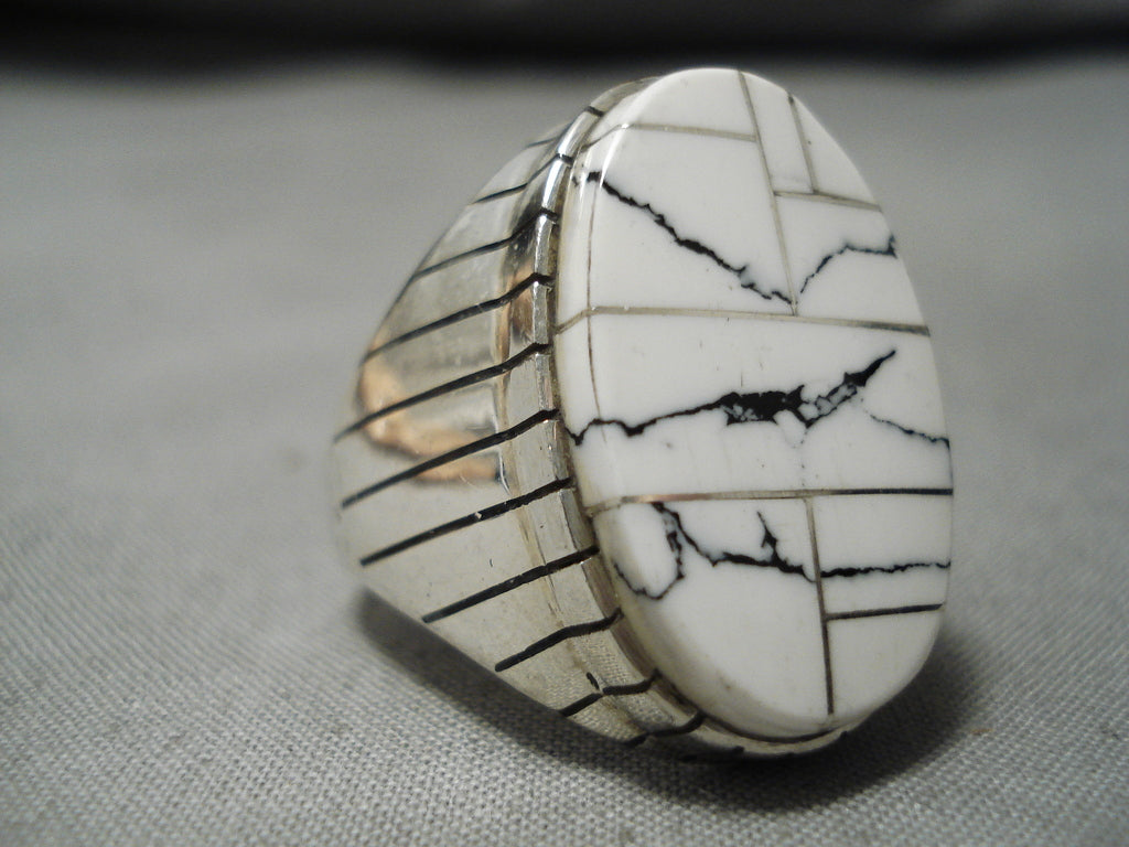This is an incredible modern Navajo silver ring. The marvelous picket fence frame of the huge spectacular oval inlay white buffalo turquoise face of this thick, heavy ring continues down the sides of its wide band as it gently tapers to ¼” wide at the back. The ring face measures around 1-1/8" x 7/8". Signed by Navajo artist, Ray Jack. The ring size is around 11-1/2. Sterling silver. Sturdy 20 grams.