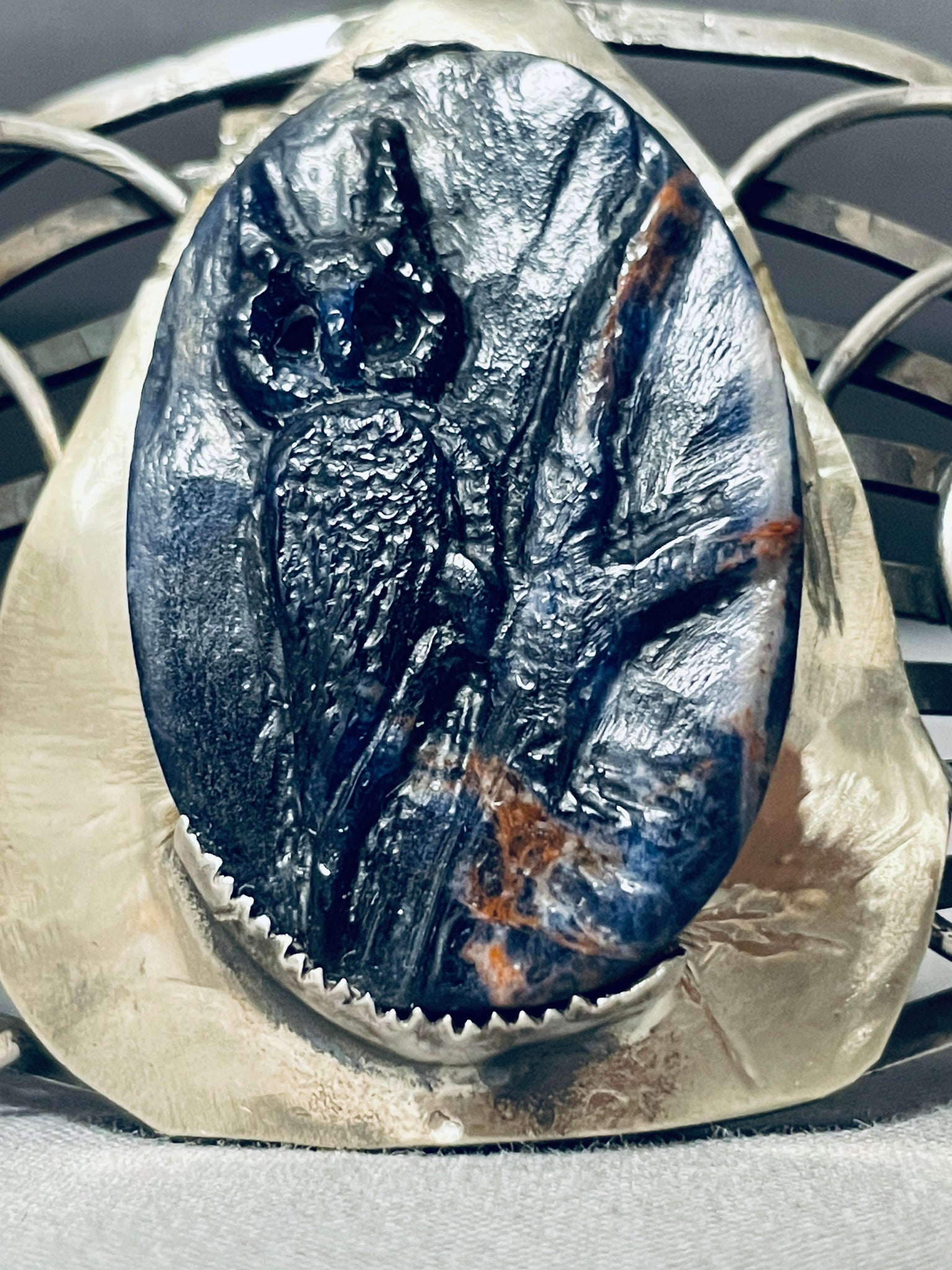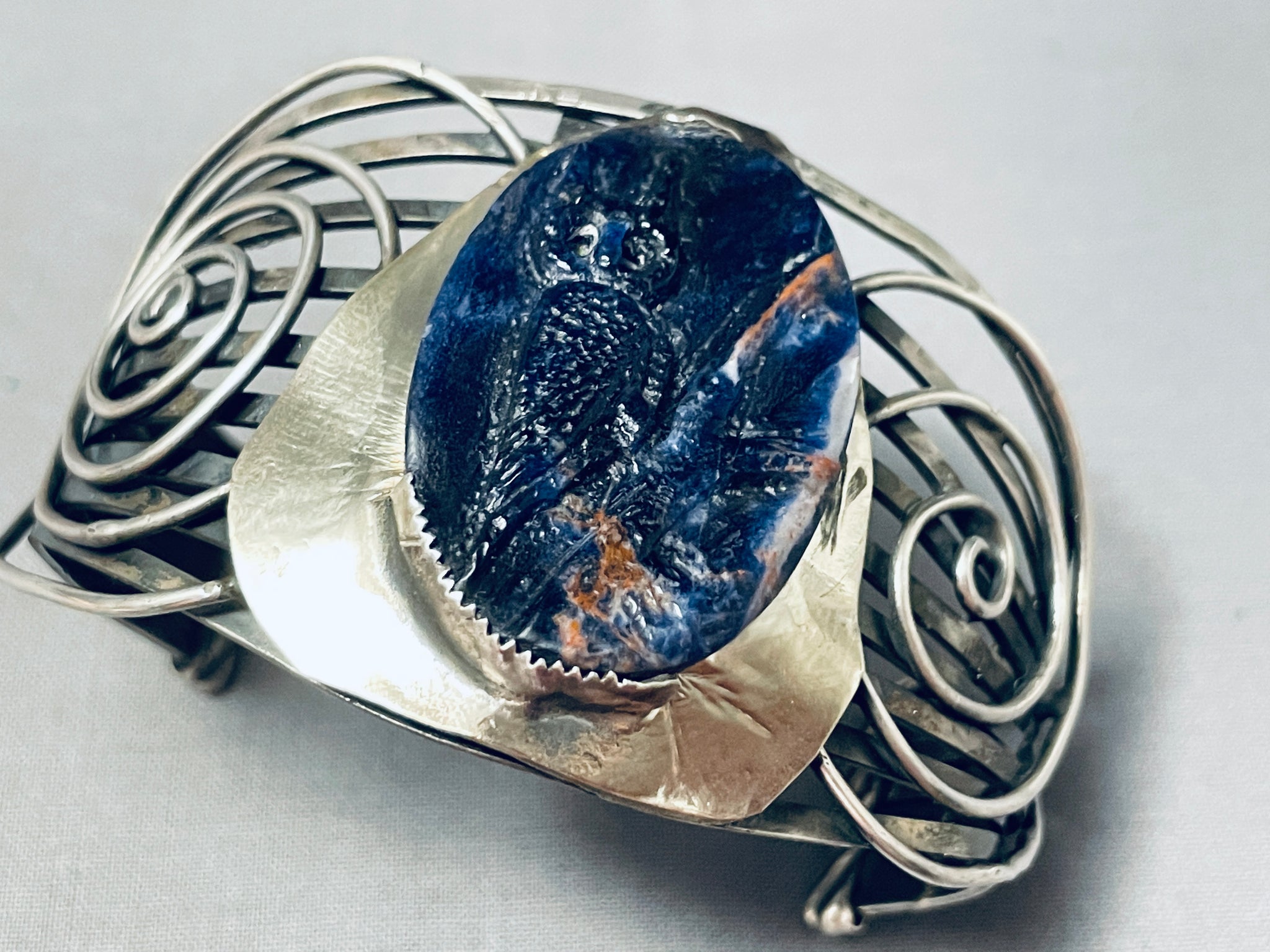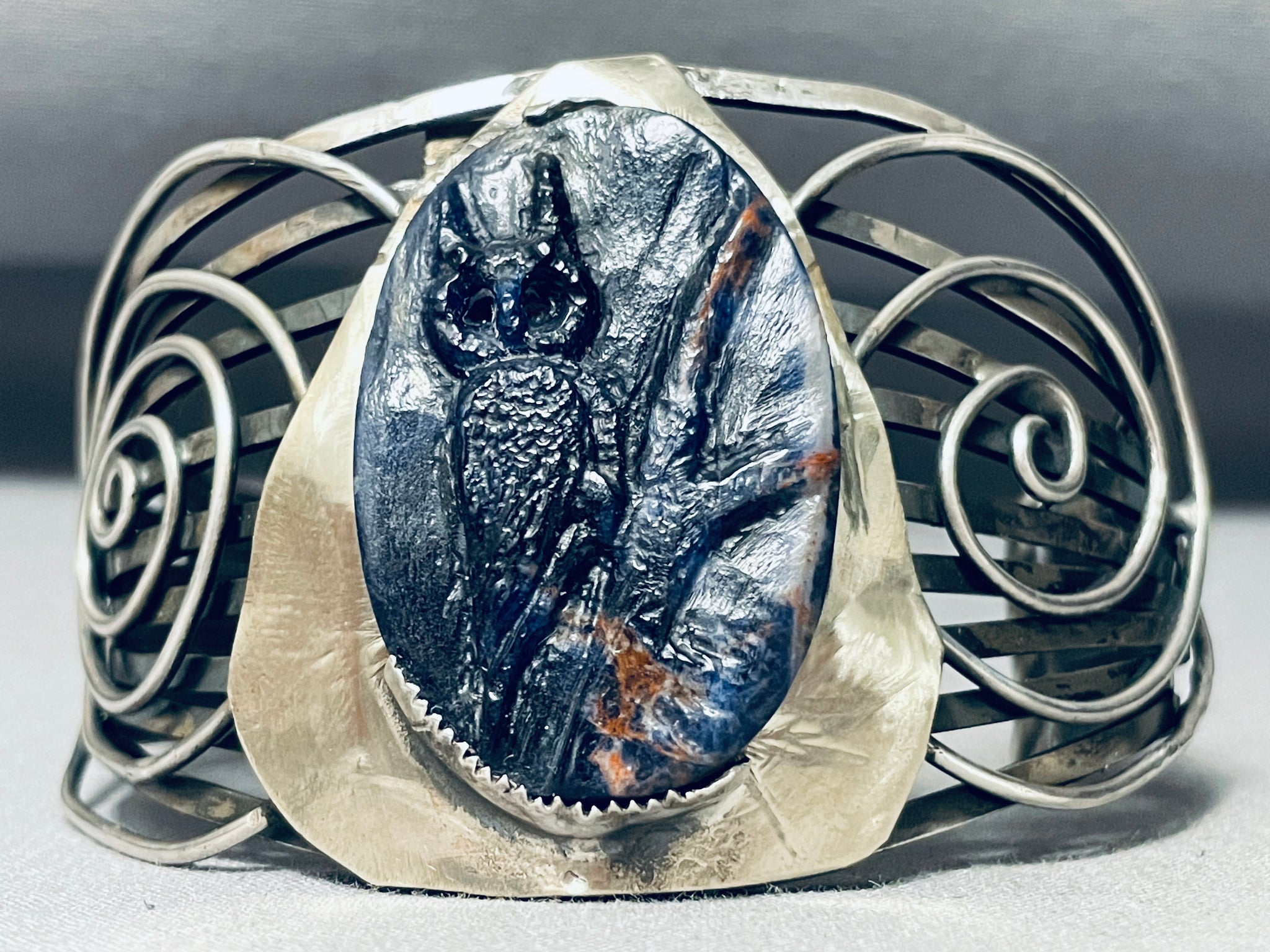 This is a magnificent vintage Southwestern single hand carved stone silver bracelet. Located in the center of this marvelous bracelet is a phenomenal very detailed hand carved single purple lolite stone. The carved stone consists of a remarkable detailed owl resting on a branch. The stone is beautifully placed on an amazing egg shaped silver plate. Resting at the sides of the cuff are large swirling stem silver flanks. The size of those swirled flanks is just spectacular. This bracelet contains a fascinating 9, yes 9, sturdy silver shank cuff. Such a remarkable bracelet. The center stone measures around 1-1/2" x 1". The width of the bracelet measures around 1-7/8". Sterling silver. Cir. 1970's+. The inside end to end measures around 5-1/2" with an additional 2" gap. Sturdy 58 grams.