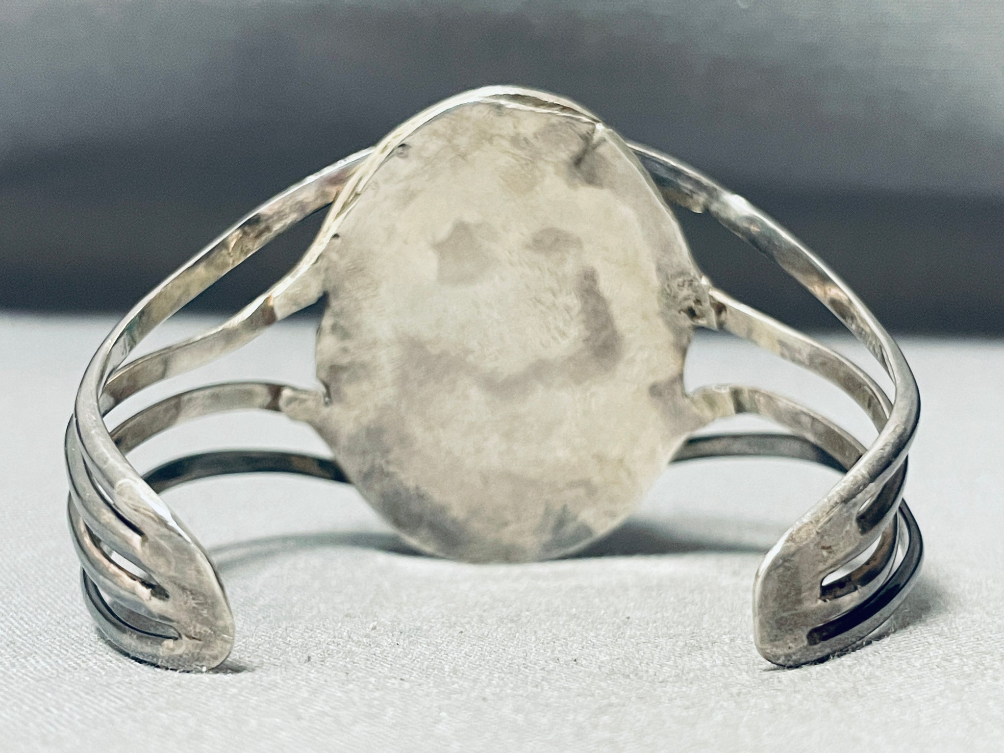 This is a superlative vintage Navajo large single stone silver bracelet. This amazing bracelet contains a large center chunky green to blue colored turquoise stone. The stone is beautifully placed on a egg shaped silver section with the amazing unique placed quadruple silver shank cuff running around the stone. The intricacy of the quadruple silver shank cuff is just superb and so incredible. The center stone measures around 1" x 1". The width of the bracelet measures around 1-5/8". Sterling silver. Cir. Mid century . The inside end to end measures around 5" with an additional 1-1/4" gap. Sturdy 30 grams.