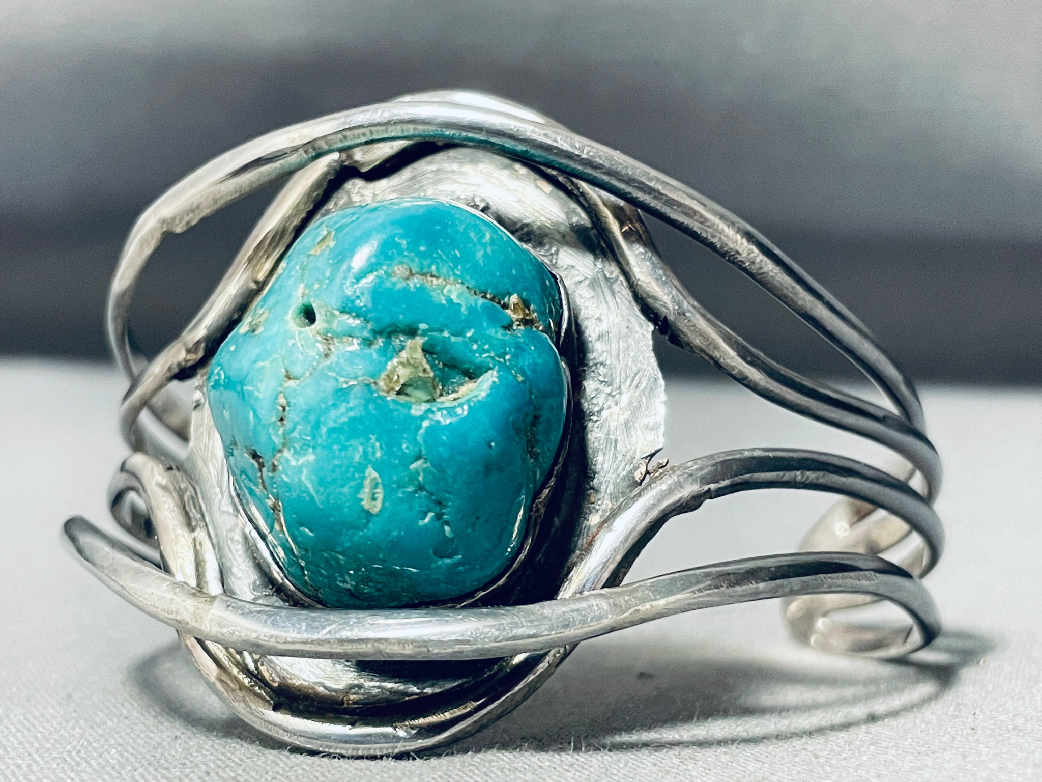 Very Unique Twisting Silver Vintage Native American Navajo Turquoise Sterling Bracelet