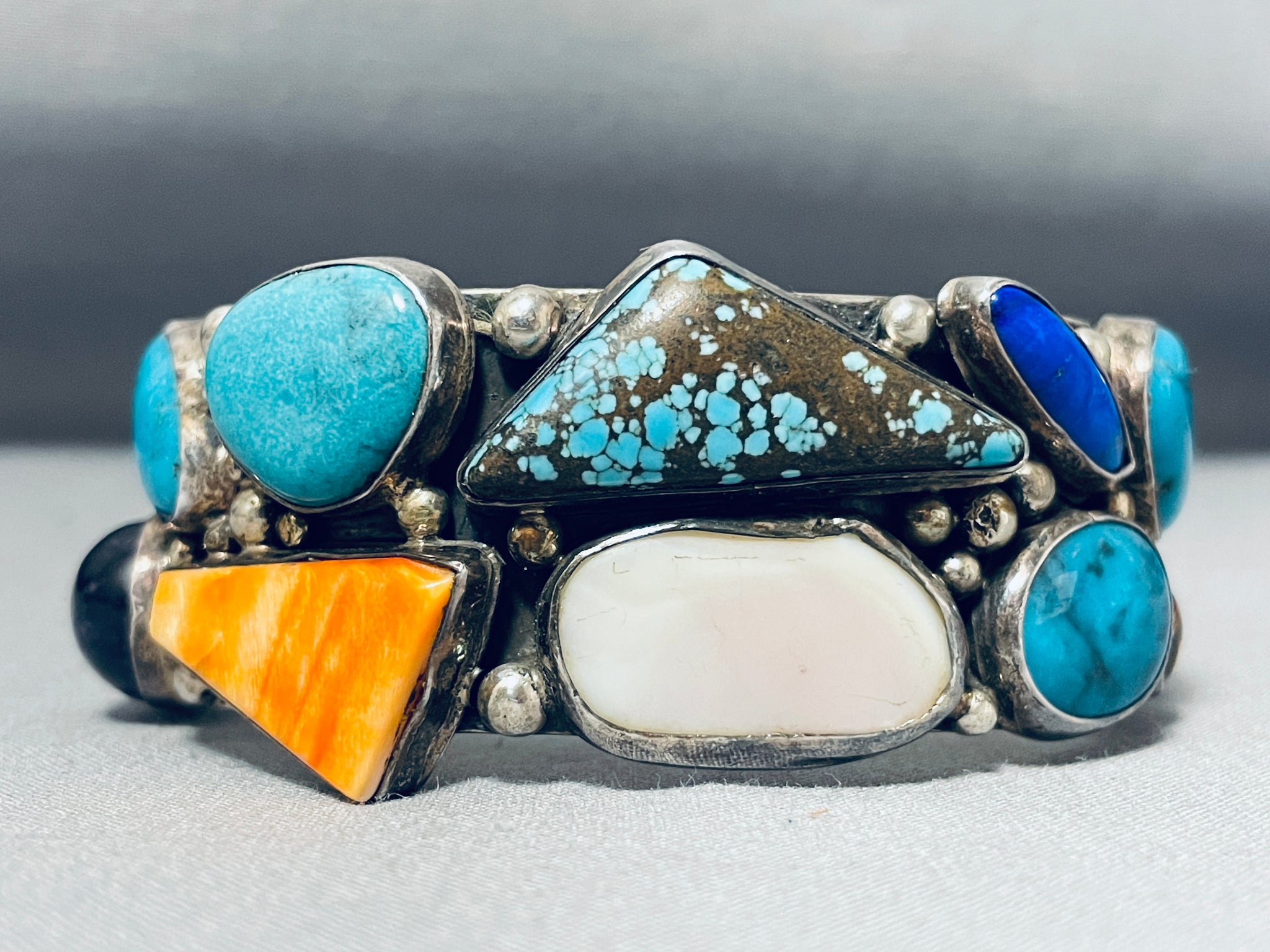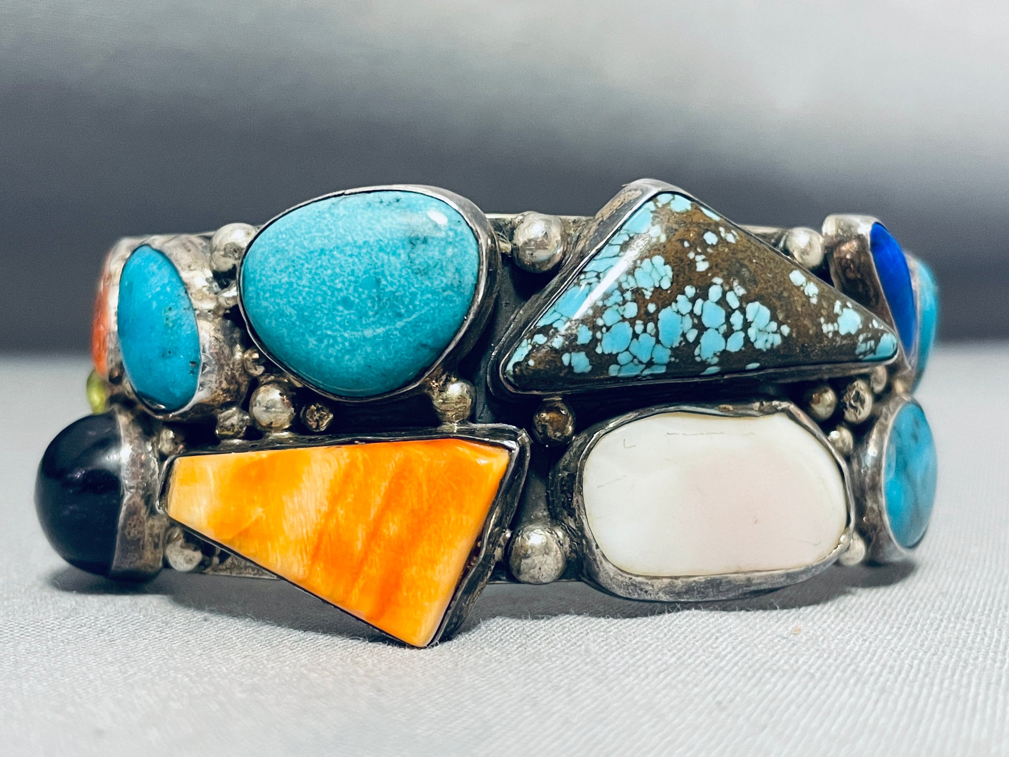 This is an incredible vintage Navajo multiple stone and shell silver bracelet. This bracelet is absolutely incredible as it consists of a mind blowing plethora of different shaped stones and shells. The stones and shells consist of a center #8 turquoise stone, accentign vibrant blue turquoise stones, lapis, purple shell, orange shell, spiny oyster shell, onyx, and mother of pearl shell. Situated throughout the very thick and heavy silver cuff are wonderful silver raindrops. I just love how the stones and shells wrap almost completely around the cuff. The center stone measures around 1-1/4" x 1/2". The width of the bracelet measures around 1". Signed by Navajo artist, LL. Bennett. Sterling silver, marked. Cir. 1970's+. The inside end to end measures around 5-3/4" with an additional 1" gap. Sturdy 93 grams.