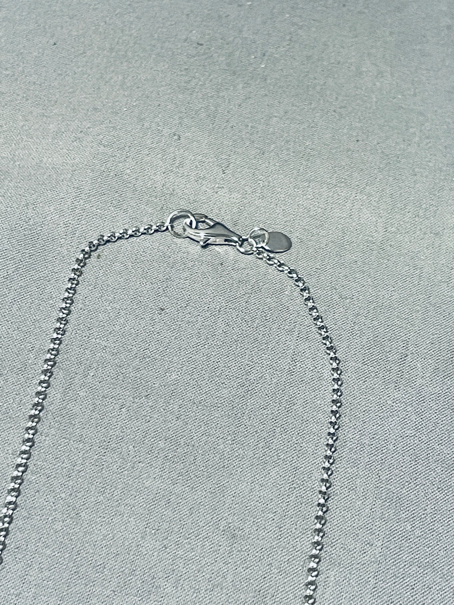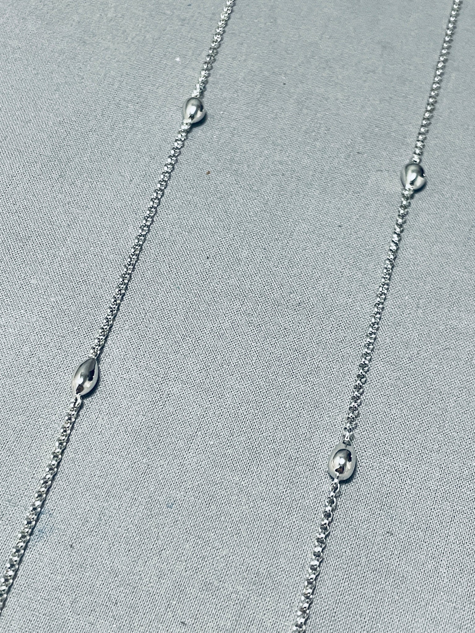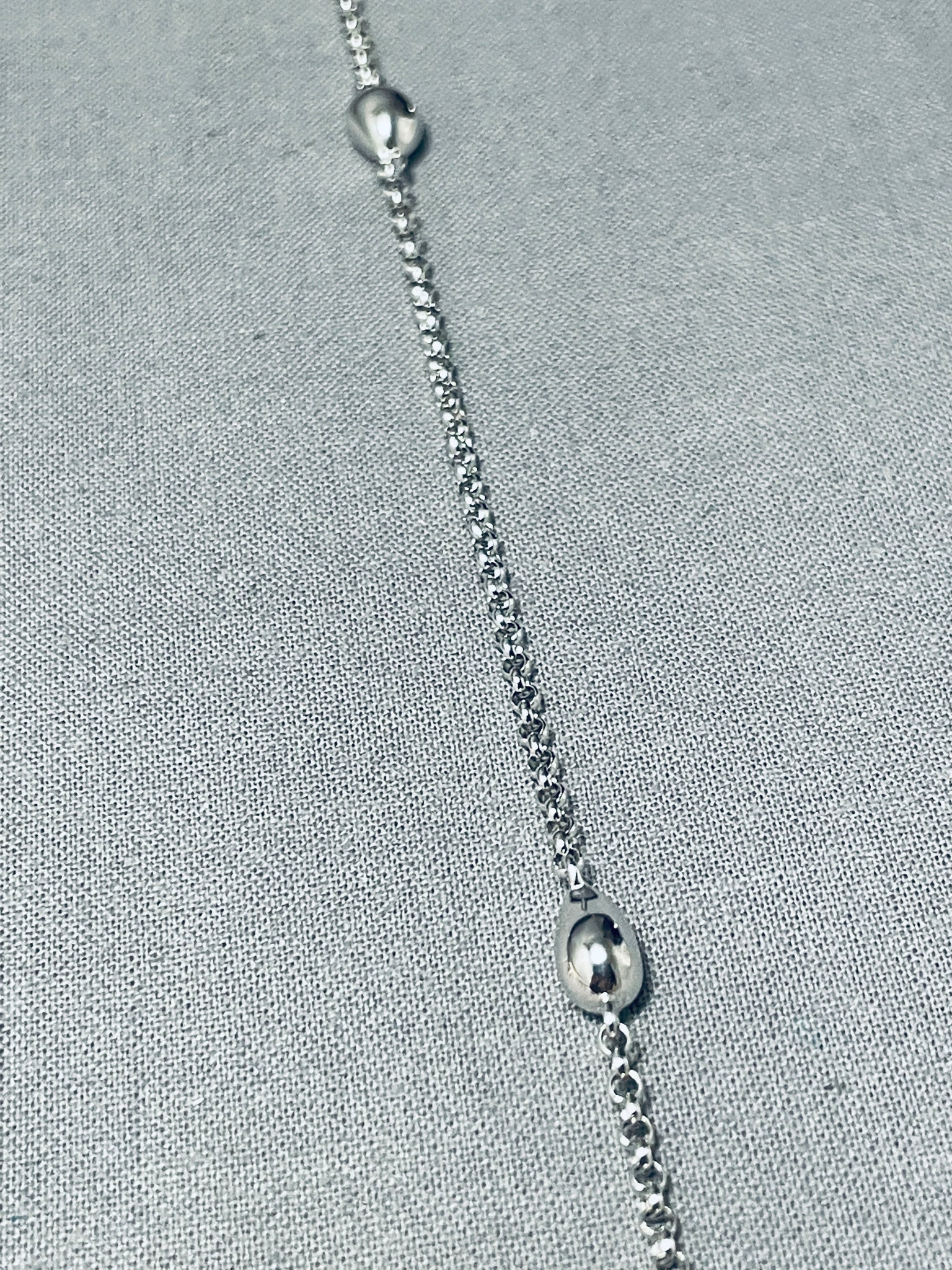 This is a wonderful Southwest bean all silver necklace. This beautiful necklace contains a wonderful plethora of silver links with accenting large silver beans located throughout. I absolutely love the simplicity and beauty of this necklace. Sterling silver, marked. The length of the necklace measures around 23". Sturdy 11 grams.