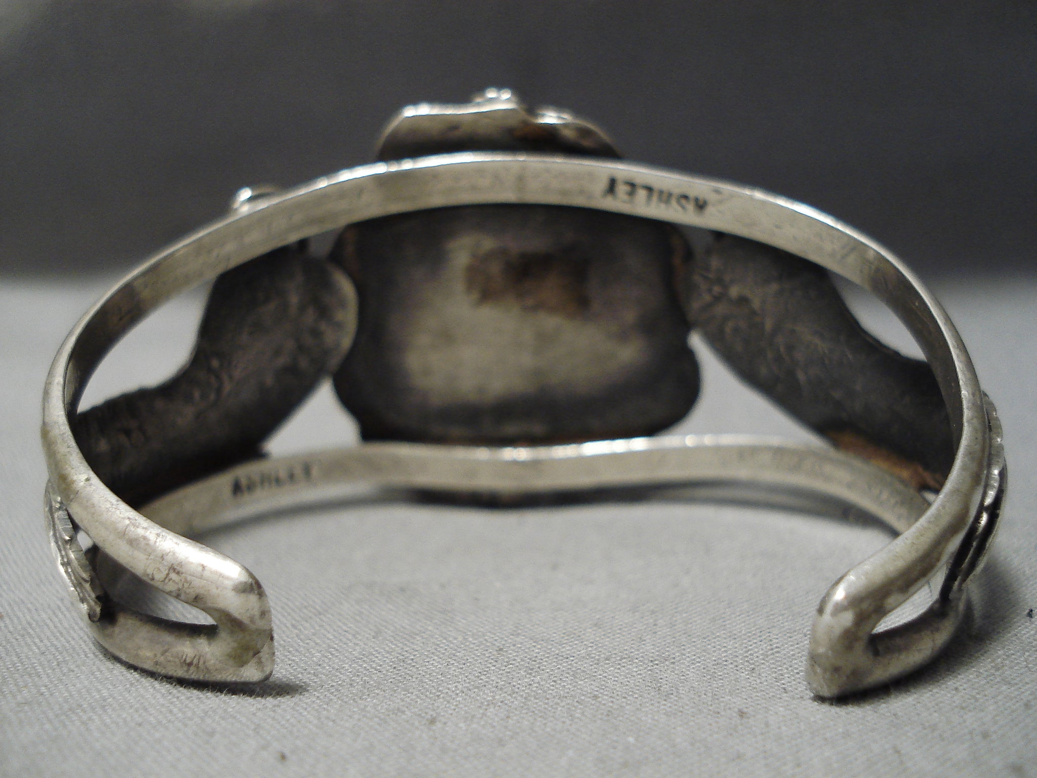 This is a superlative vintage Navajo single stone silver bracelet. This piece contains a beautiful center large spiderweb turquoise stone that appears to be from the old Morenci turquoise mine. Surrounding the stone are impeccable silver works that consist of hand carved silver leaves, flowers and raindrops. Running down both ends of the thick double silver shank cuff are two huge silver leaves. The center stone measures around 1-1/8" x 1". The width of the bracelet measures around 1-3/8". Signed by Navajo artist, Ashley . Sterling silver. Cir. 1960's+. The inside end to end measures around 5-3/4" with an additional 1-1/4" gap. Sturdy 49 grams.