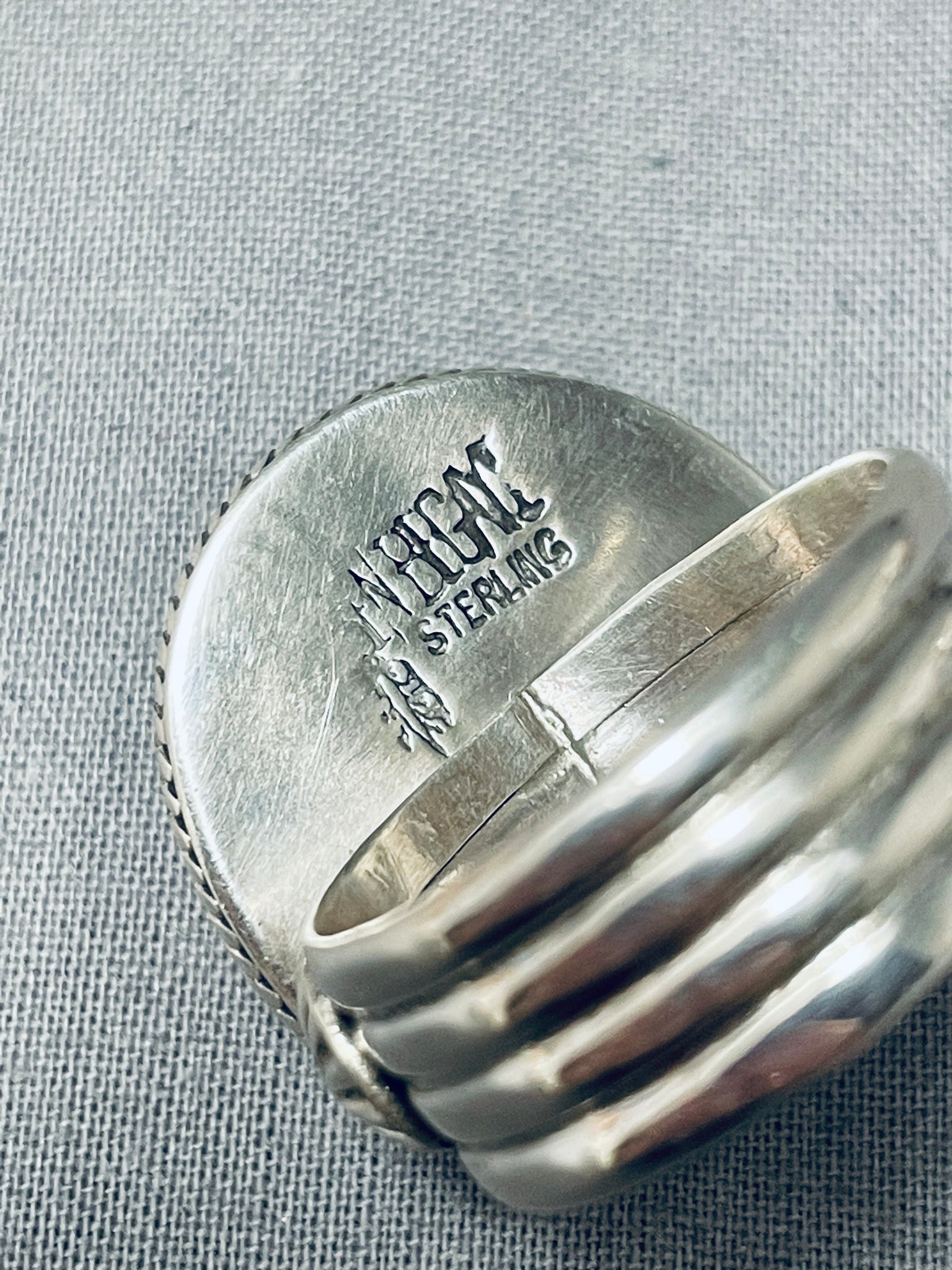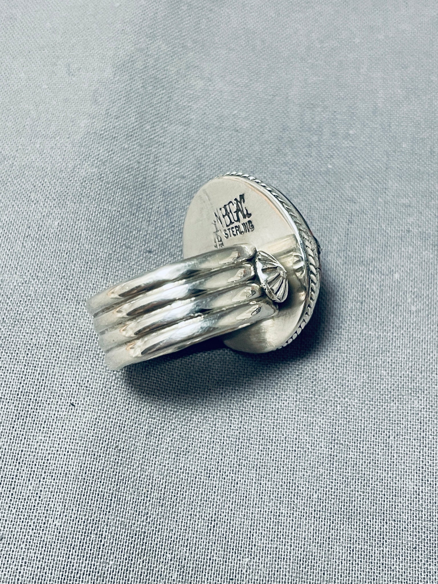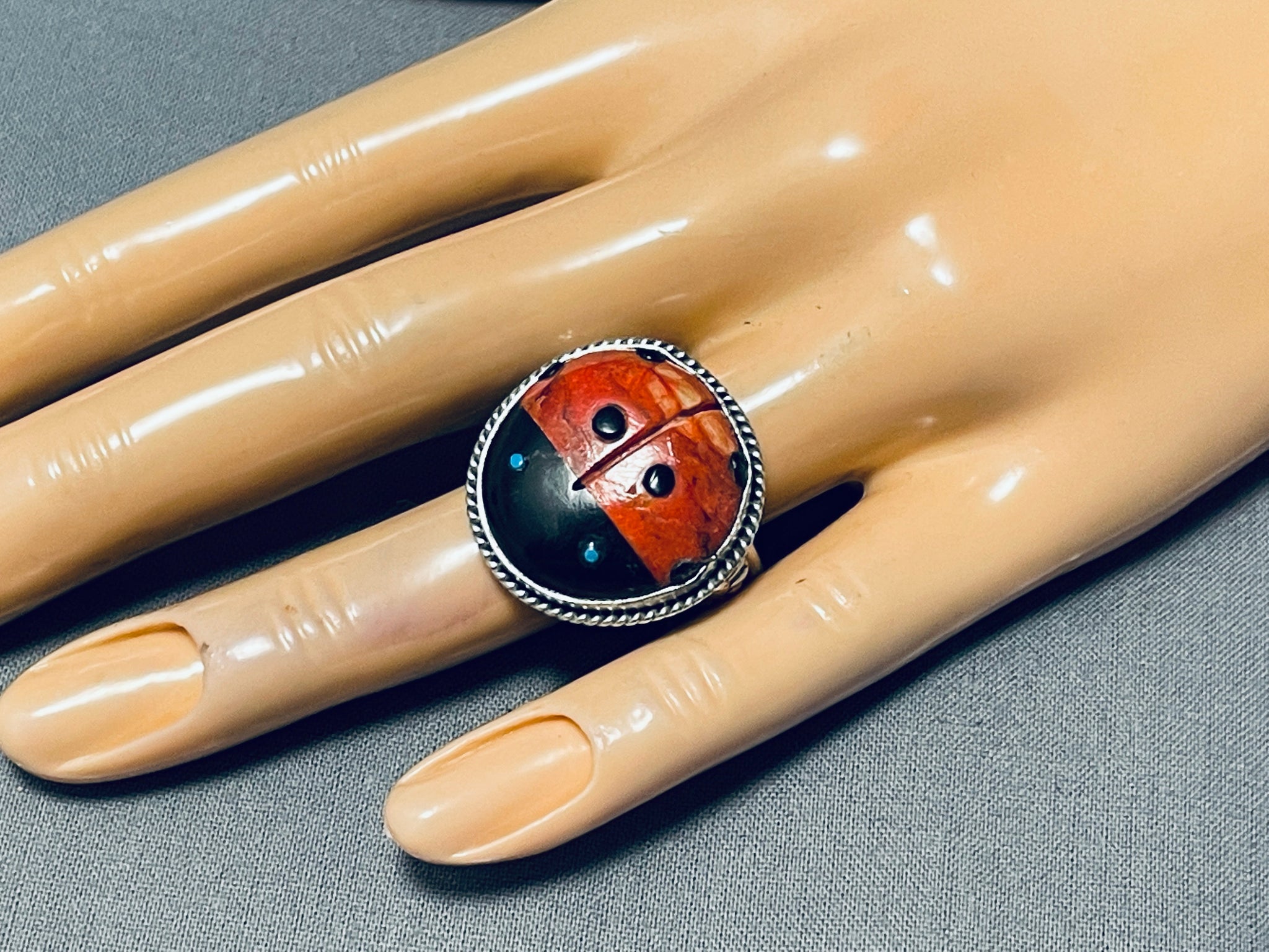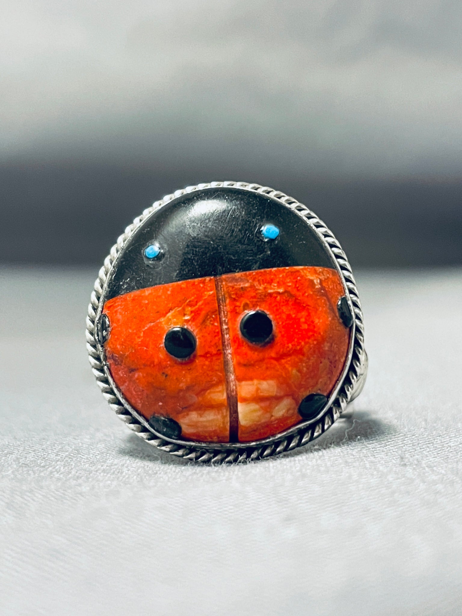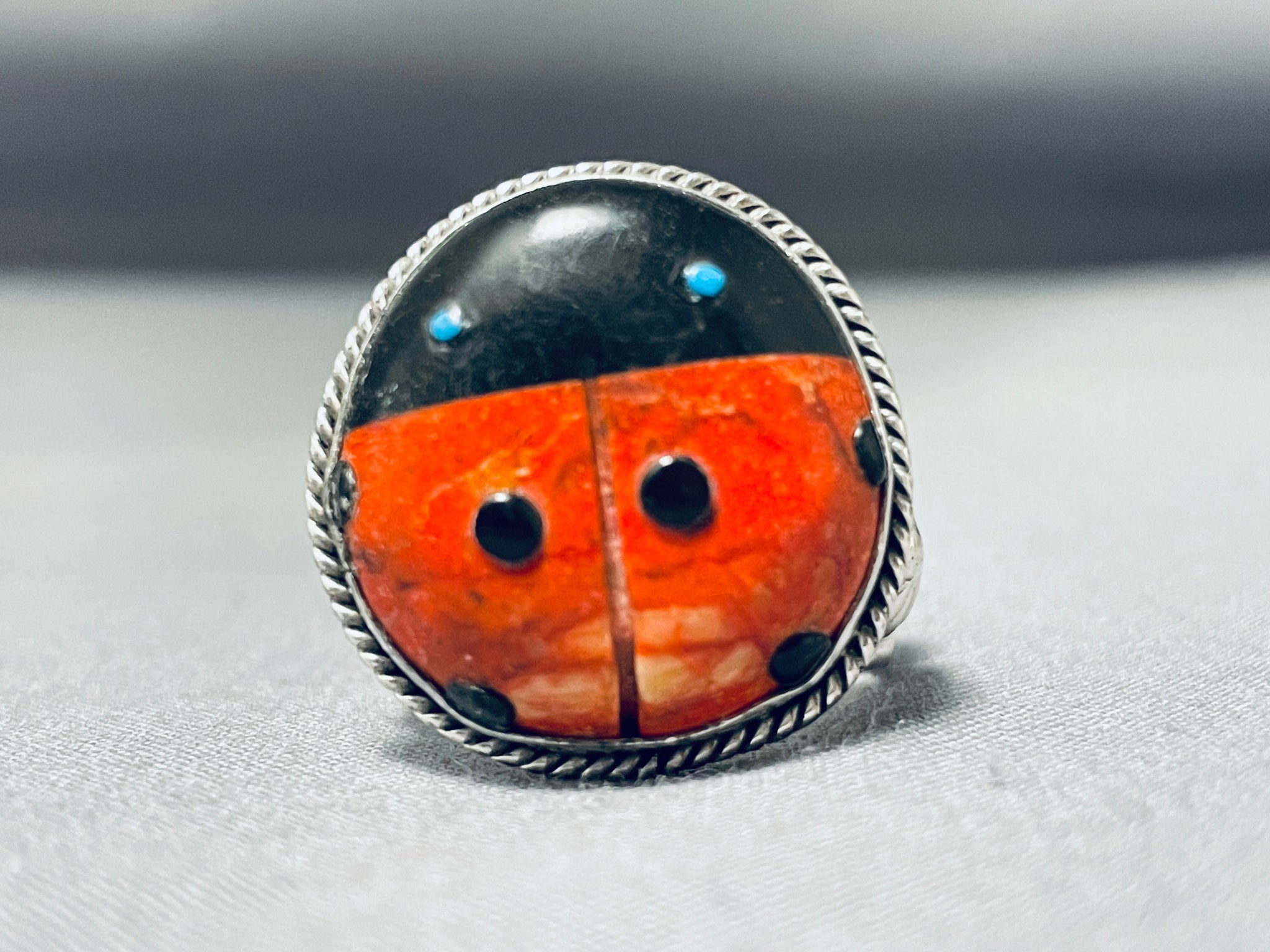 Whimsical Native American Navajo Signed Coral Jet Turquoise Sterling Silver Ladybug Ring