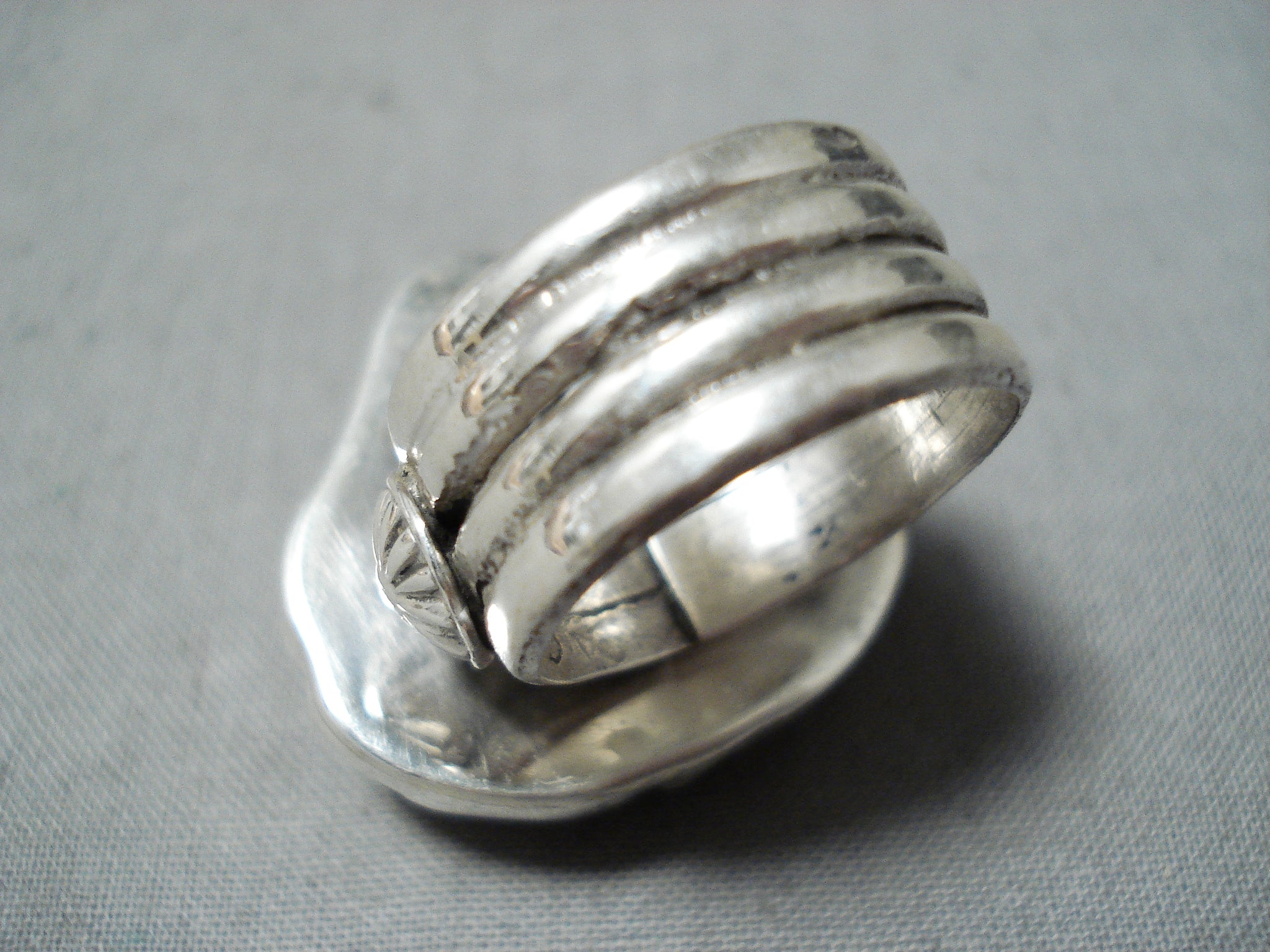 Up for sale is this unique Navajo silver ring. With turquoise accents on its back and jet stones for eyes, this tremendous large shell frog really comes to life as it sets upon its four-rail band! The ring face measures around 1" x 1-1/8". Signed by Navajo artist, Ben Begaye. The ring size is around 7-1/2. Sterling silver, marked. Sturdy 26 grams.