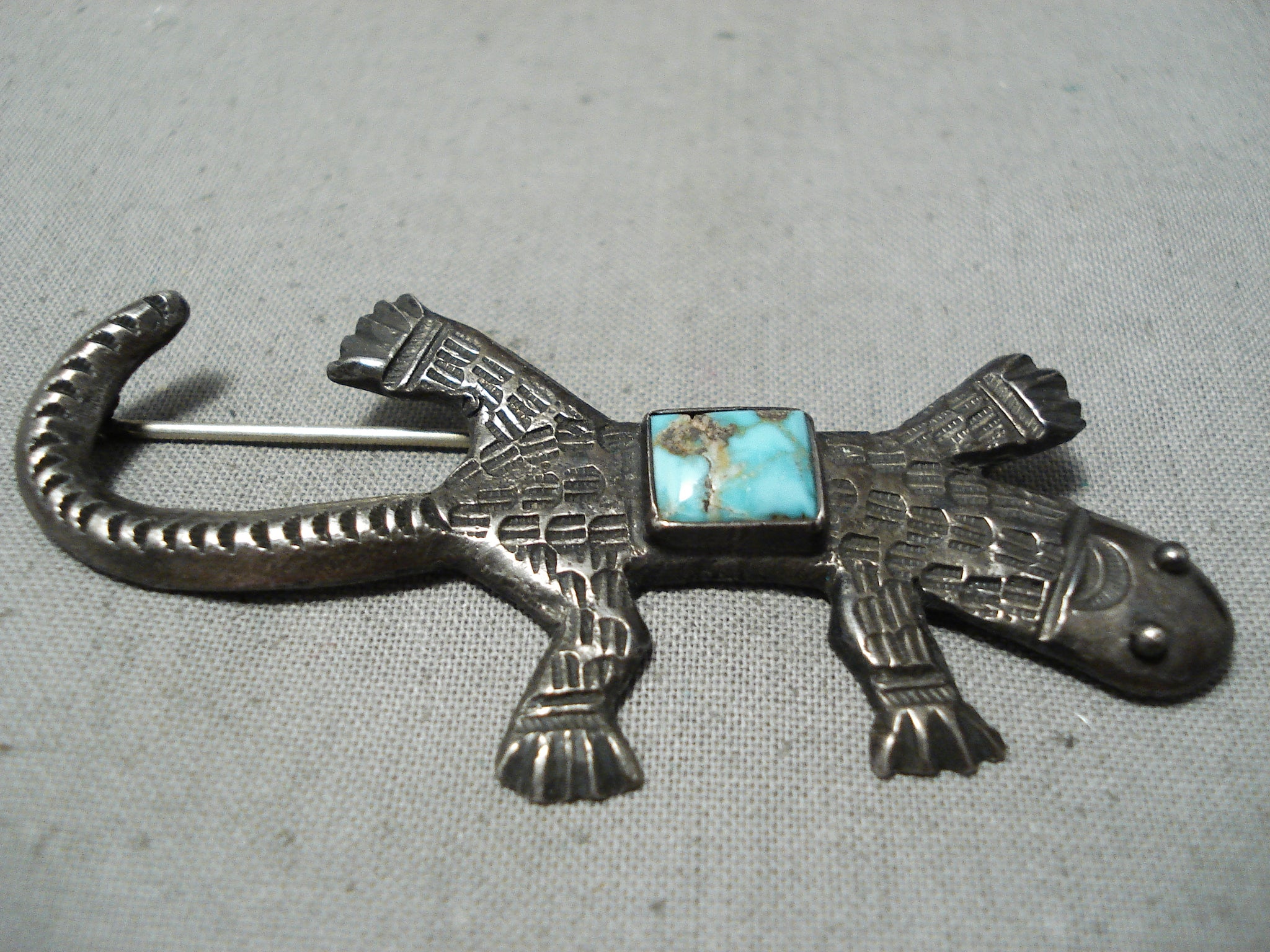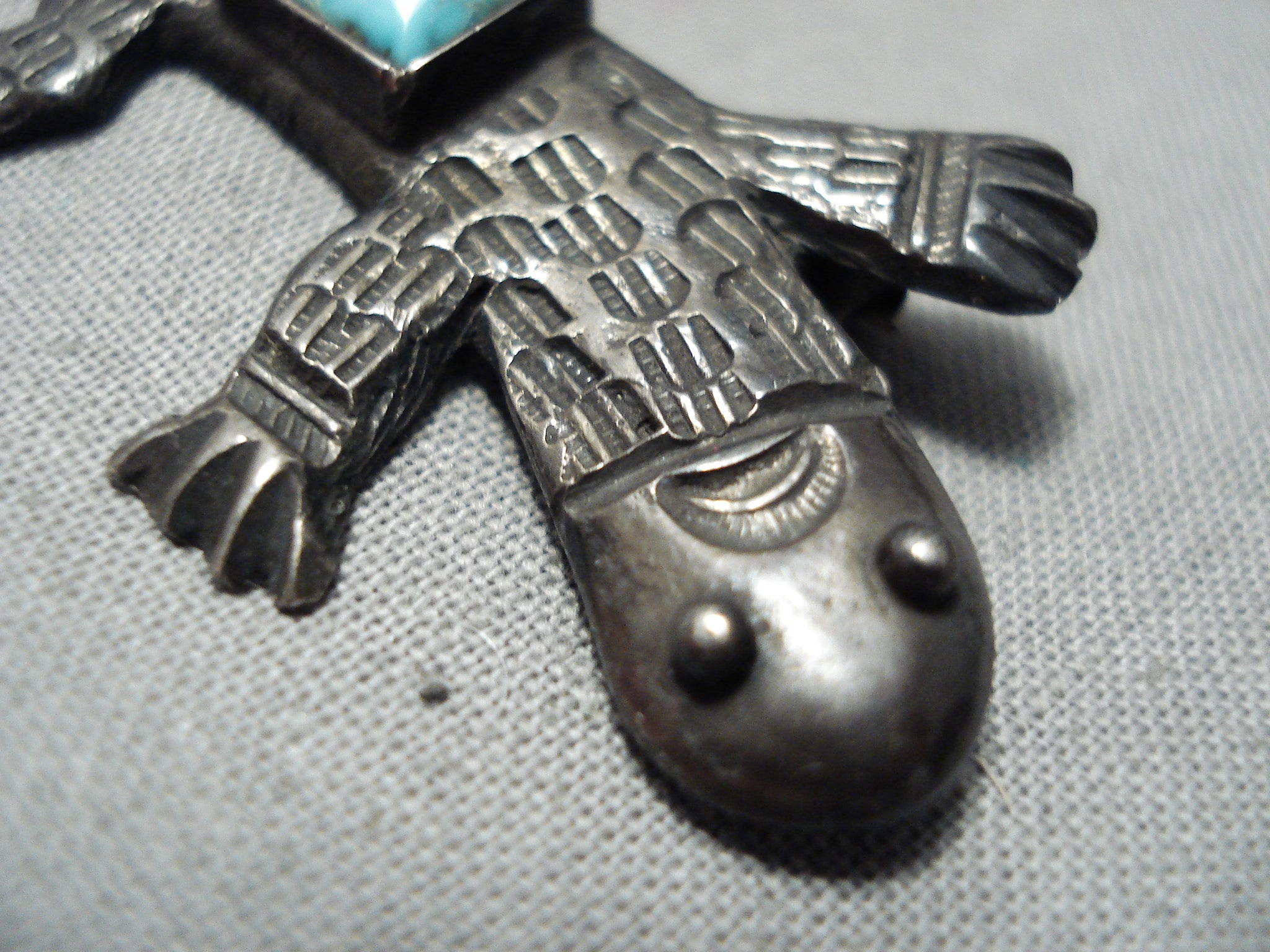Whimsical Vintage Native American Navajo Turquoise Sterling Silver Gekko Pin Old