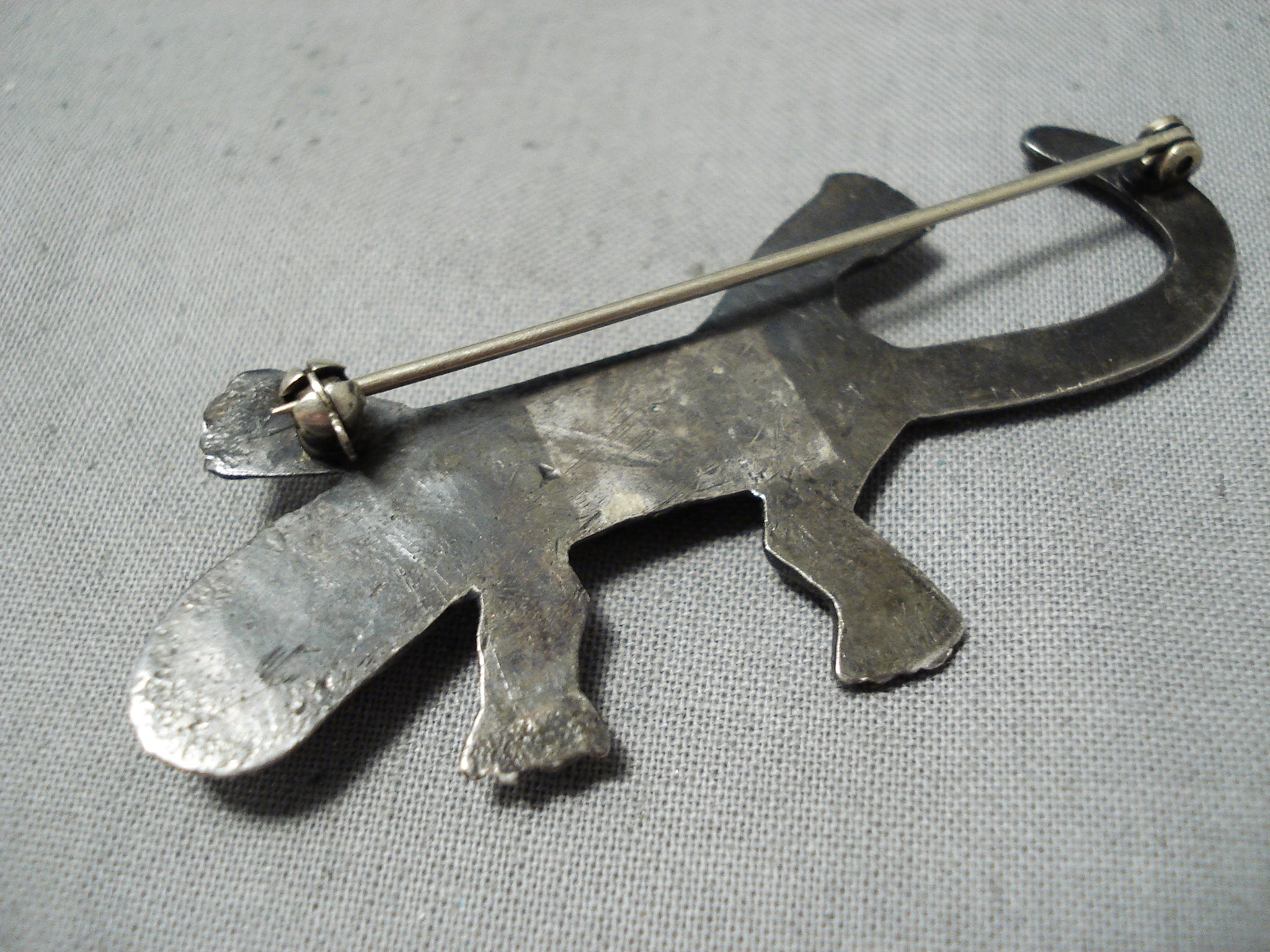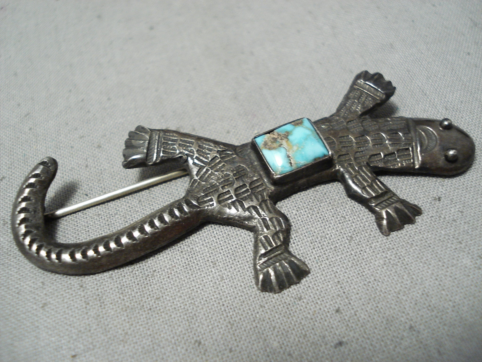 Here we have an impressive vintage Navajo silver pin having an intricately handcarved silver gekko with a turquoise square center! Truly Amazing Piece! The center stone measures around 1/4" x 1/4". Sterling silver. Cir Mid Century .The pin measures around 2-1/2" x 1-1/8". Sturdy 12 grams.