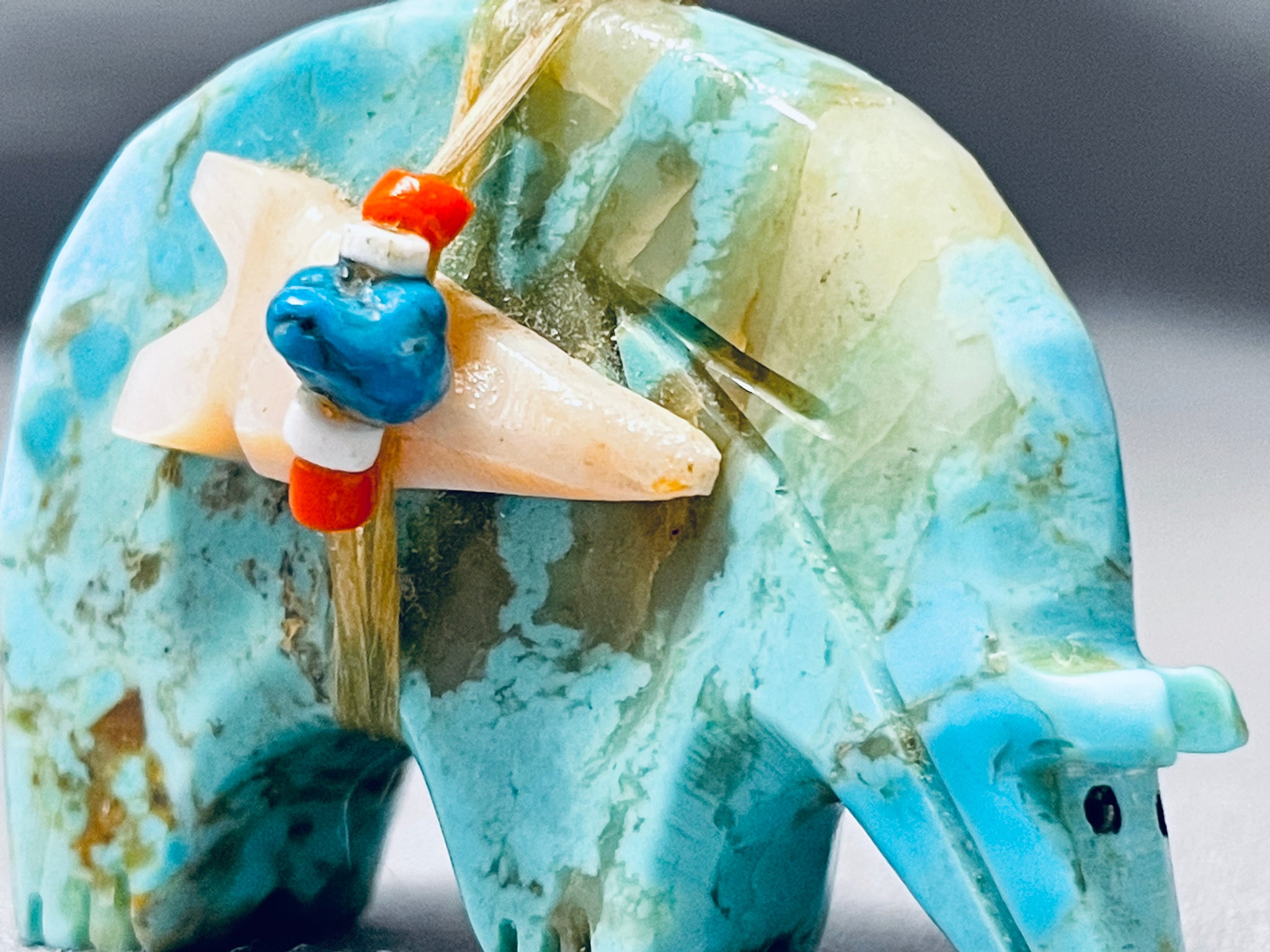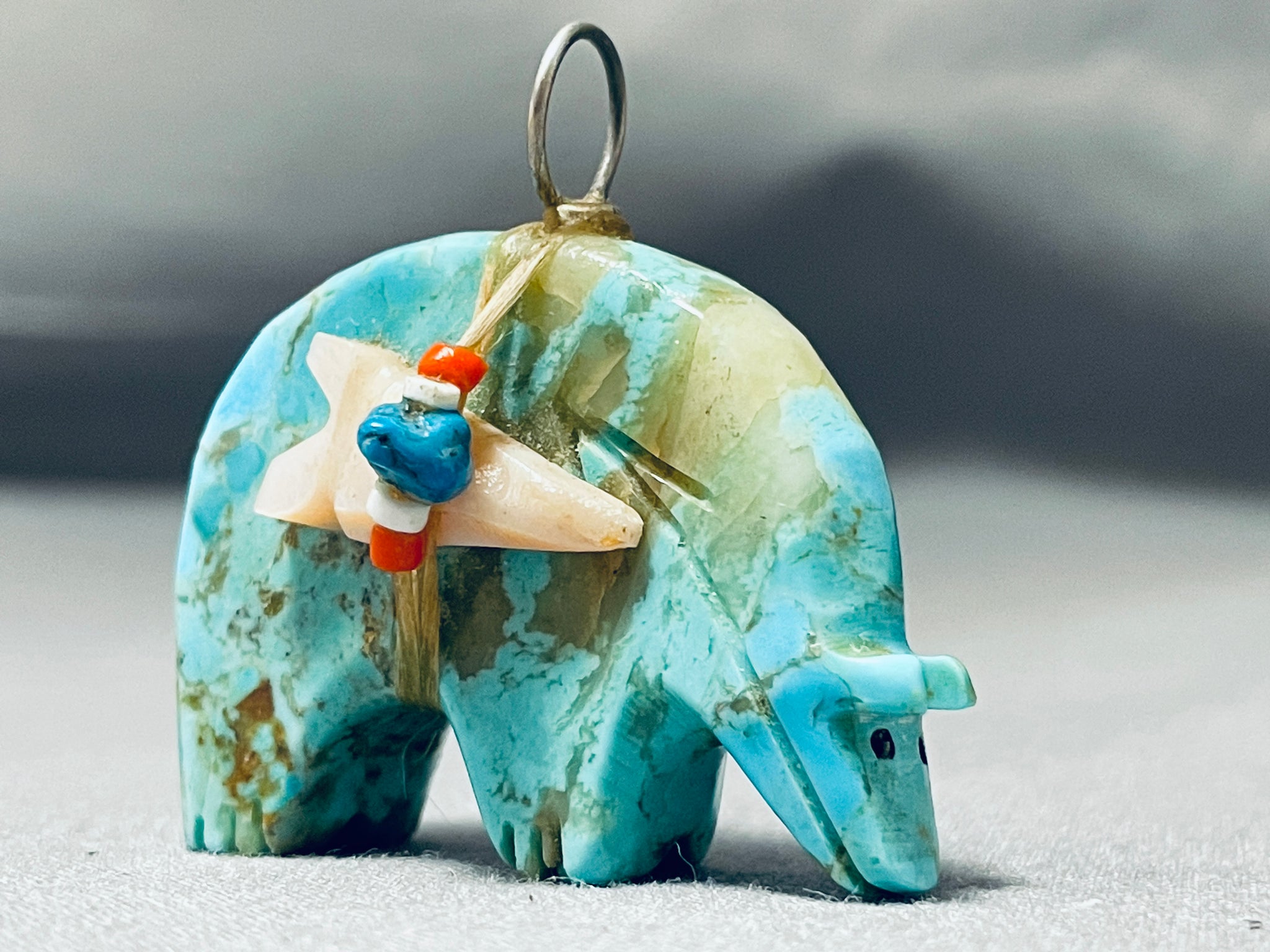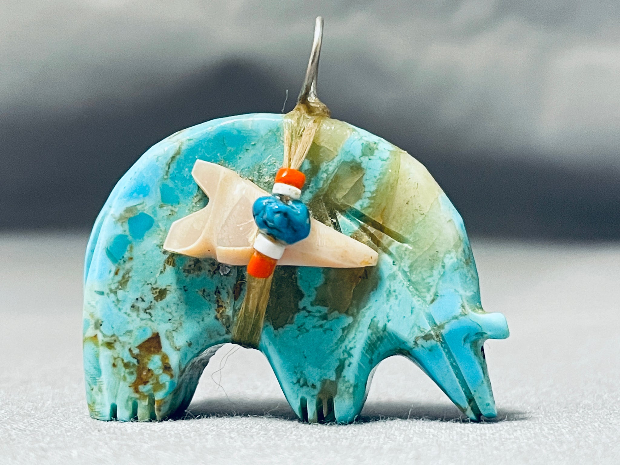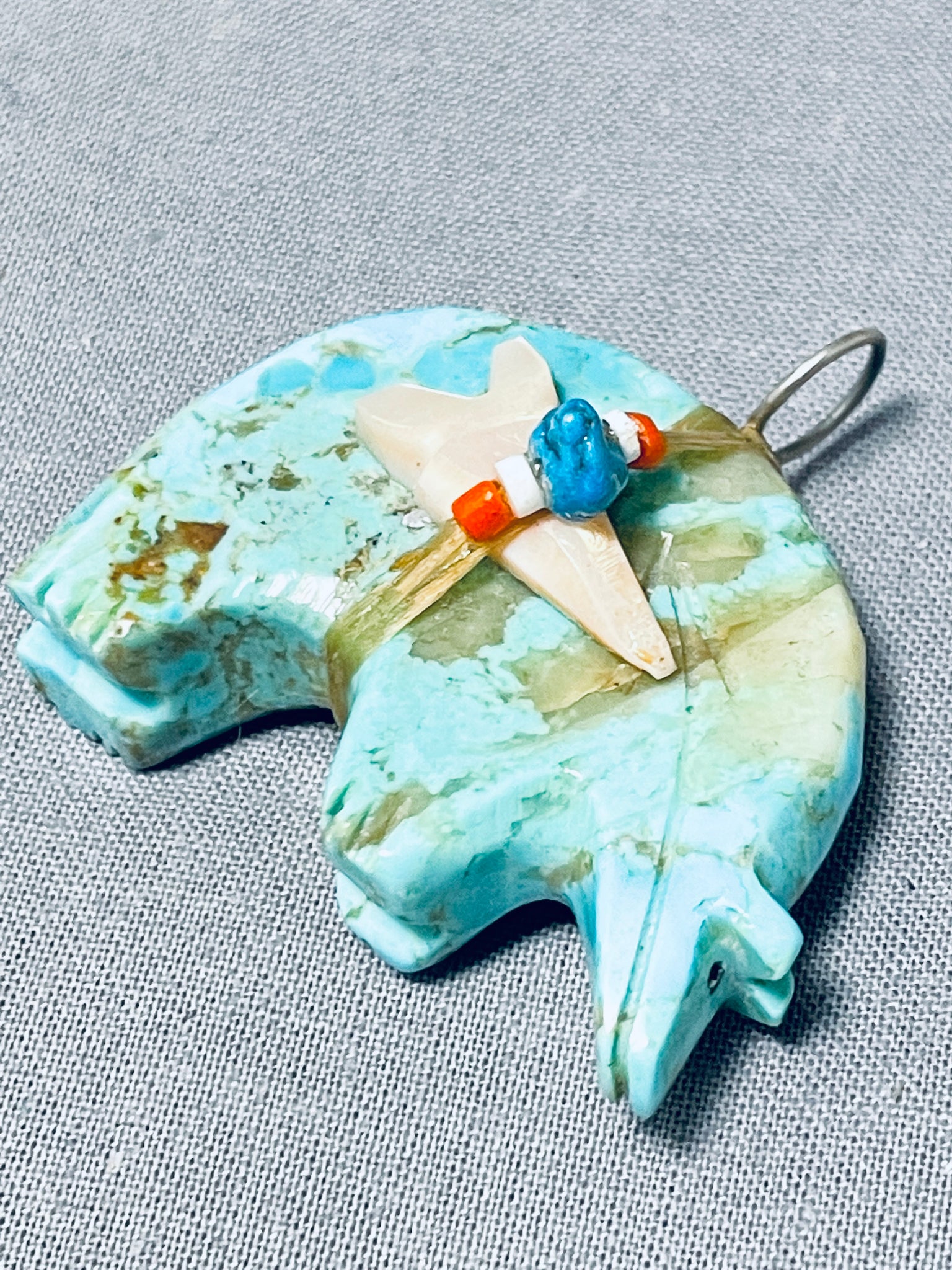 Up for sale is this fascinating vintage Zuni pendant. Here we have a real dimensional beauty! The turquoise bear is additionally decorated with a station of a mother of pearl arrowhead with turquoise, coral and shell! And the simple silver loop at the top has a generous ¼" bail opening. Sterling silver. The pendant measures around 1-5/8" x 1-1/2". Sturdy 16 grams.