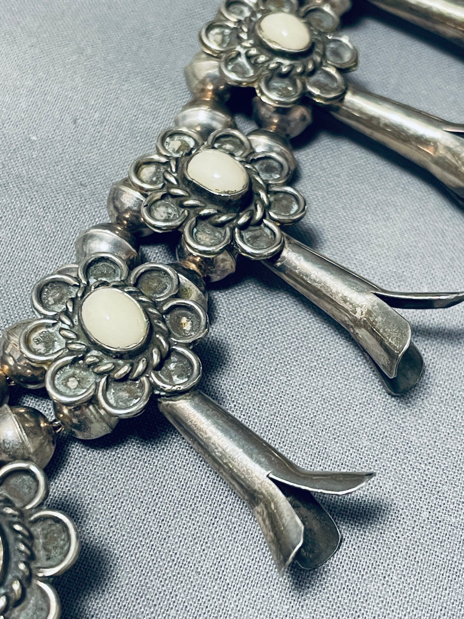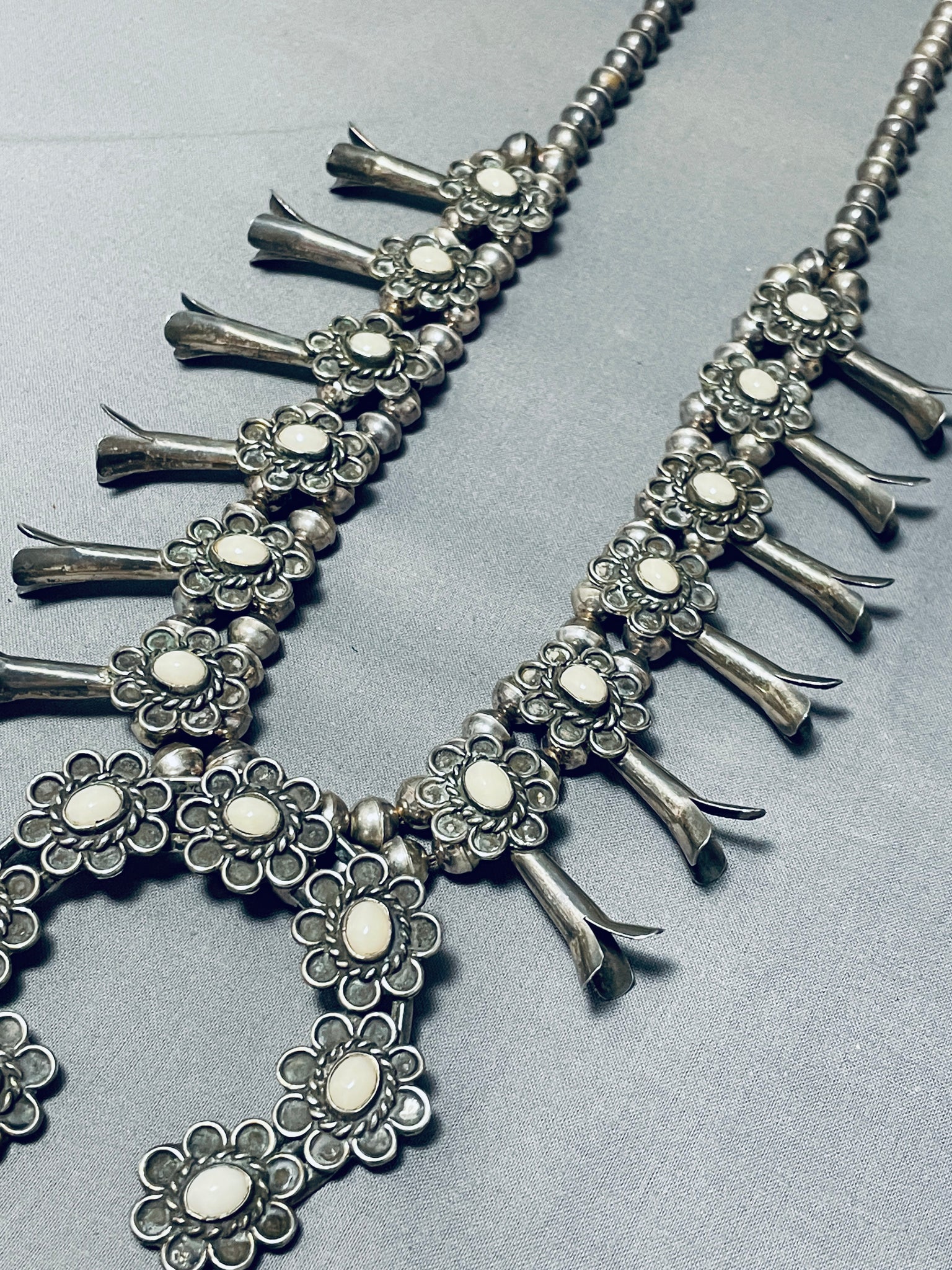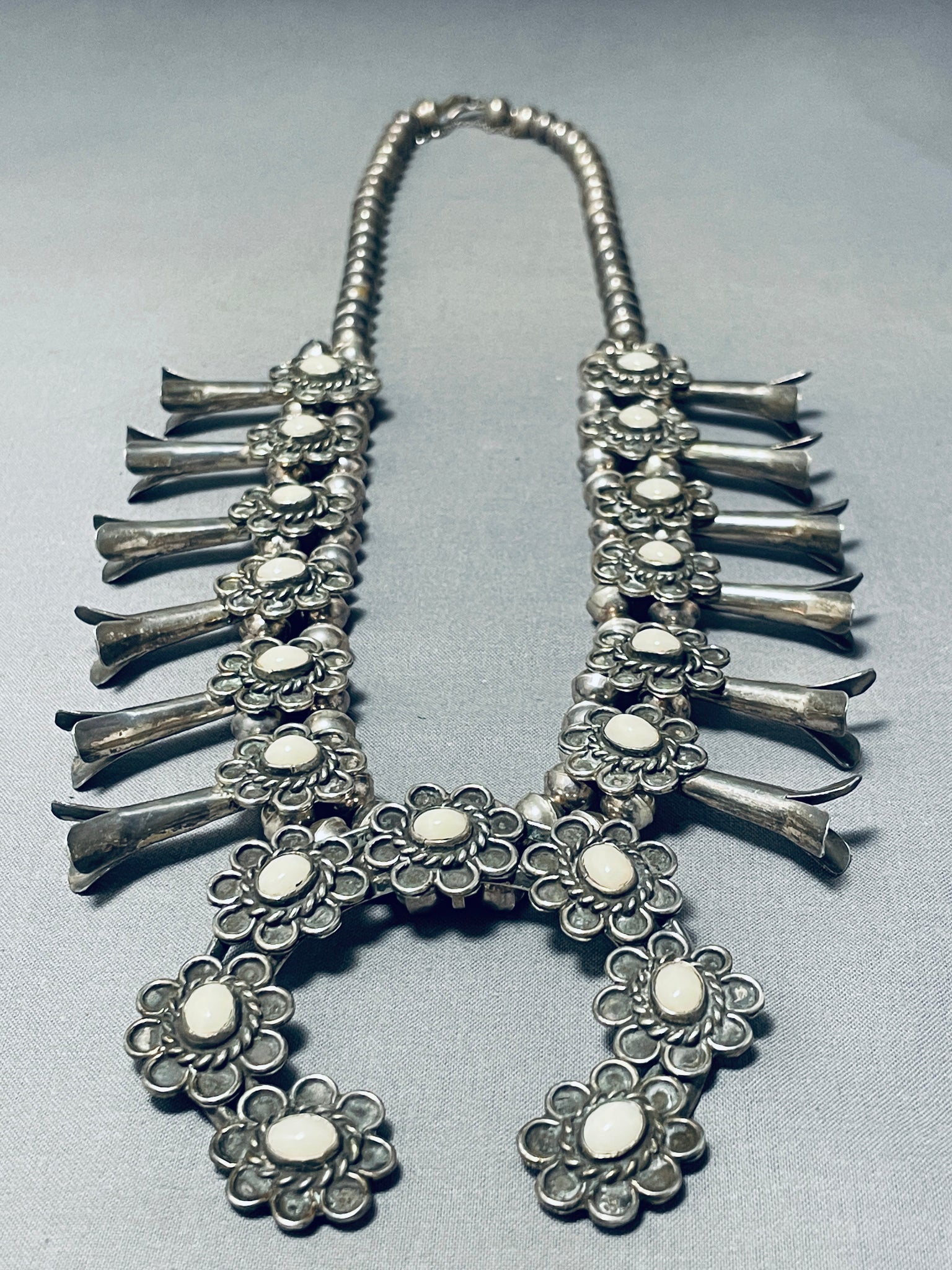 White Buffalo Turquoise Vintage Native American Navajo Sterling Silver Squash Blossom Necklace