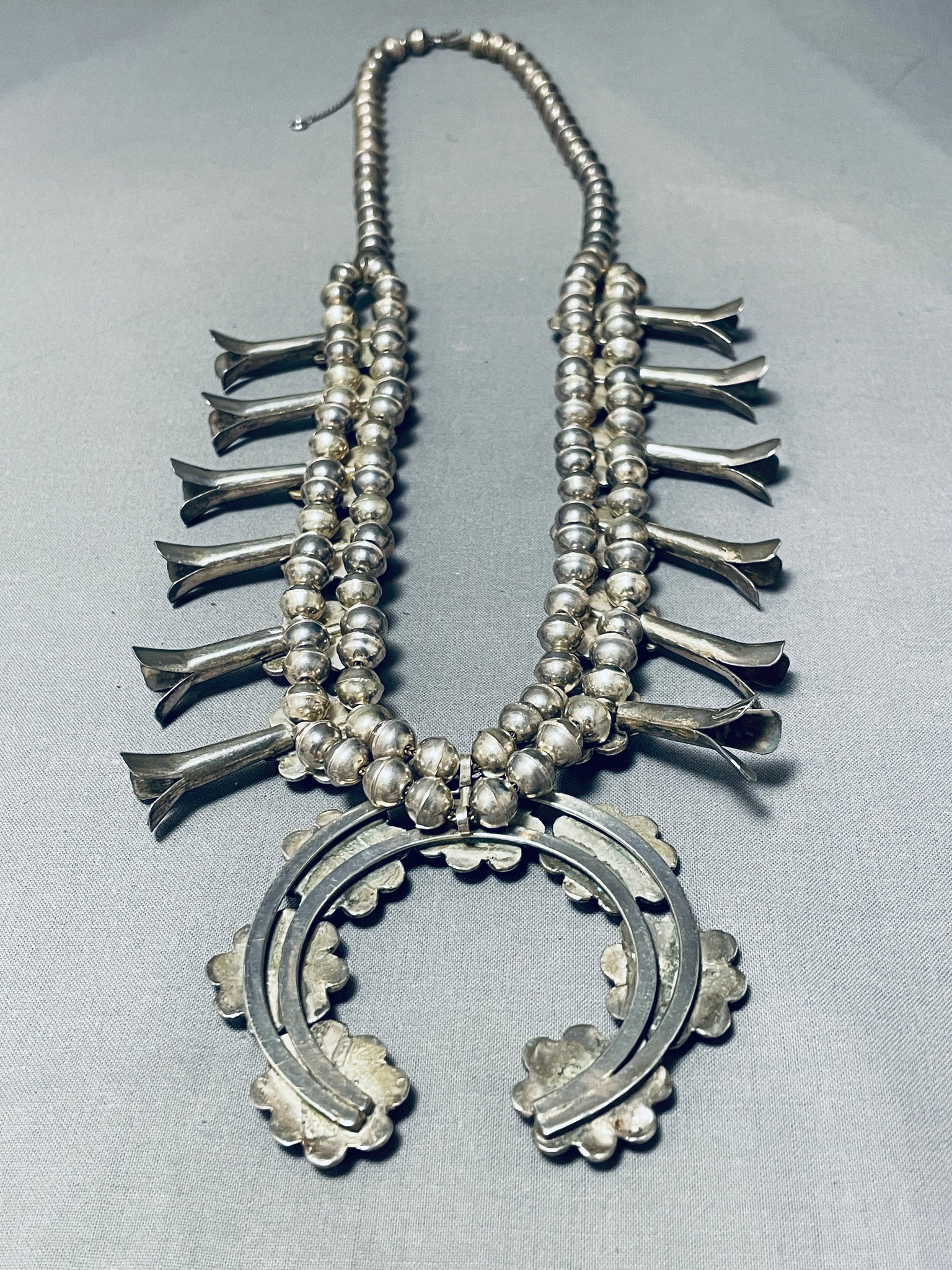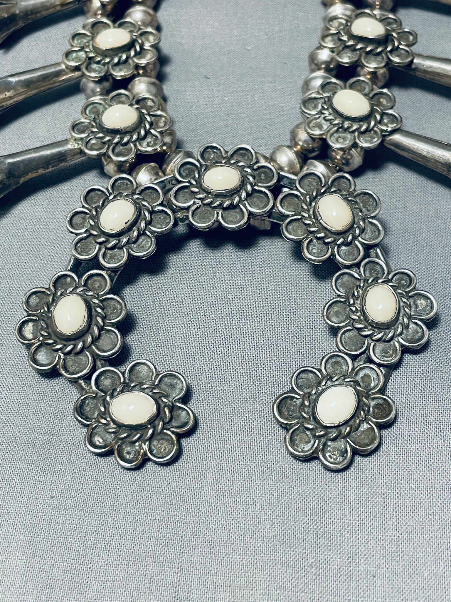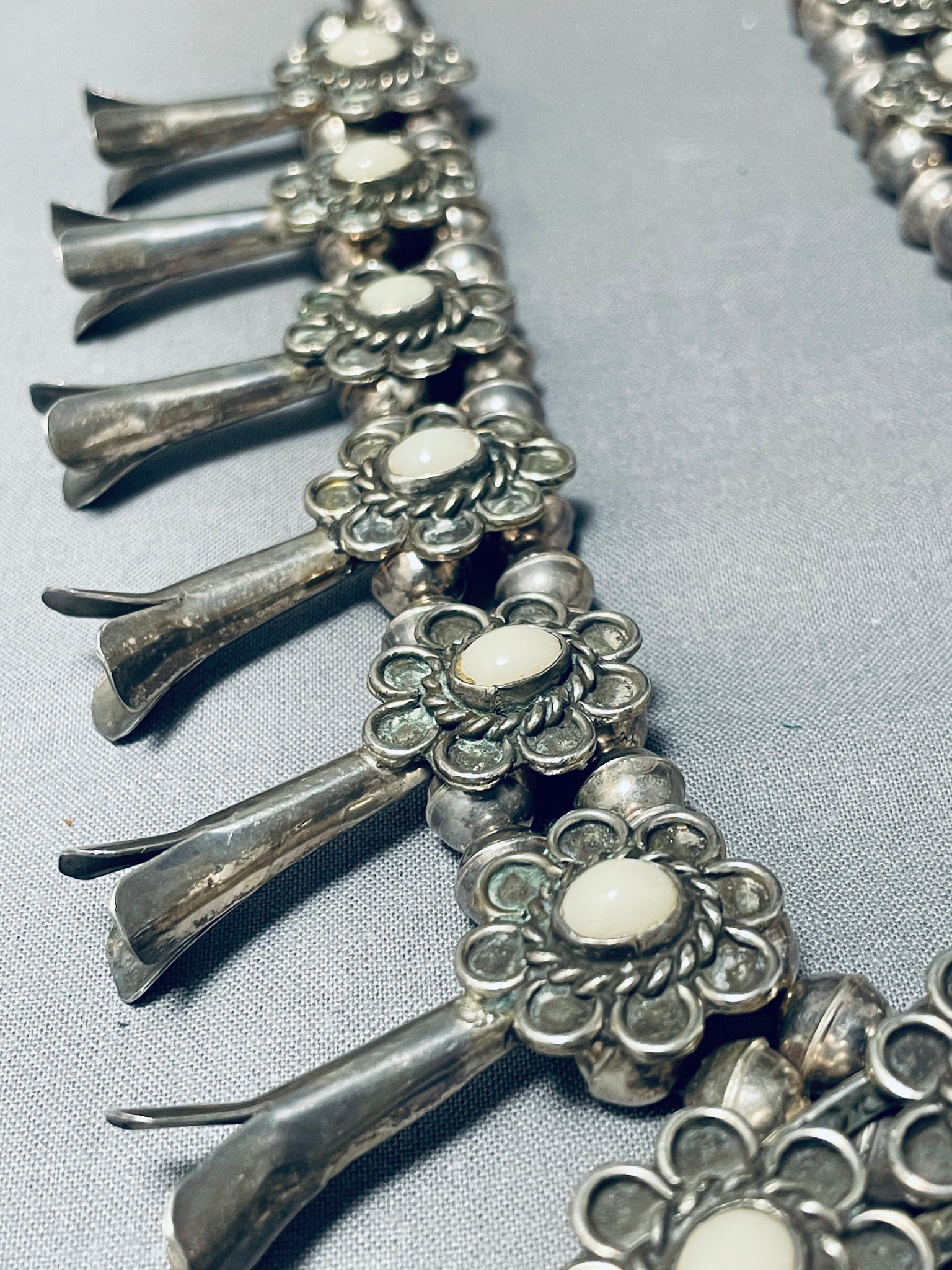 White Buffalo Turquoise Vintage Native American Navajo Sterling Silver Squash Blossom Necklace