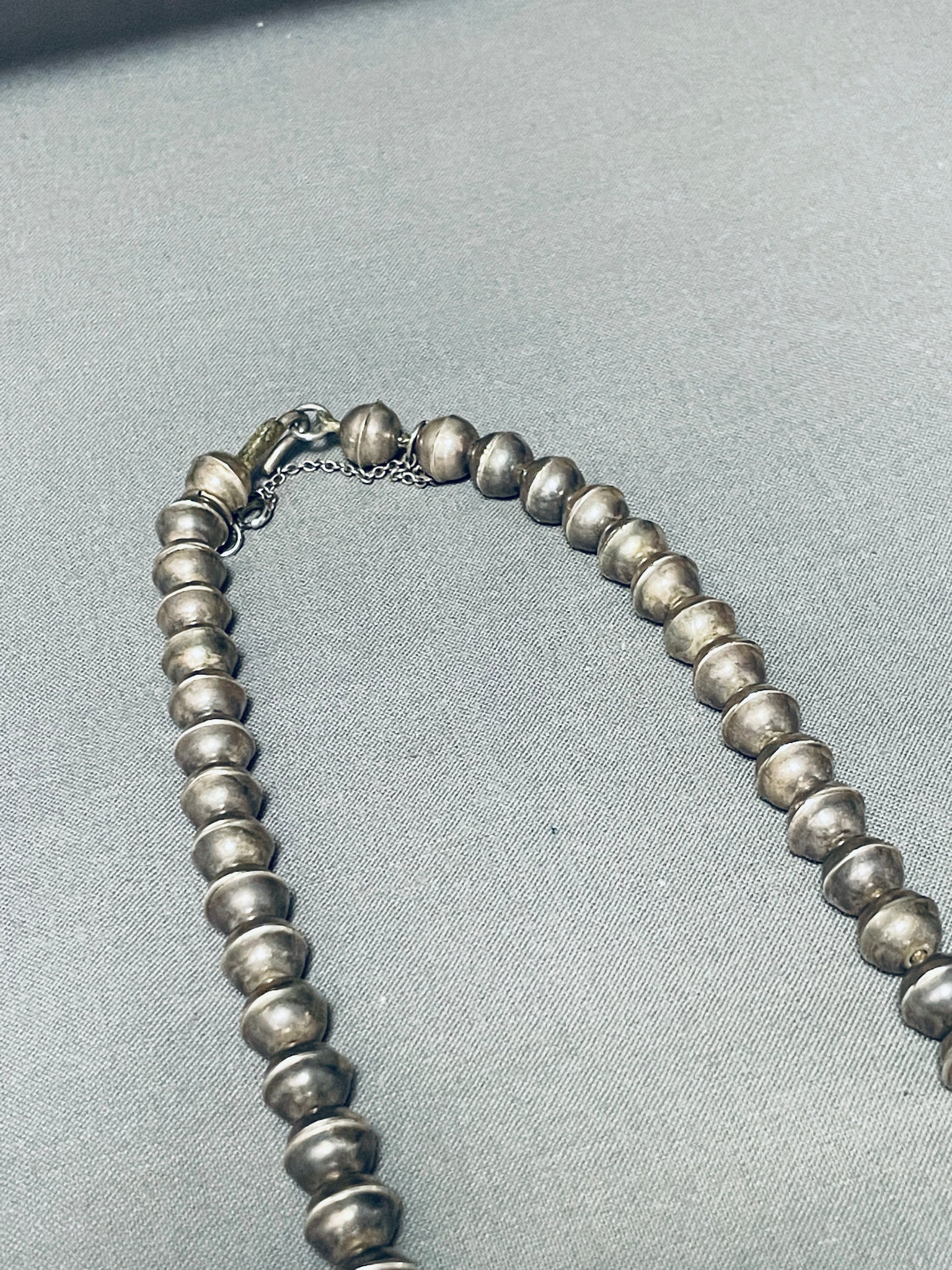 This is a magnificent vintage Navajo white stone large silver squash blossom necklace. This impressive very detailed silver squash blossom necklace contains 12 outstanding silver squashes with each containing a beautiful center white stone. Located on the very thick double shank silver naja pendant are 7 more beautiful matching pieces. The silver works located throughout the necklace include phenomenal wave works and ropes making the pieces appear as multiple flowers. The stunning naja pendant measures around 2-1/2" X 31'. Resting throughout the incredible necklace are wonderful old natural patina round silver beads with a traditional silver clasp. Sterling silver. Cir. Mid century . The length of the necklace measures around 33". Sturdy 212 grams.