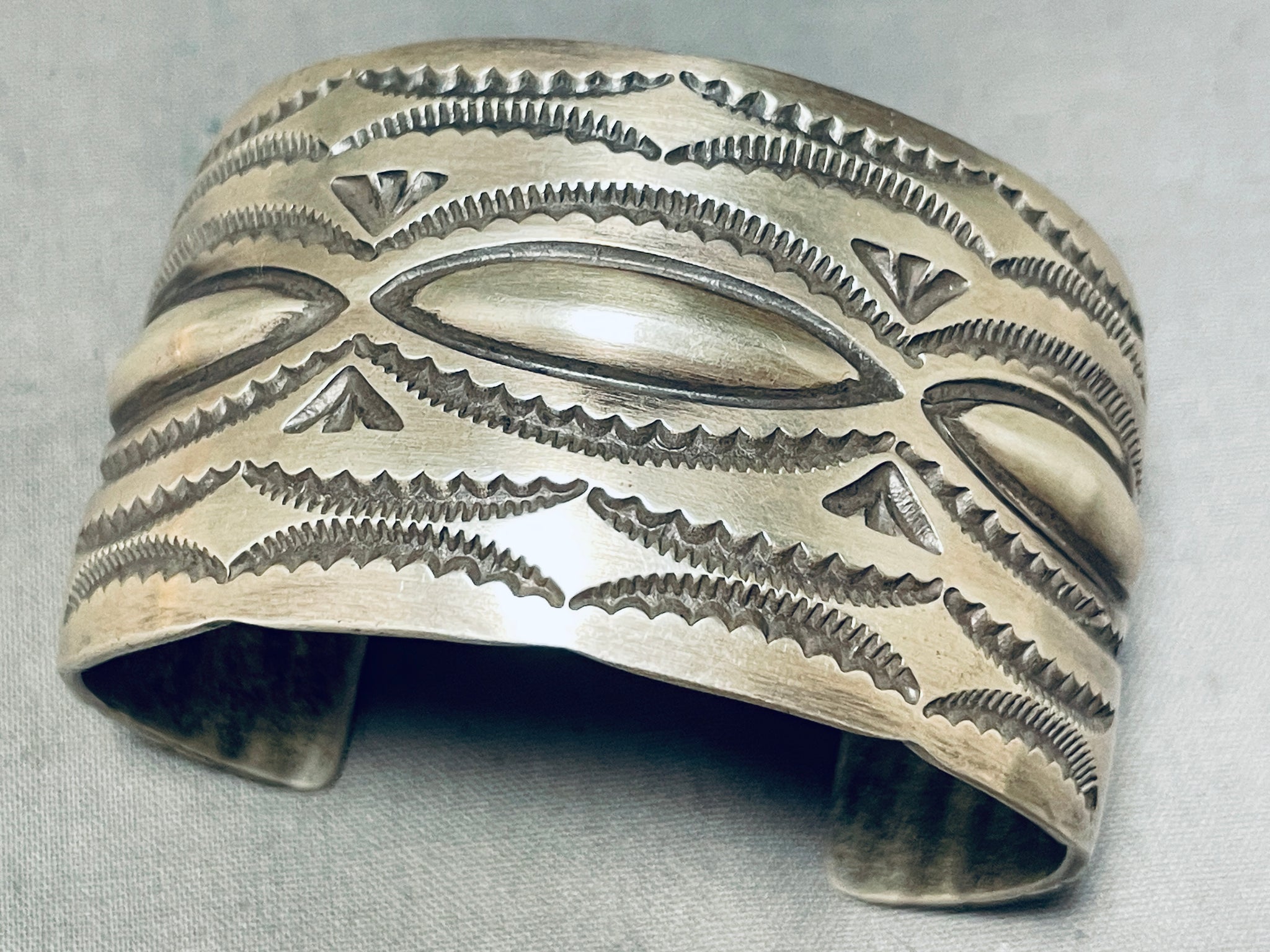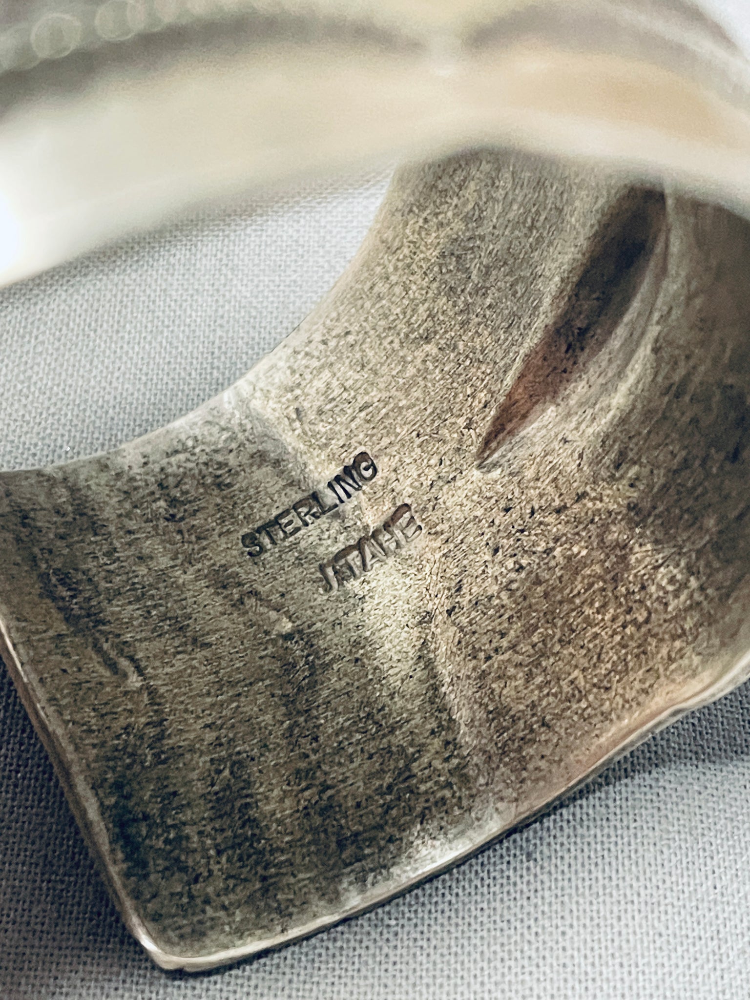 This is an impressive vintage Navajo wide all silver cuff bracelet. This incredible bracelet contains a very wide and thick silver cuff. The carvings consist of long deep sun stampings, plant works and center repoussed shell patterns. The bracelet is absolutely amazing with amazing workmanship. The width of the bracelet measures around 1-3/8". Signed by Navajo artist, J Tahe. Sterling silver, marked. The inside end to end measures around 5-1/4" with an additional 1-1/4" gap. Sturdy 69 grams.