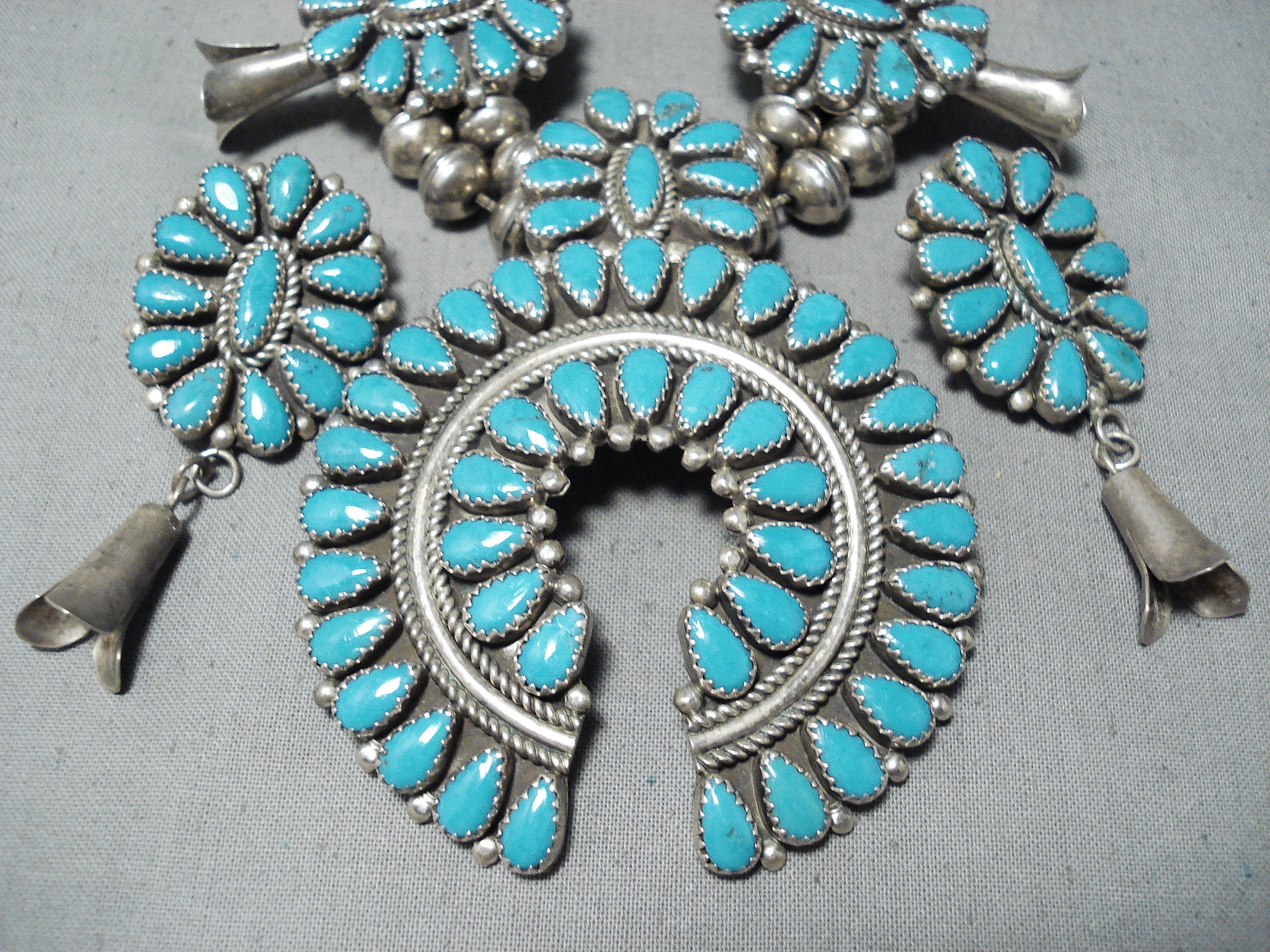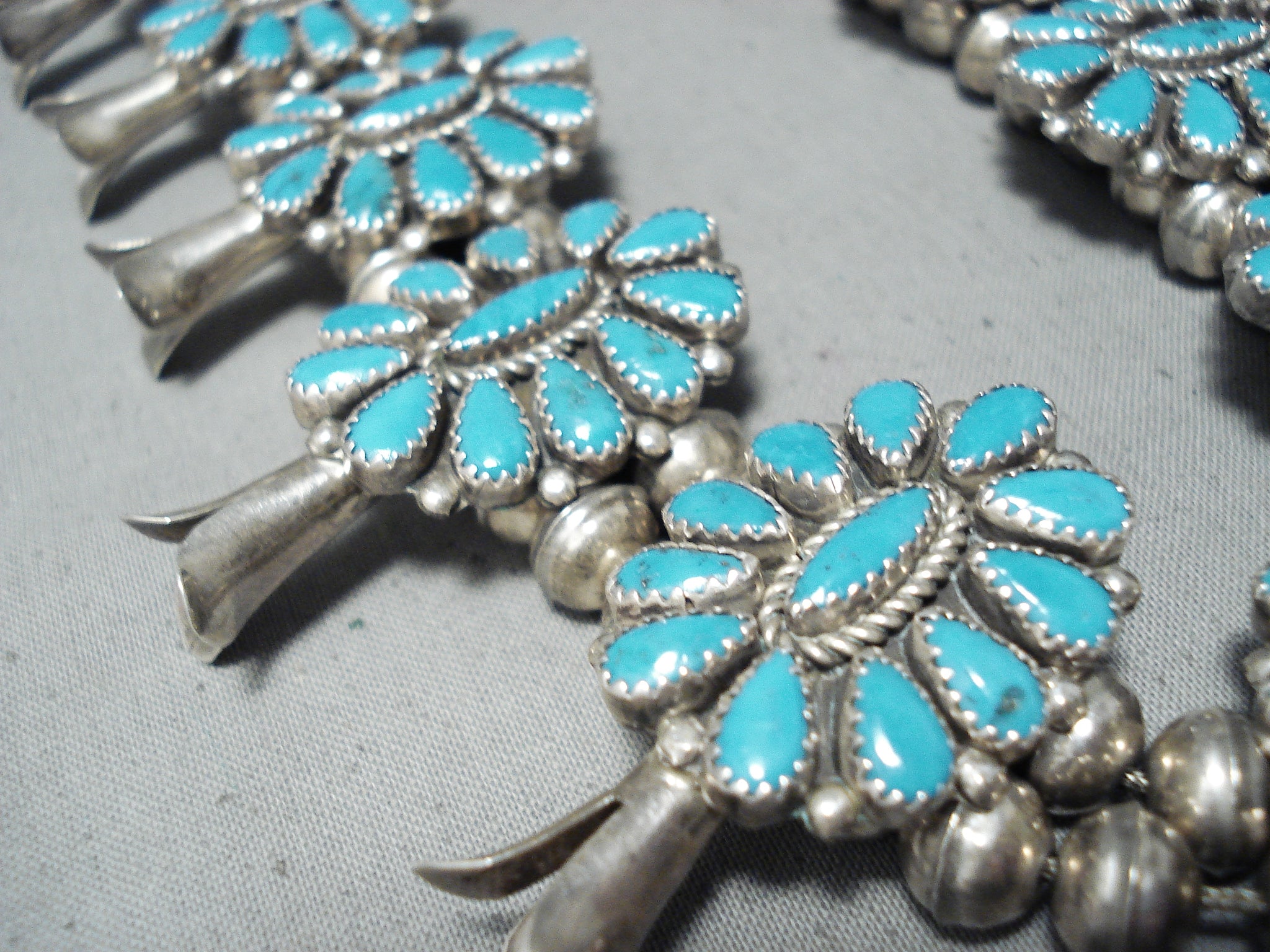 Women's Signed Vintage Native American Navajo Turquoise Sterling Silver Squash Blossom Necklace