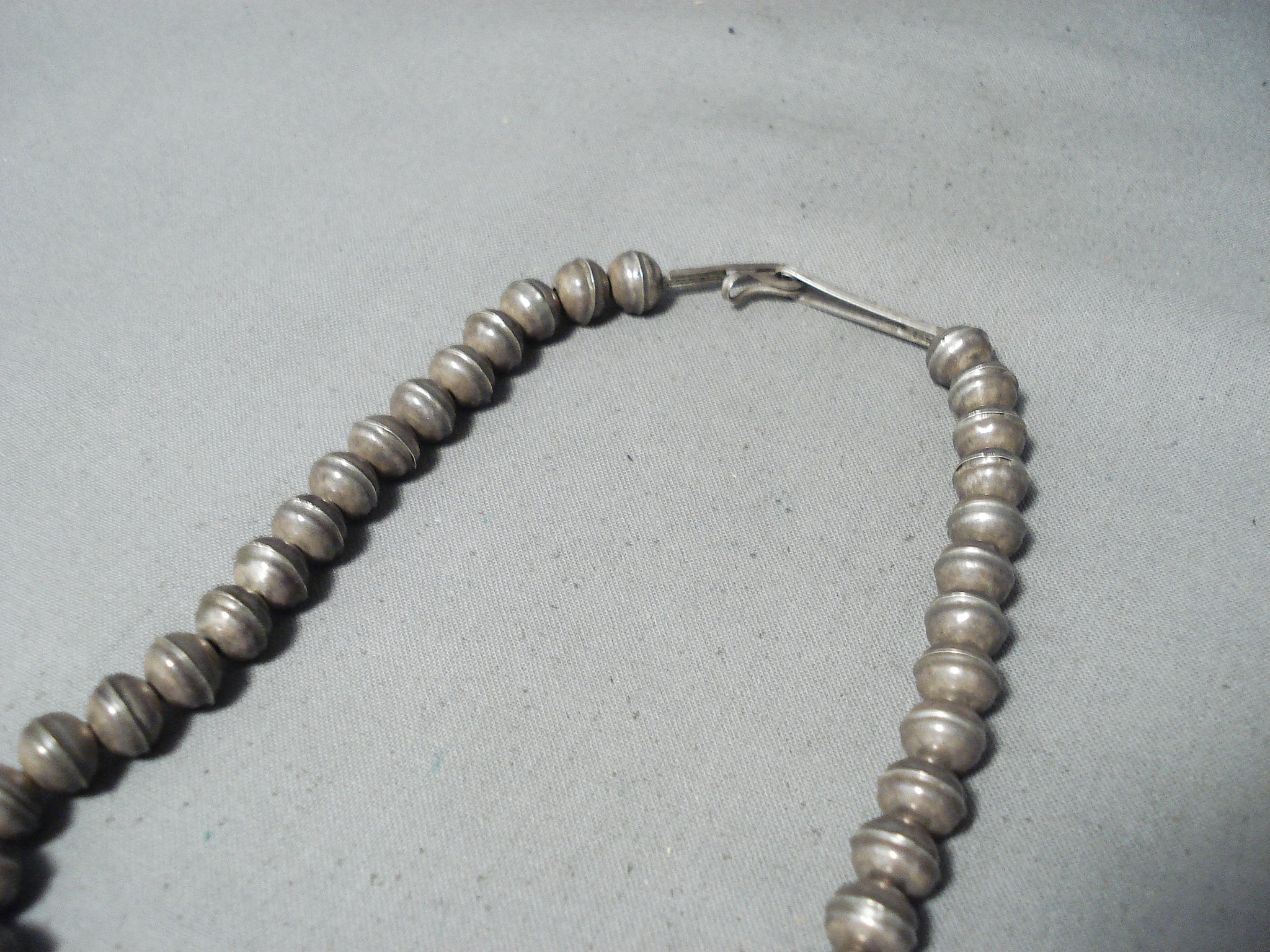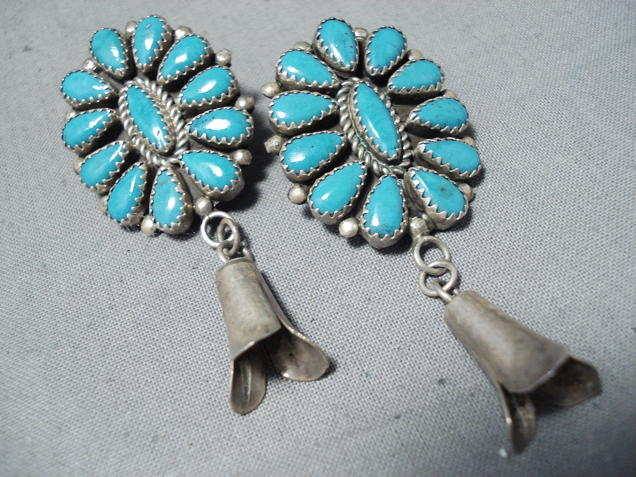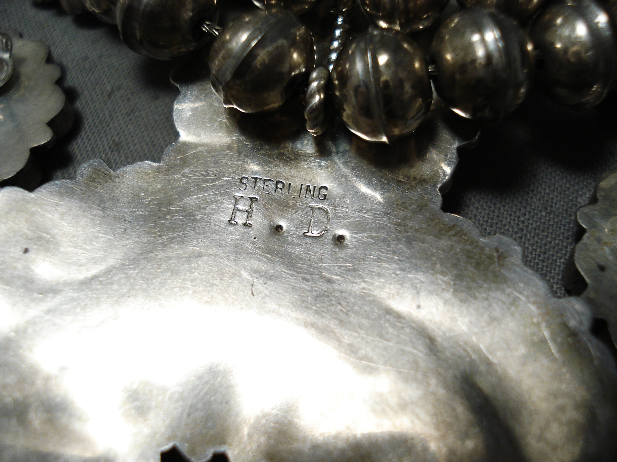 This is a magnificent vintage Navajo turquoise and silver squash blossom necklace and earring set. This remarkable piece contains 12 amazing turquoise cluster silver squash blossoms with a large matching turquoise silver naja pendant. The naja pendant measures around 3-1/4" X 2-1/2". The stones are an amazing teardrop shape that each measure around 1/4" X 1/8". Situated throughout the stones are incredible silver raindrops and ropes. Resting throughout the necklace are large round silver beads with an end traditional silver clasp. Each earring matches the necklace by appearing to be a wonderful squash. The earrings measure around 2-1/4" X 1" and contains more beautiful turquoise stones. Sterling silver, marked. Cir. 1980's+ . Signed by Navajo artist, Henry Davis . The length of the necklace measures around 33". Sturdy 181 grams.