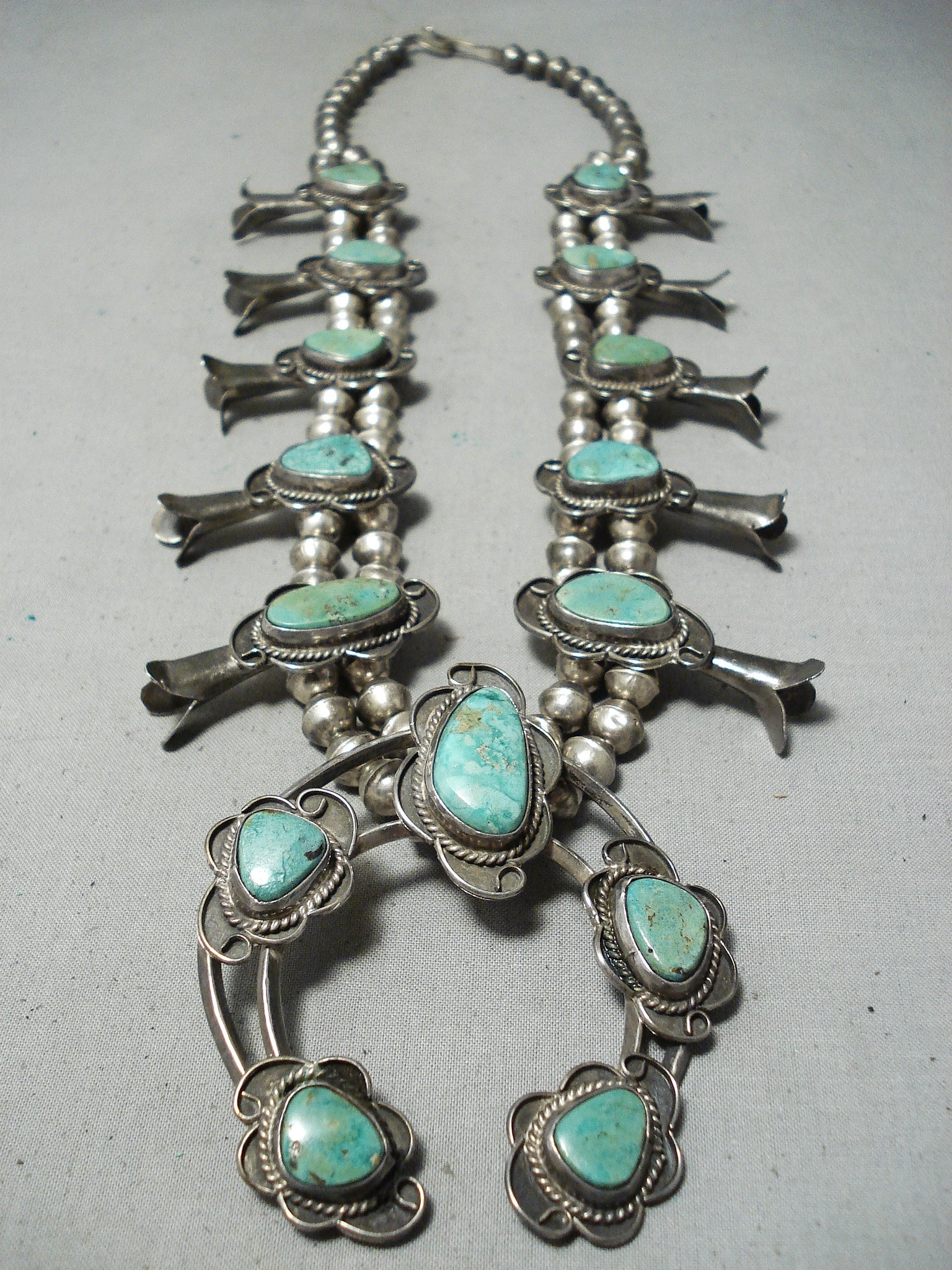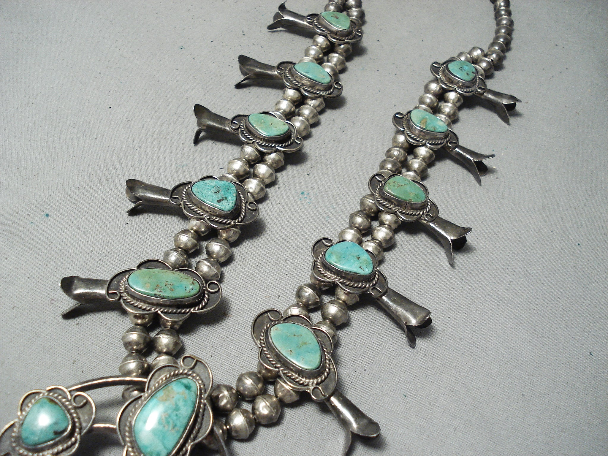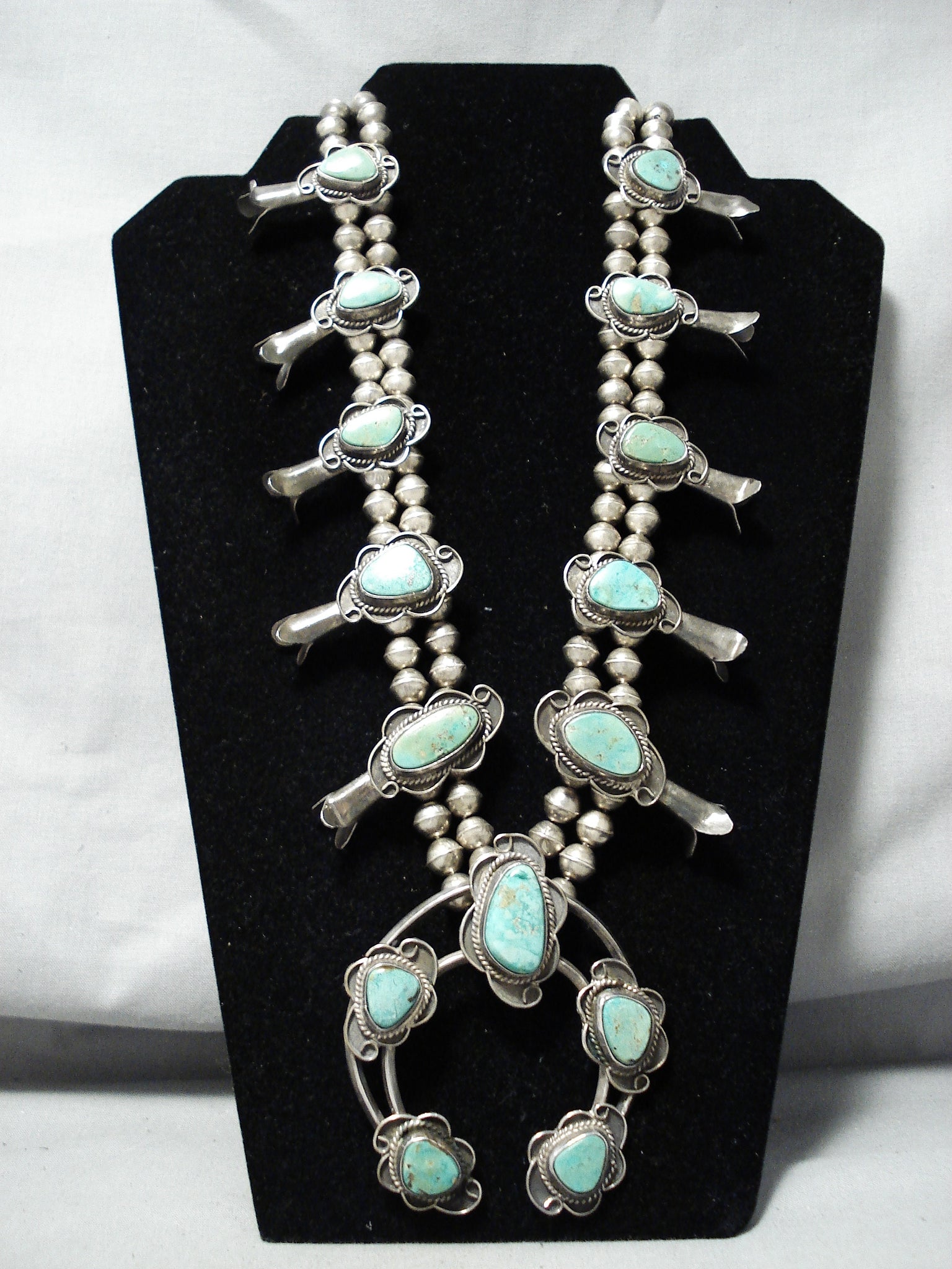 Women's Vintage Native American Navajo Royston Turquoise Sterling Silver Squash Blossom Necklace