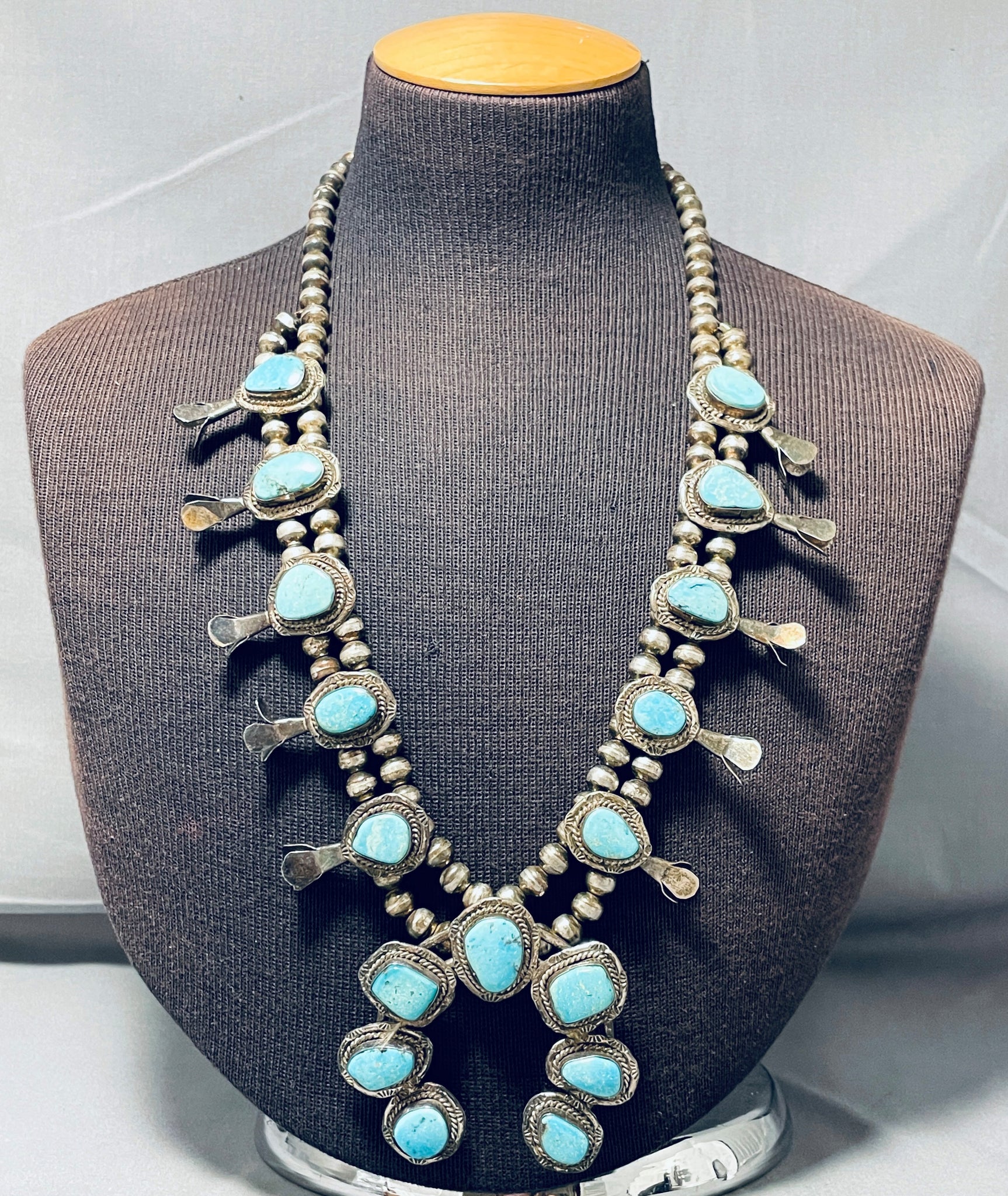 This is a museum quality vintage Navajo turquoise silver squash blossom necklace. This impeccable necklace contains 17 outstanding hand cut chunky blue to green turquoise stones that appear to be from the wonderful Pilot Mountain turquoise mine. Surrounding each stone are incredible silver ropes with accenting sun patterns. The necklace contains 10 phenomenal silver squashes and a beautiful double silver shank naja pendant. The naja pendant measures around 2-3/4" X 3". Running up the rest of the necklace are incredible hand wrought round silver beads with a traditional silver clasp. The average stone measures around 3/4" X 1/2". Sterling silver. Cir. Mid century . The length of the necklace measures around 29". Sturdy 156 grams.