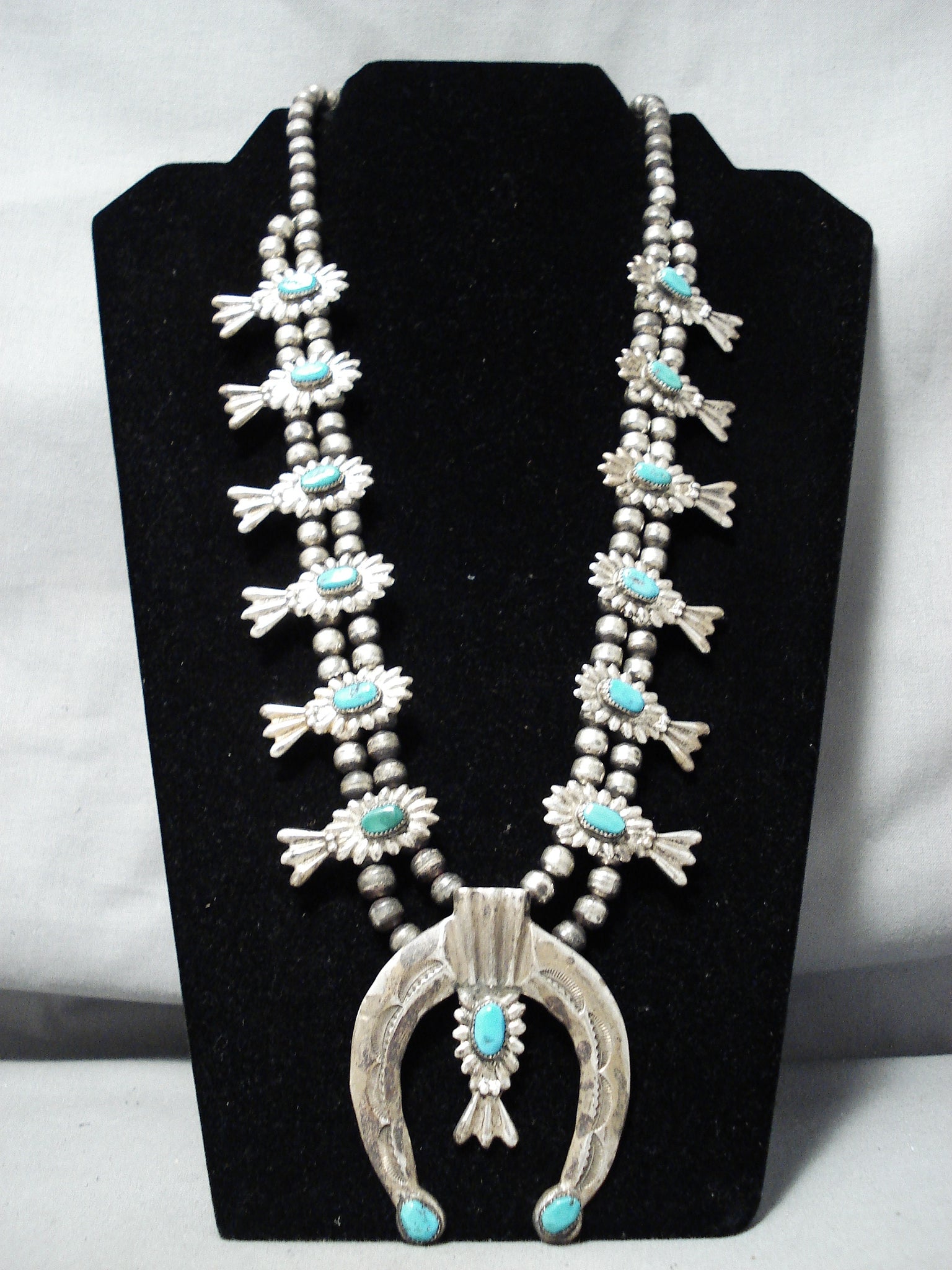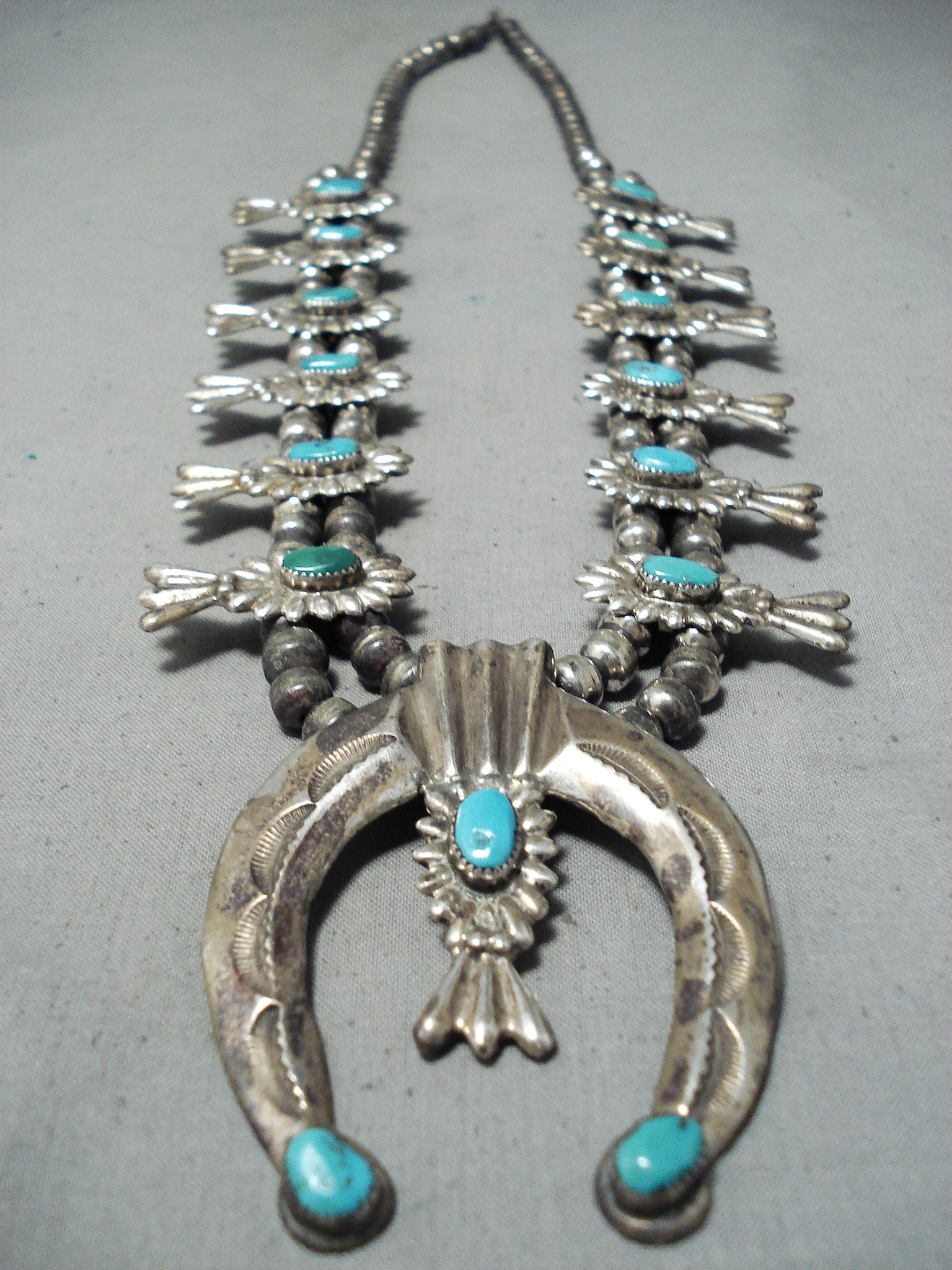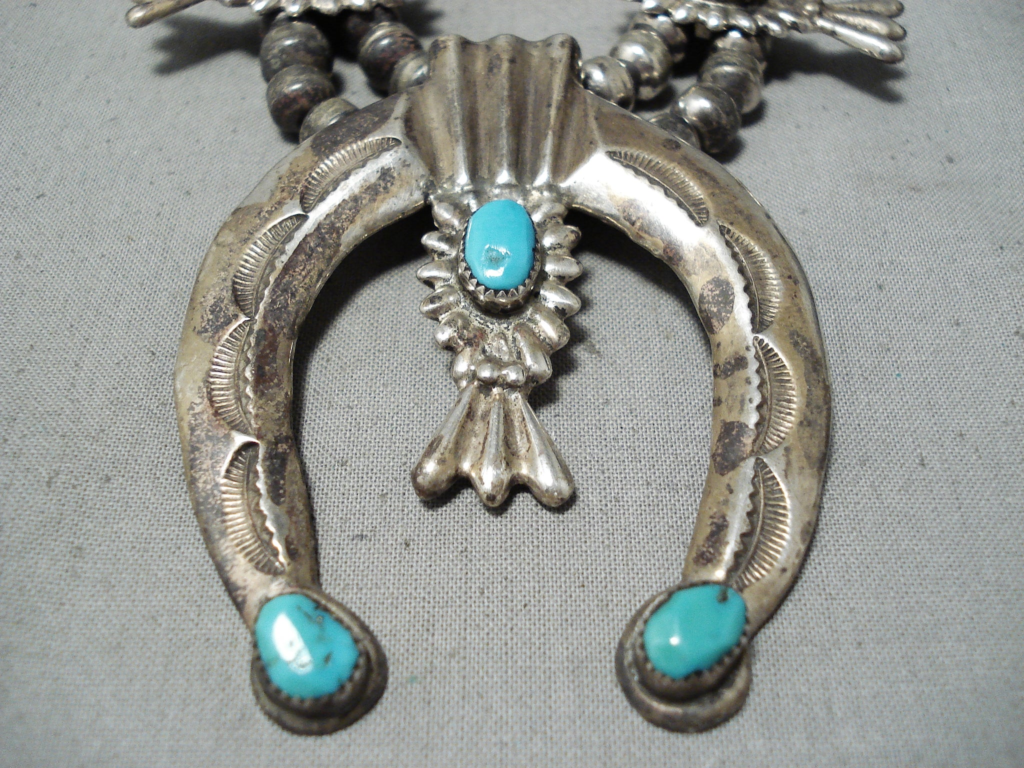 Women's Vintage Native American Navajo Turquoise Sterling Silver Squash Blossom Necklace