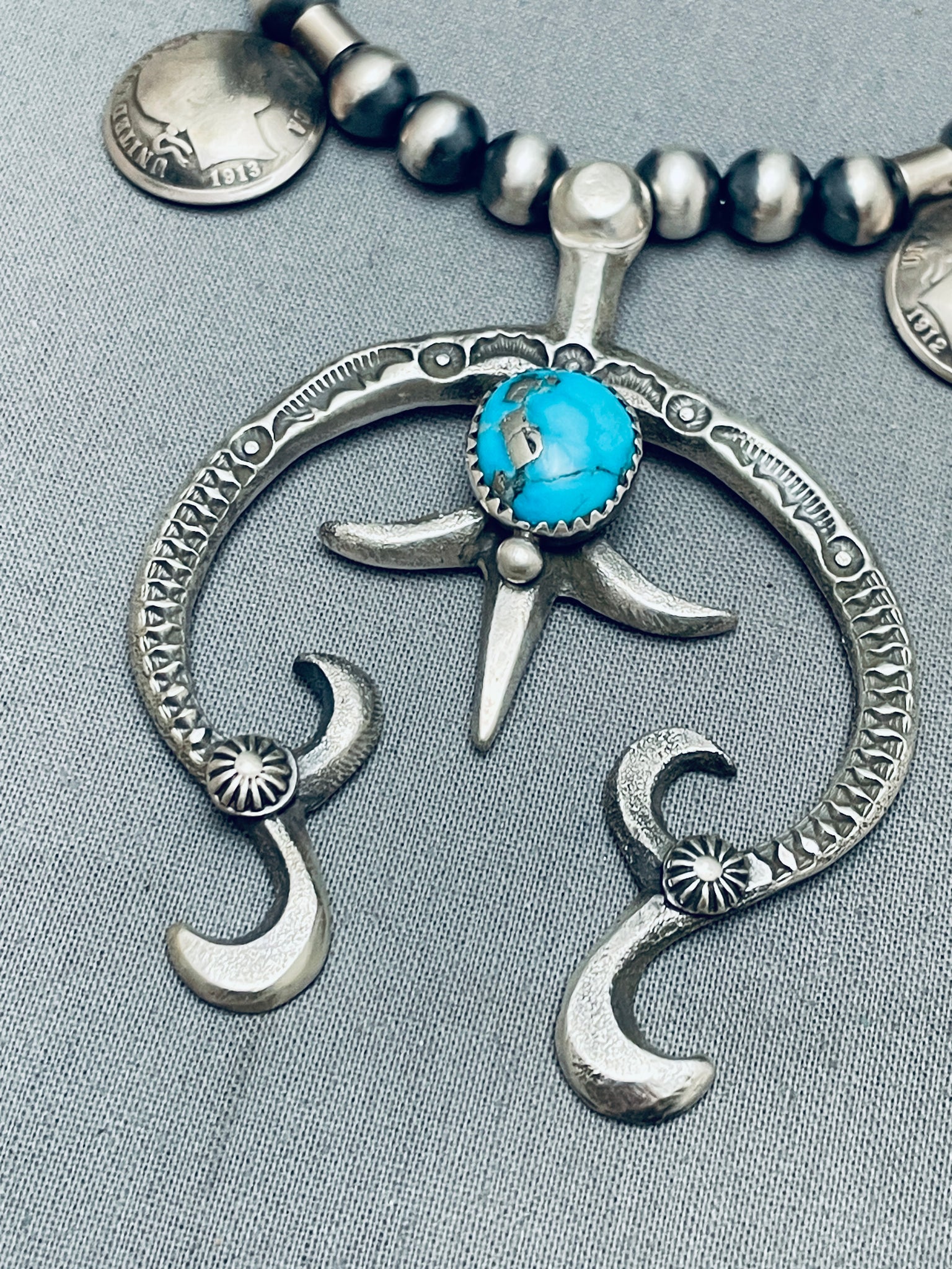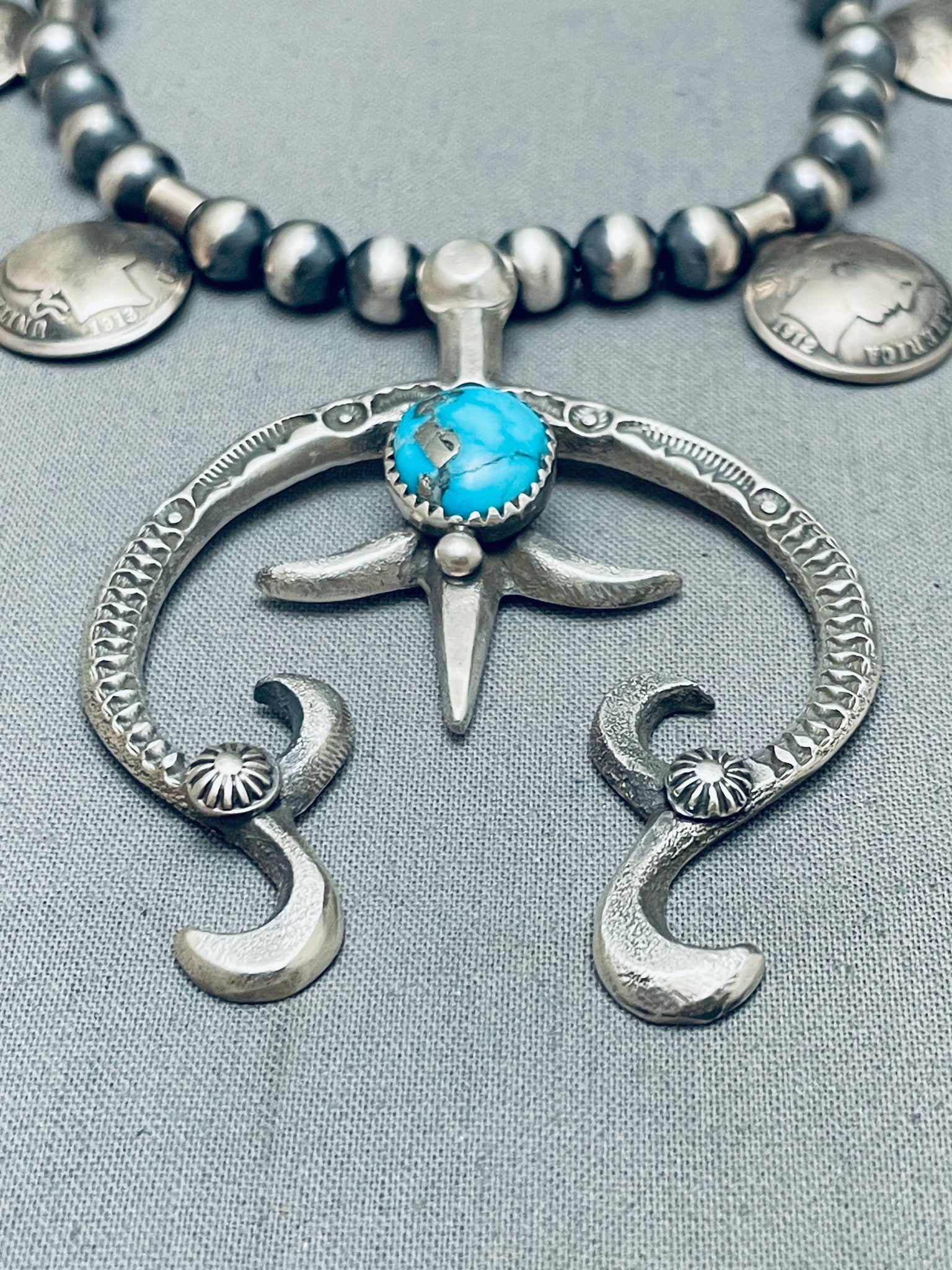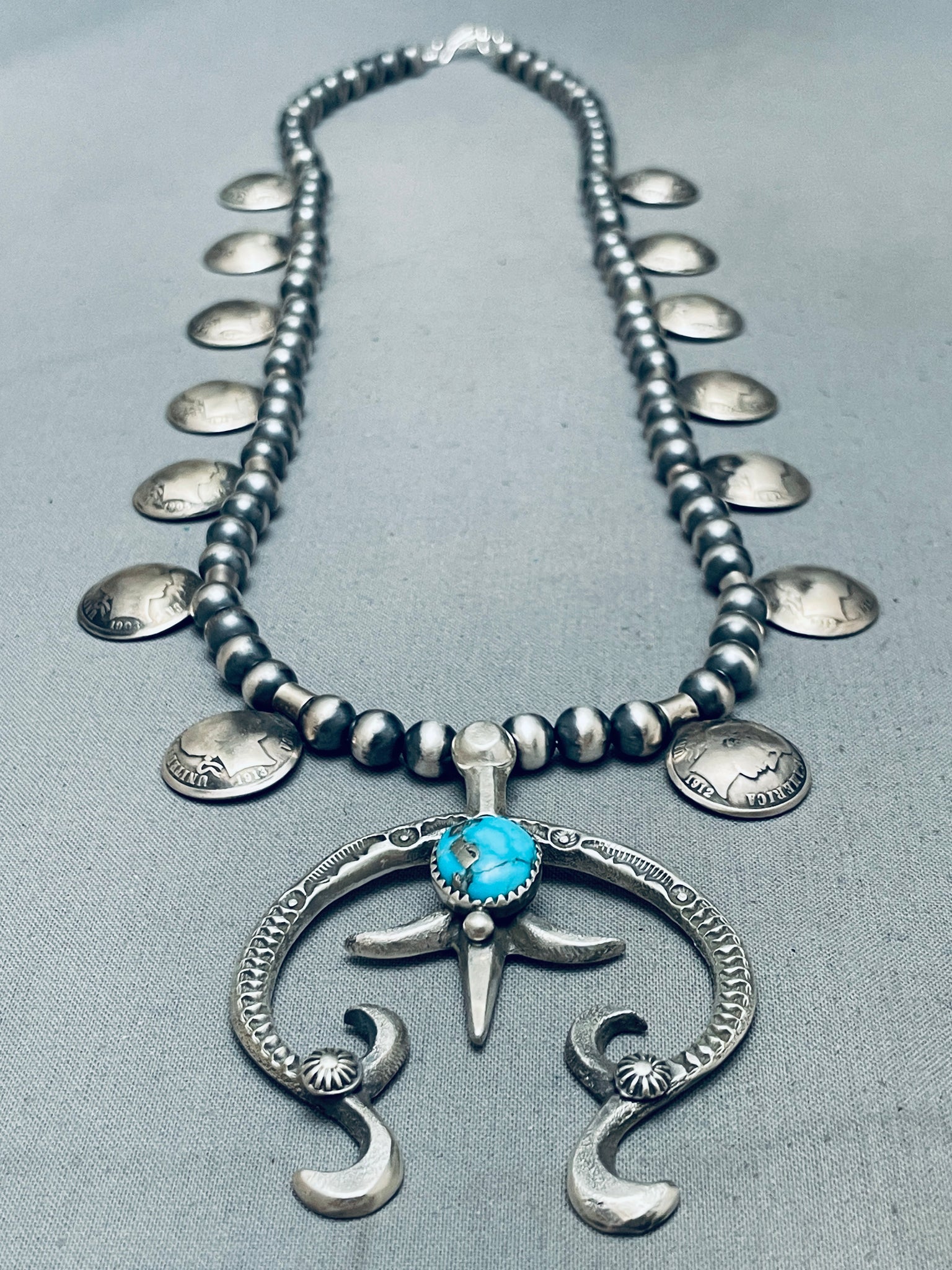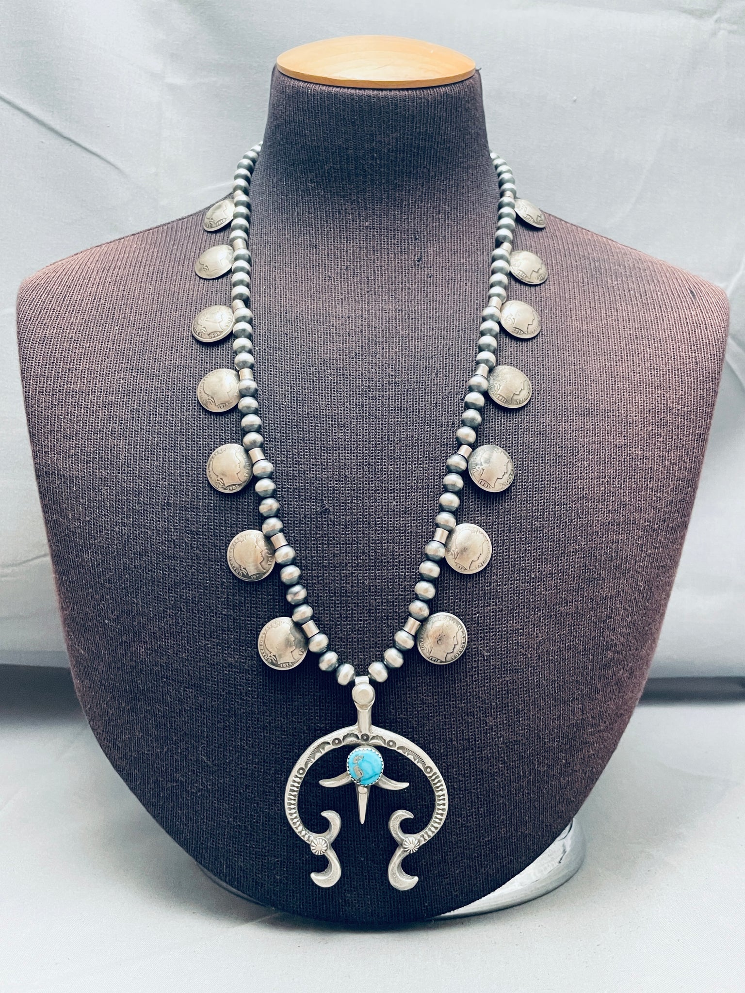 Womens Vintage Native American Navajo Turquoise Sterling Silver Squash Blossom Necklace