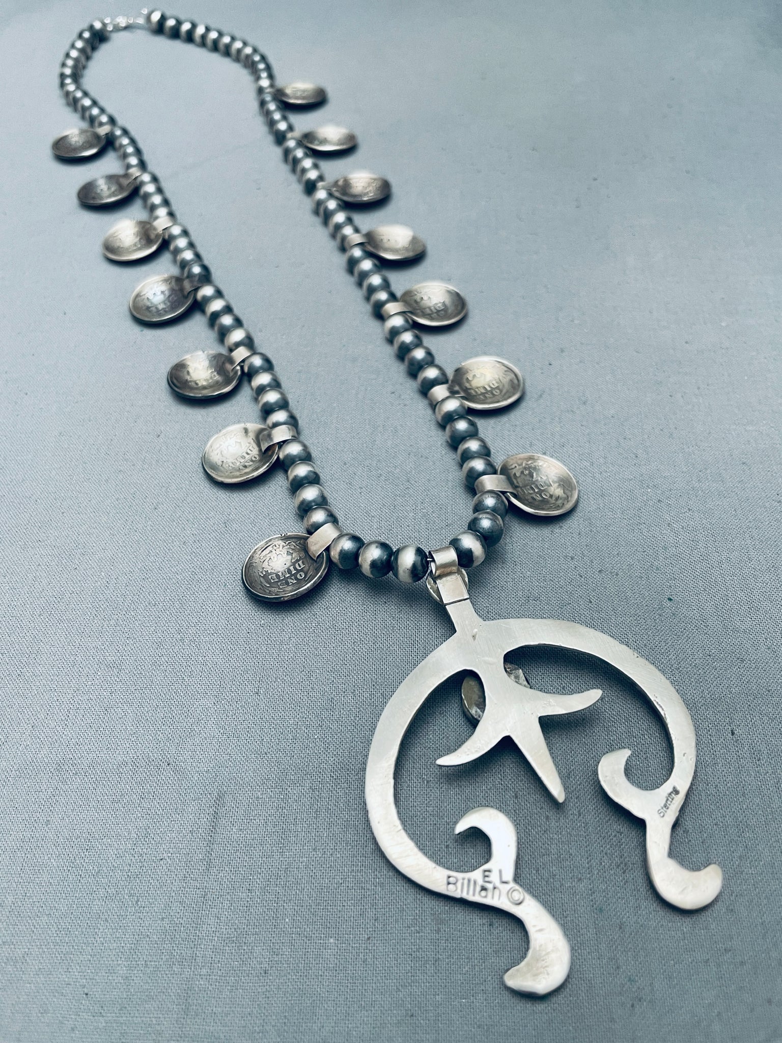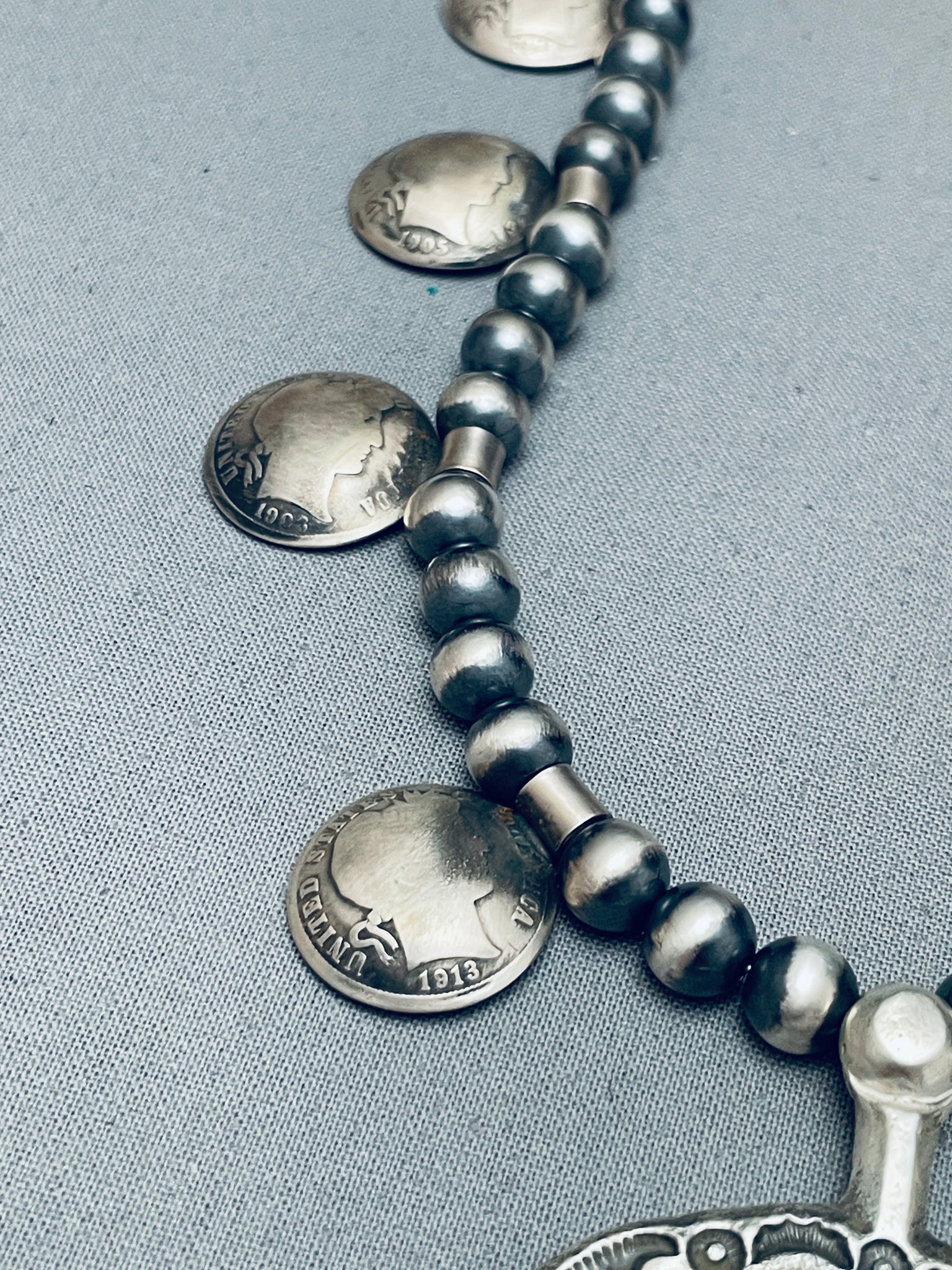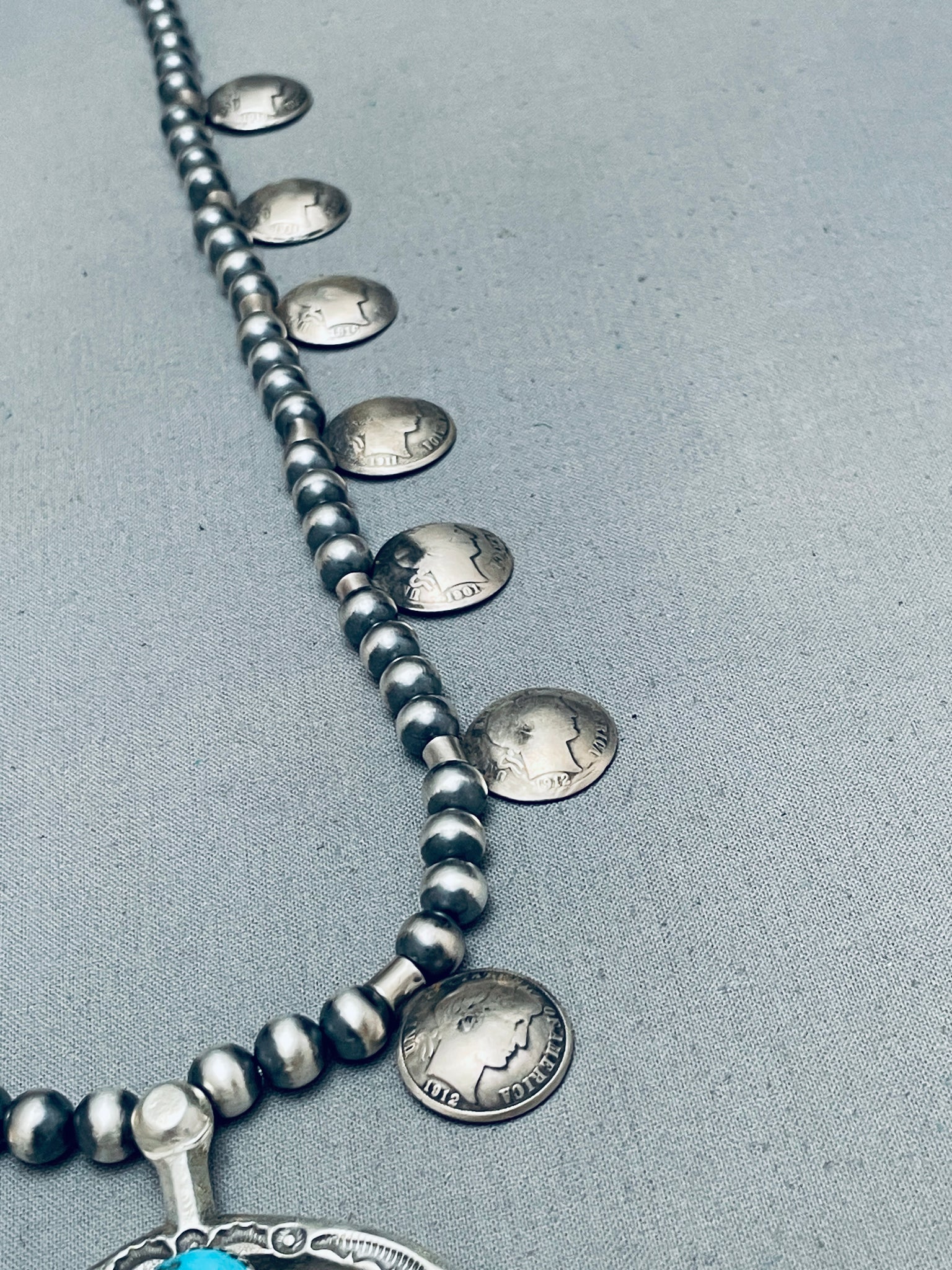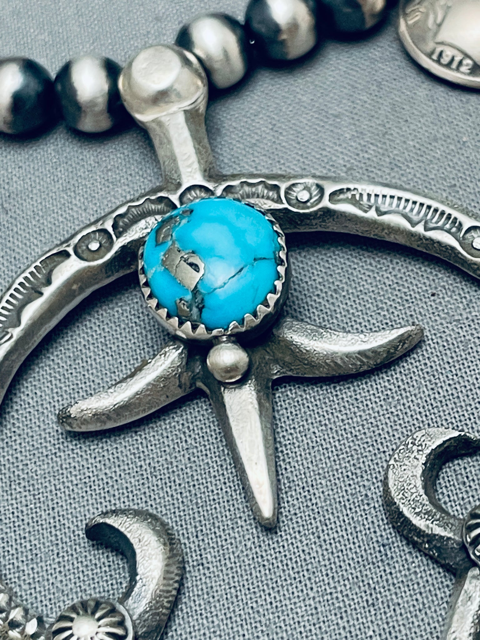 Womens Vintage Native American Navajo Turquoise Sterling Silver Squash Blossom Necklace