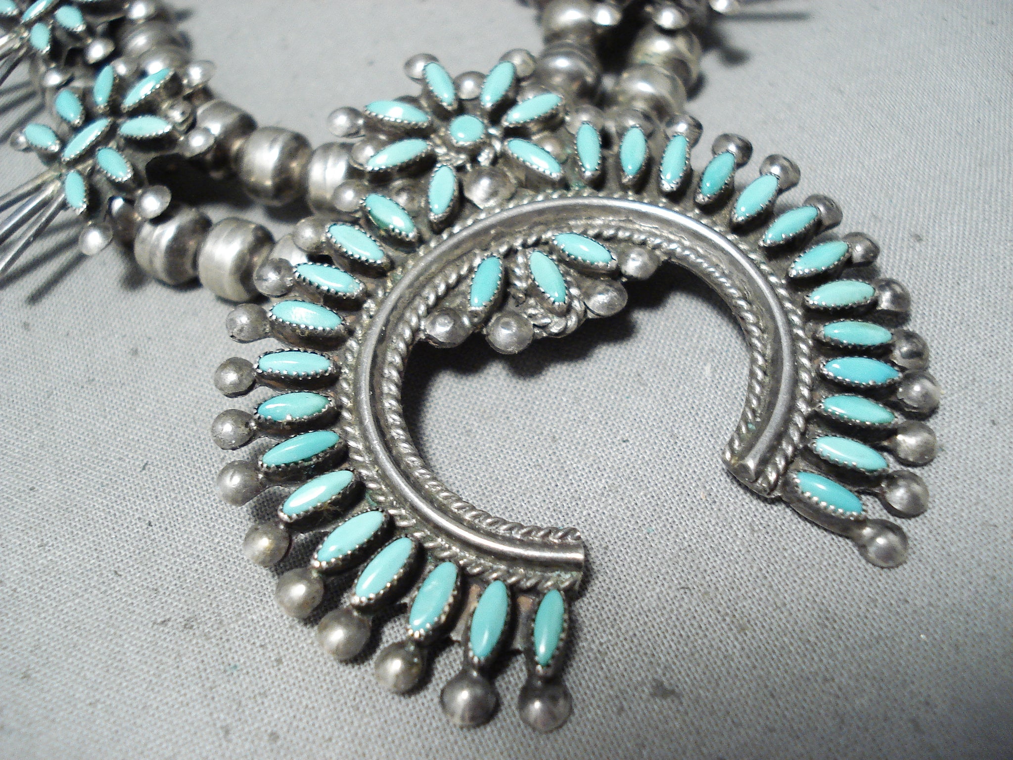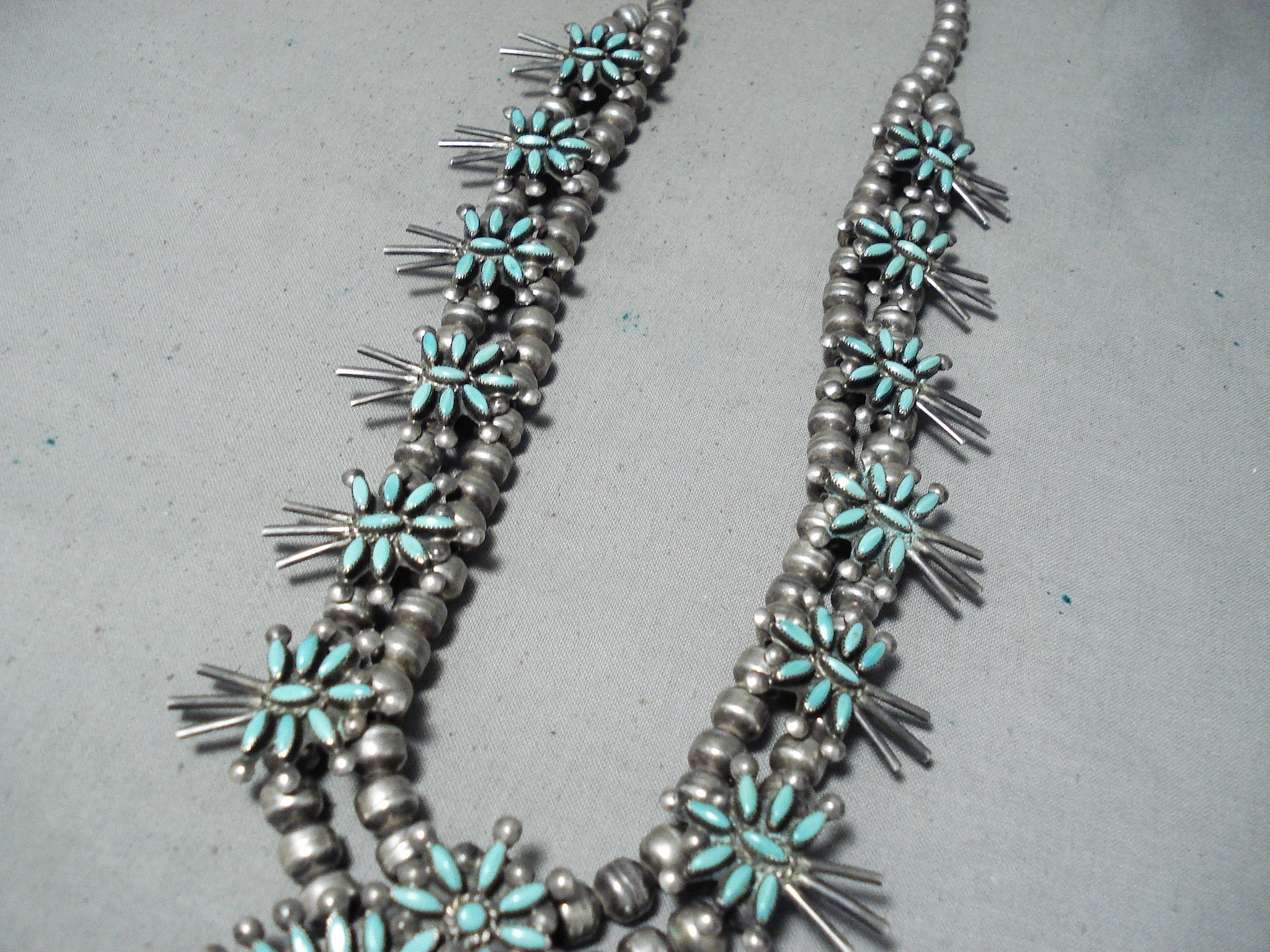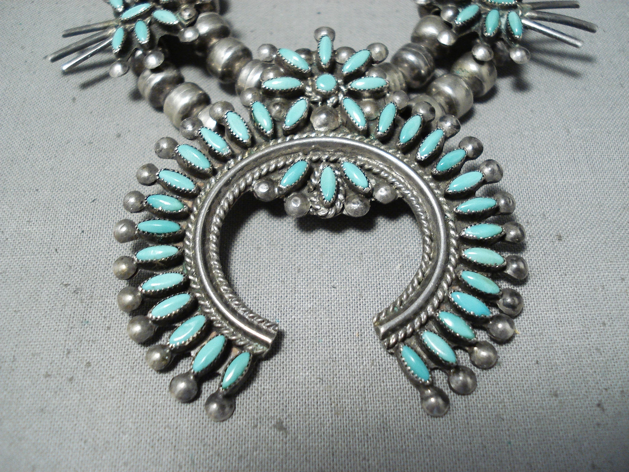Women's Vintage Native American Zuni Turquoise Sterling Silver Squash Blossom Necklace Old