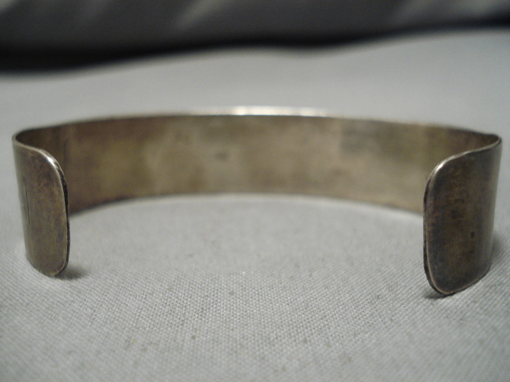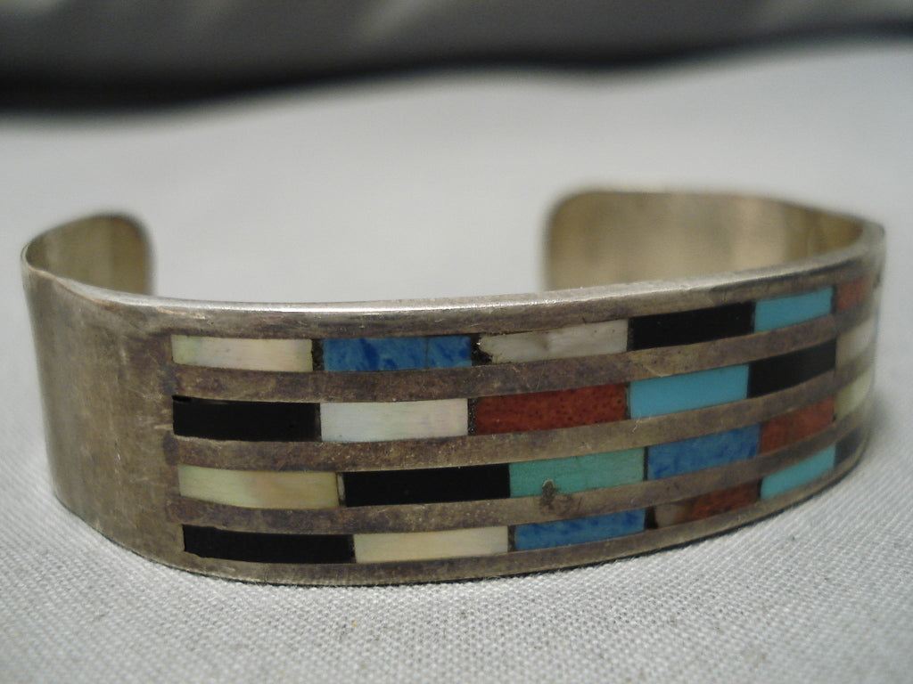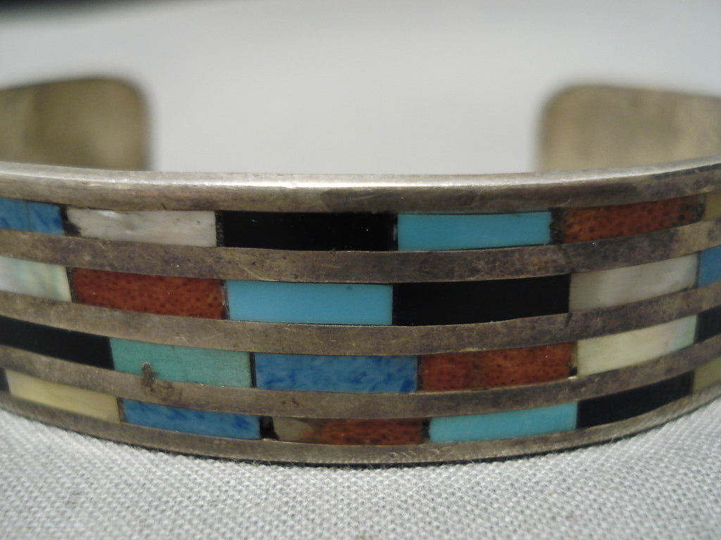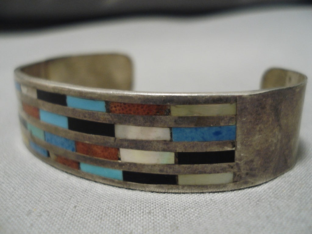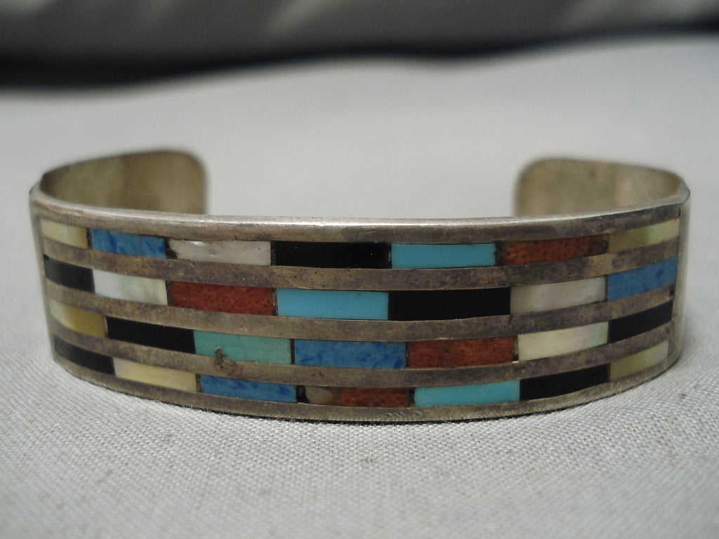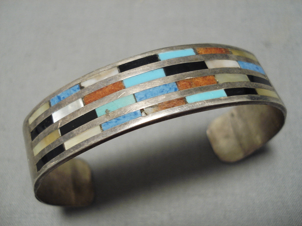 Up for sale is this wonderful vintage Zuni silver bracelet having 4 rows of inlay turquoise, coral, jet and mother of pearl all across the handcarved solid silver cuff! Simply Stunning! The width of the bracelet measures around 5/8". Signed by Zuni artist, A. Celician. Sterling silver. The inside end to end measures around 5-1/4" with an additional 1-1/2" gap. Sturdy 20 grams.