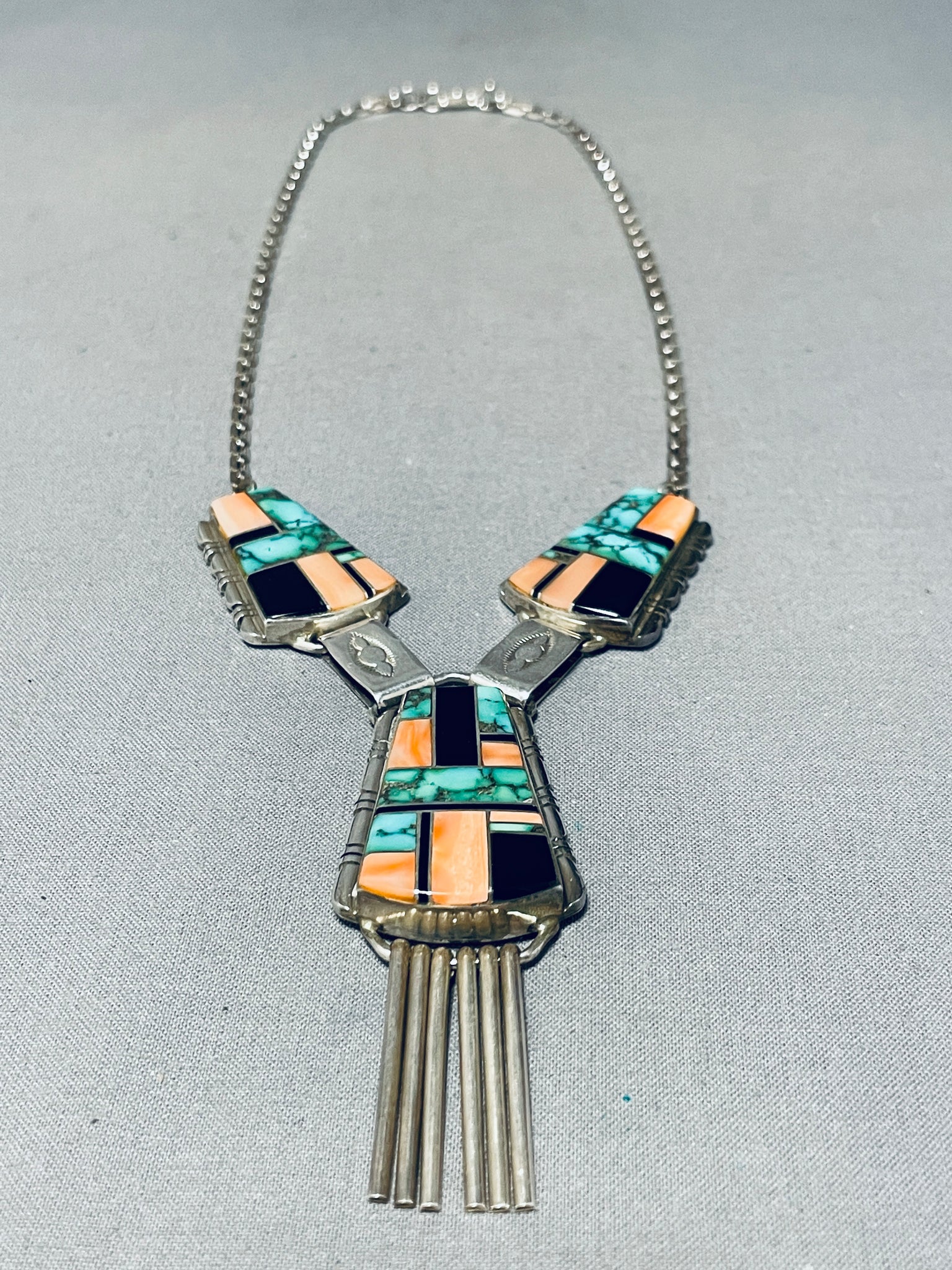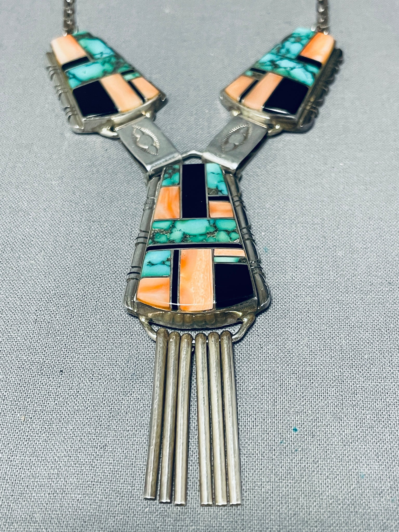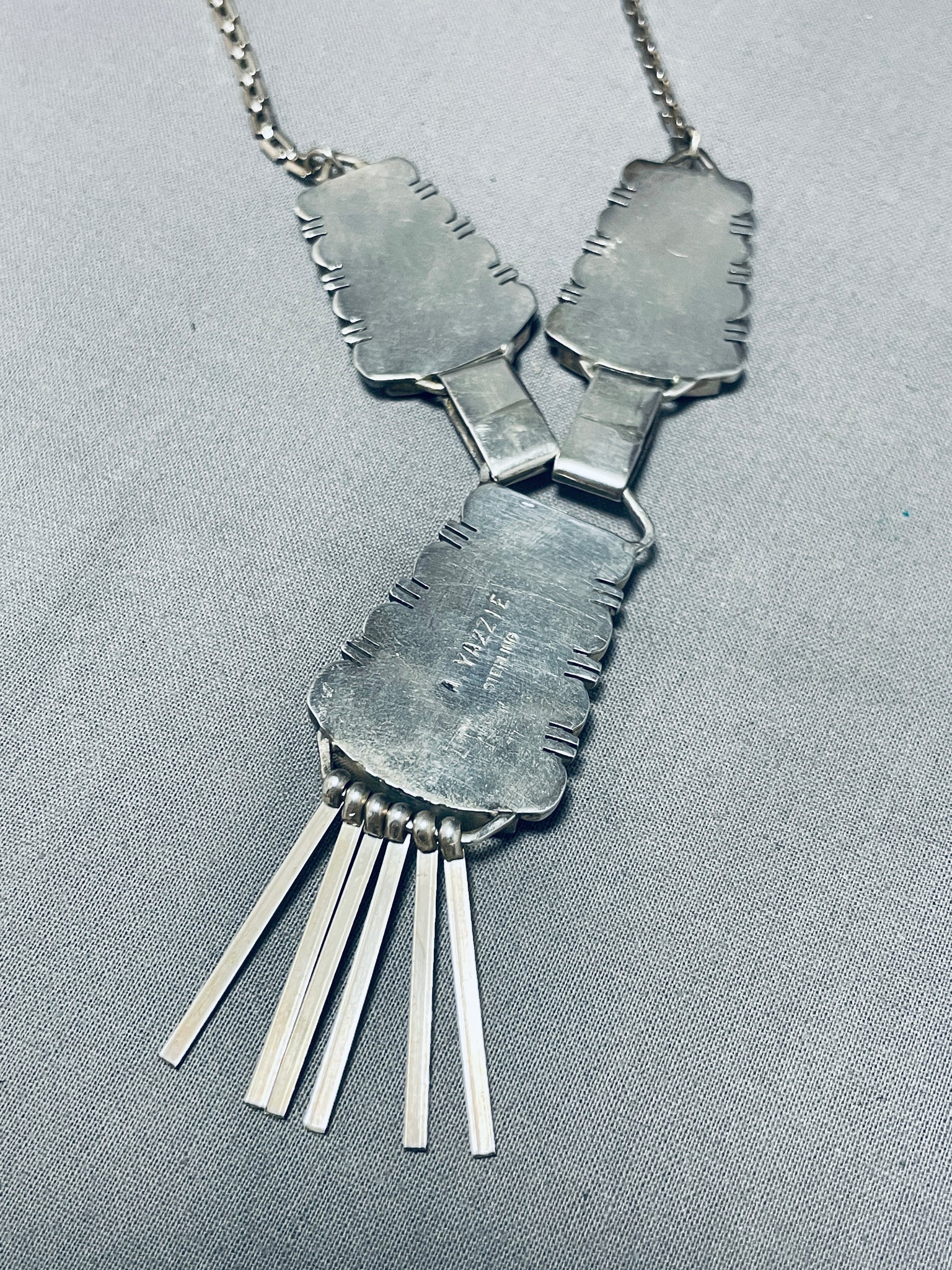 Yazzie Vintage Native American Navajo Inlay Green Turquoise Sterling Silver Necklace