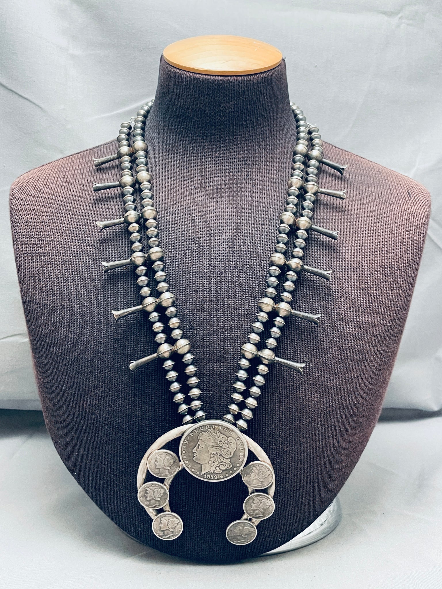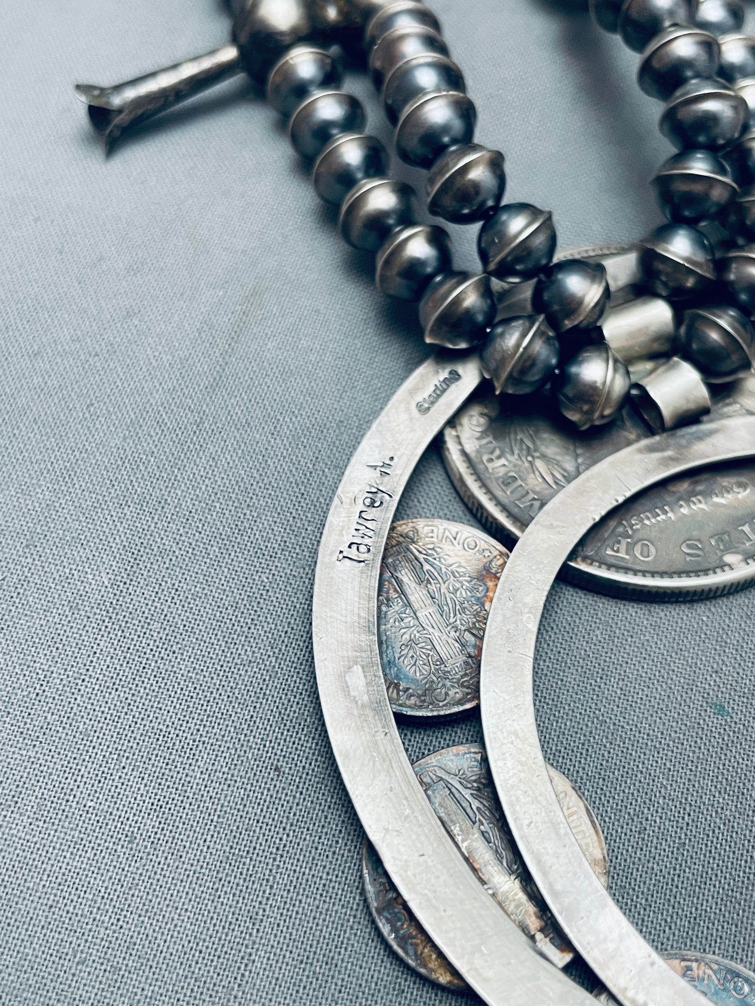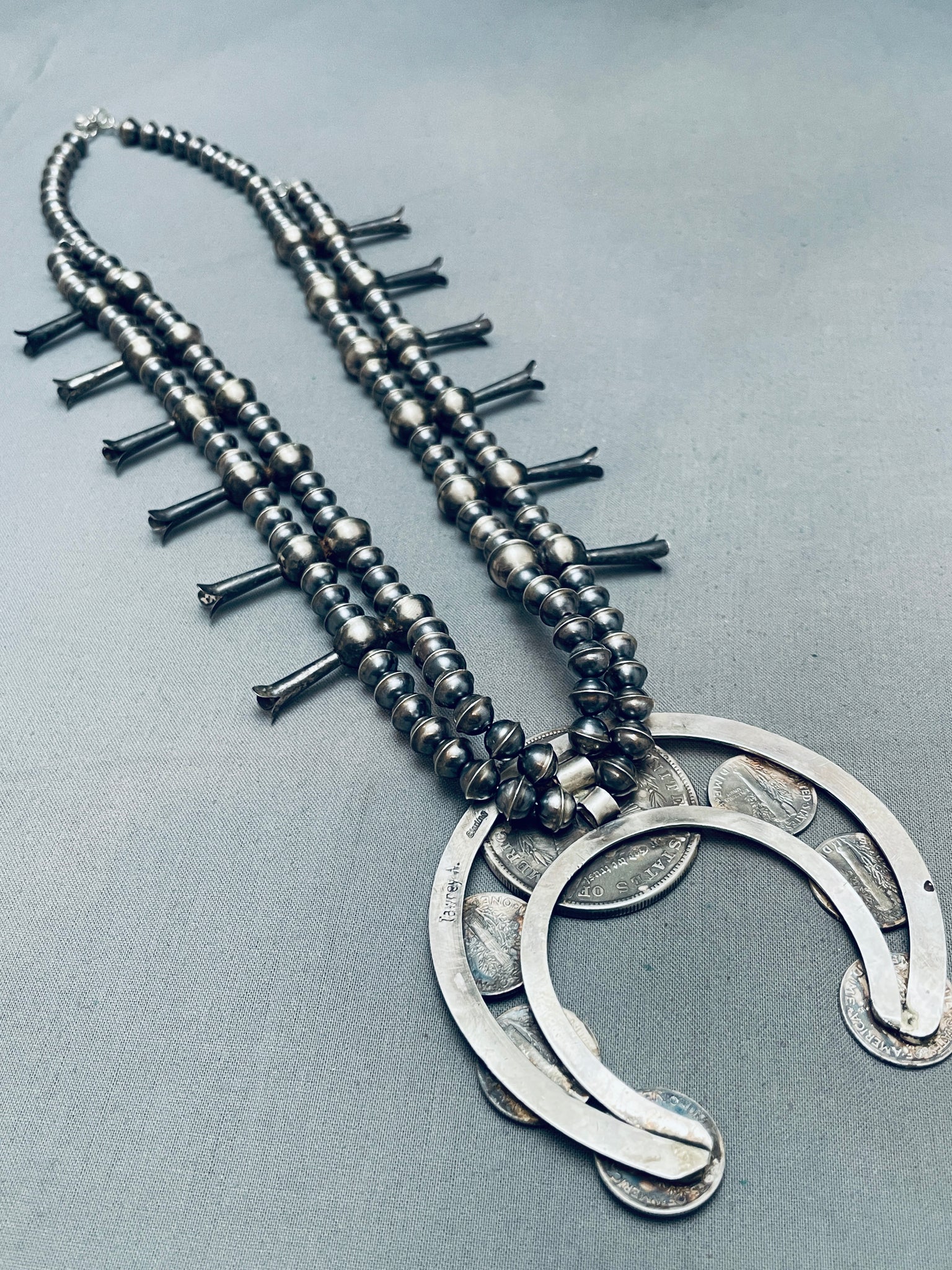 127 Grams Vintage Native American Navajo Sterling Silver Coin Squash Blossom Necklace