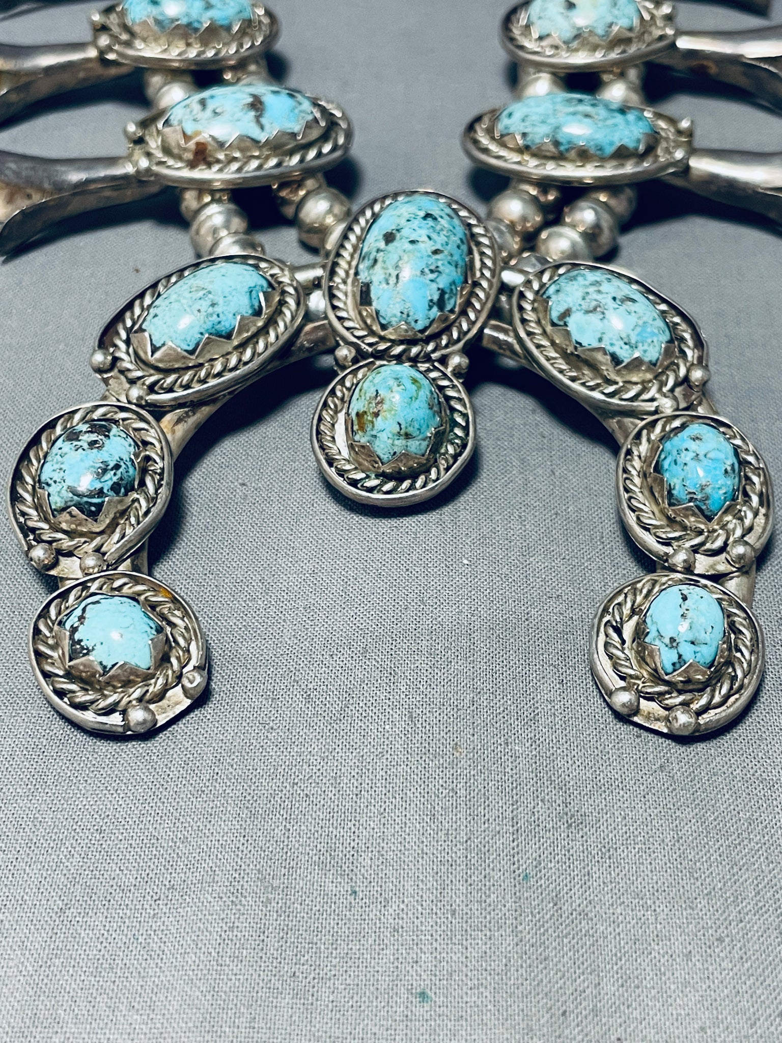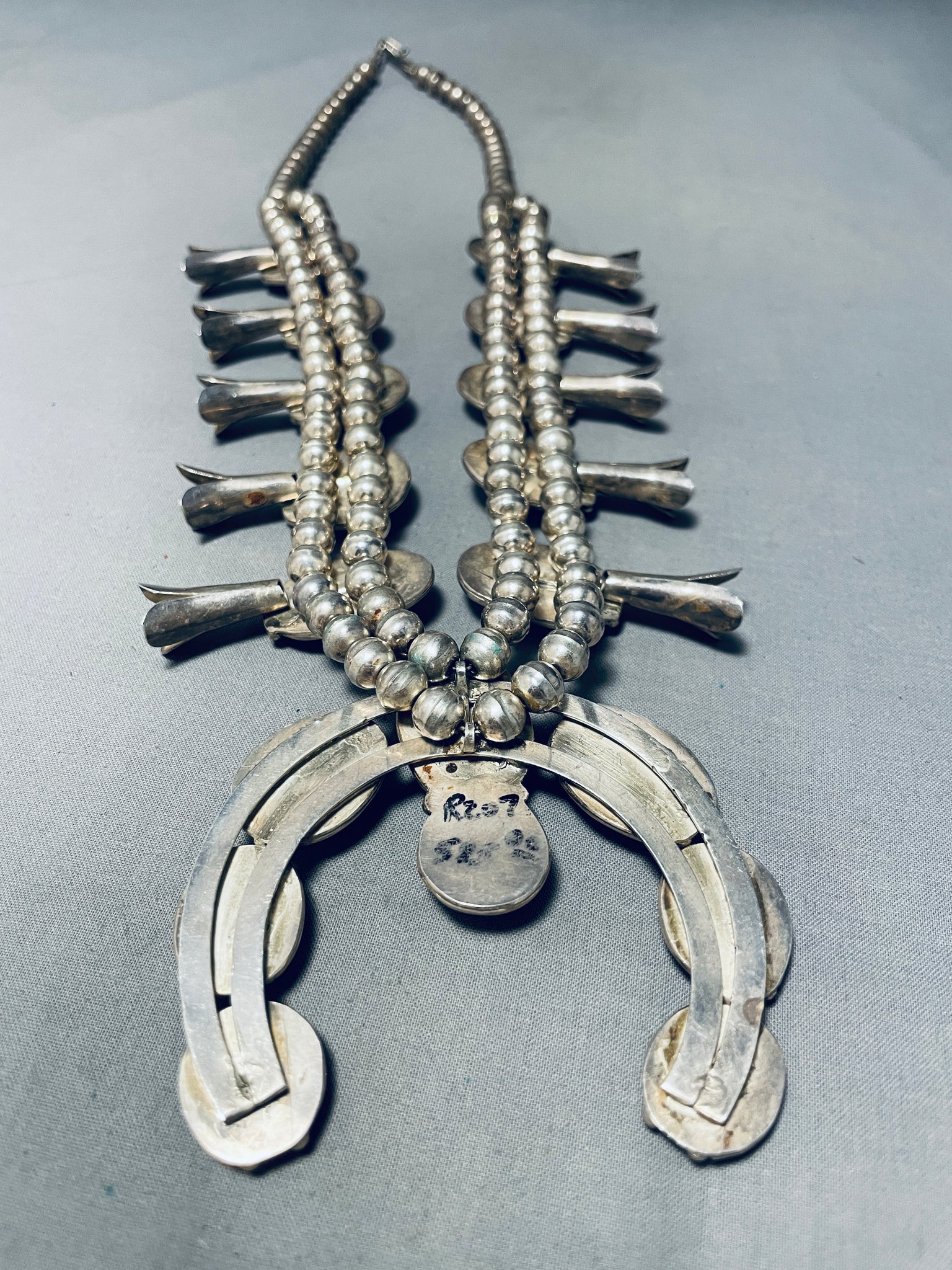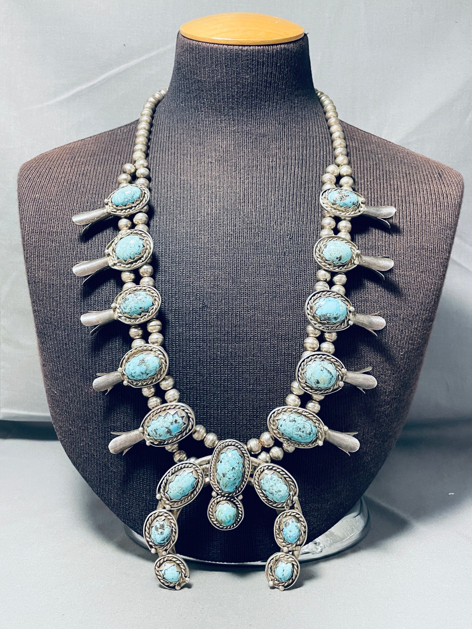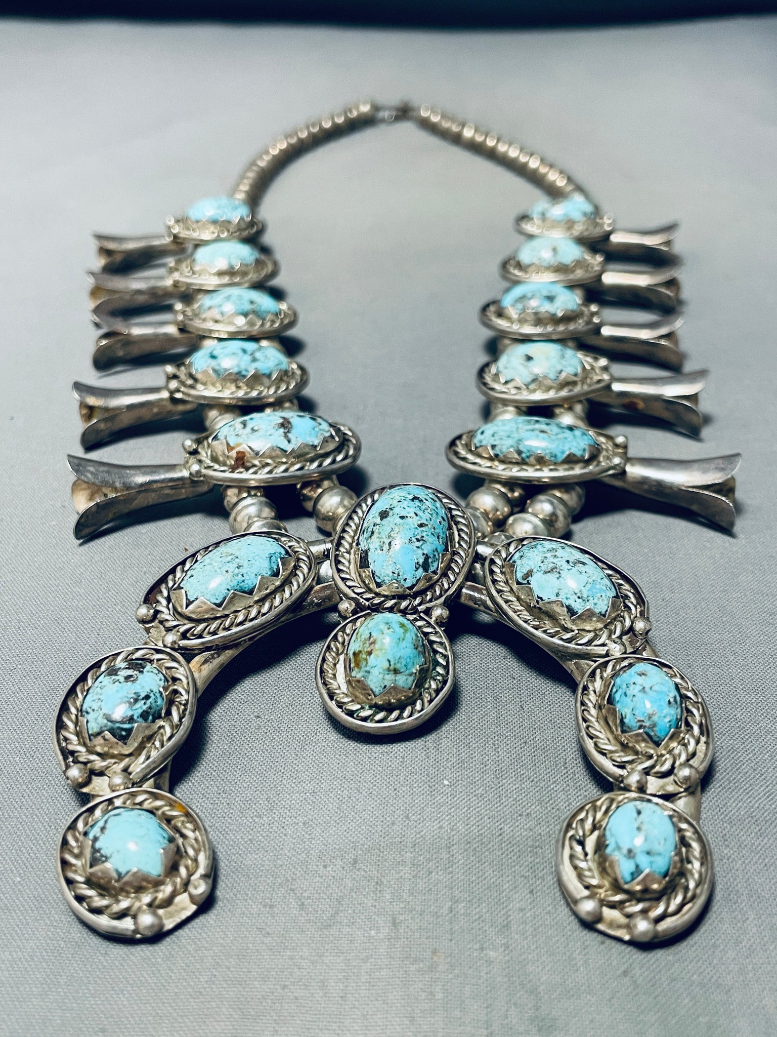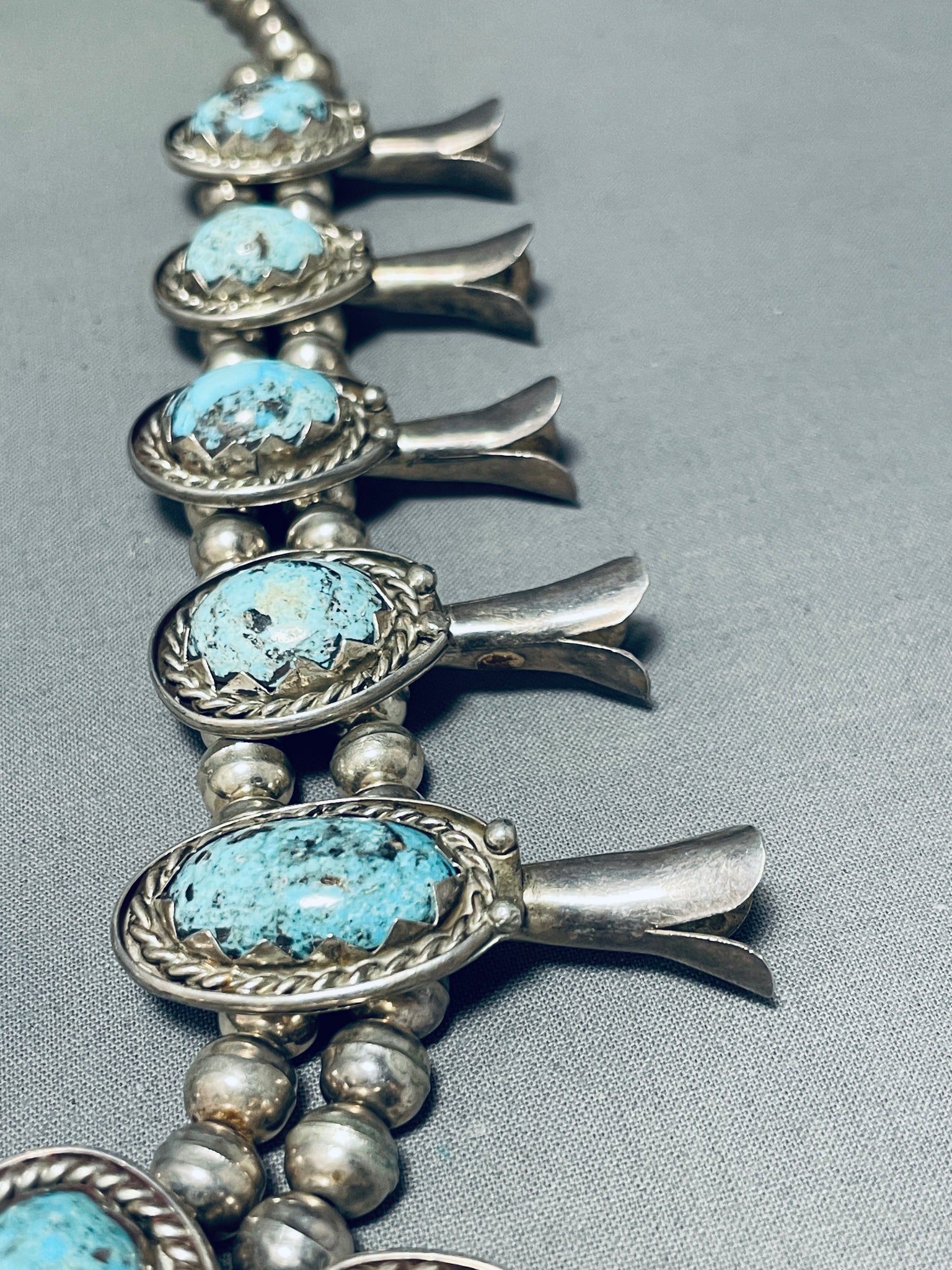 Gasp! Persin Turquoise Vintage Native American Navajo Sterling Silver Squash Blossom Necklace