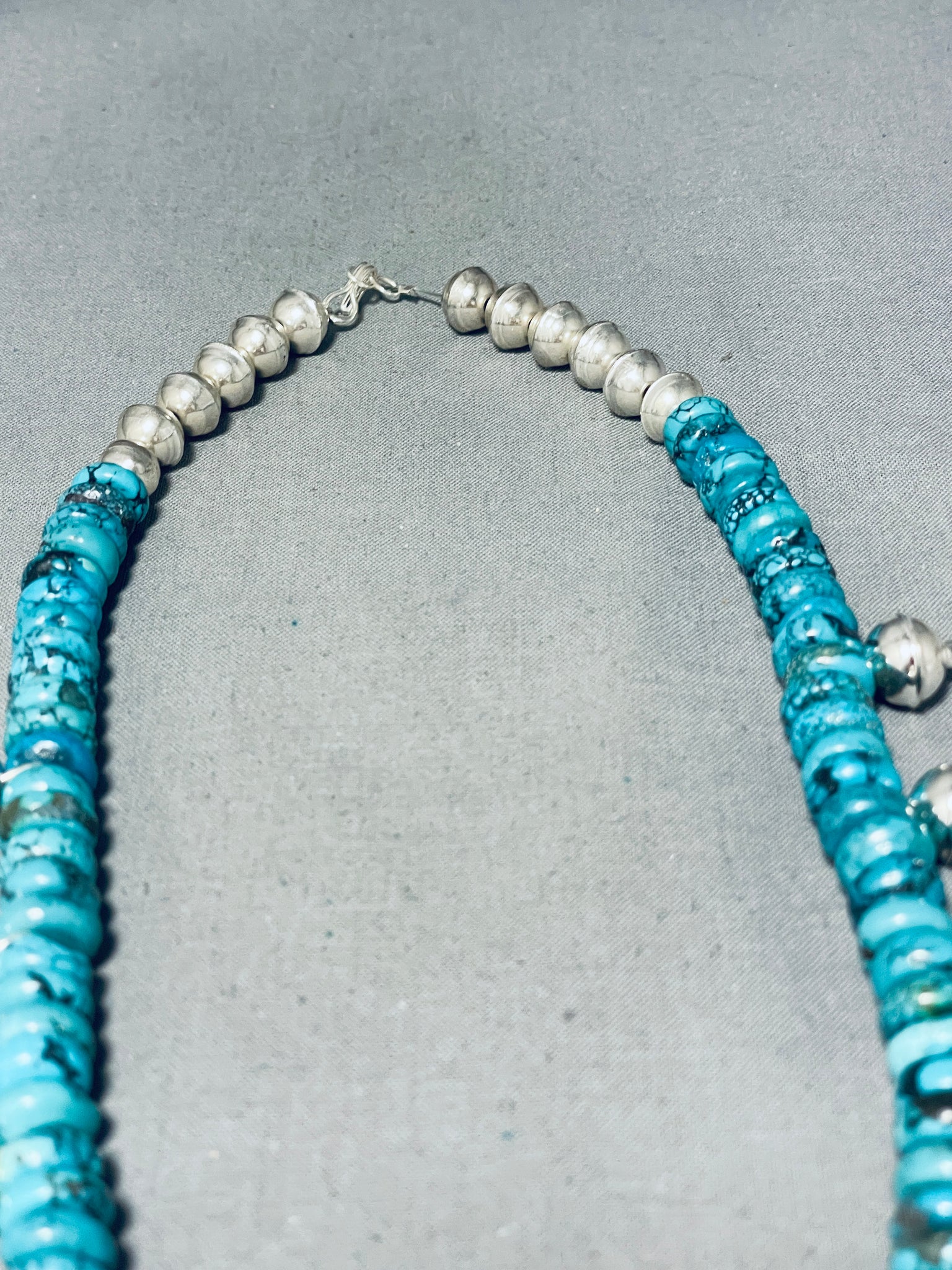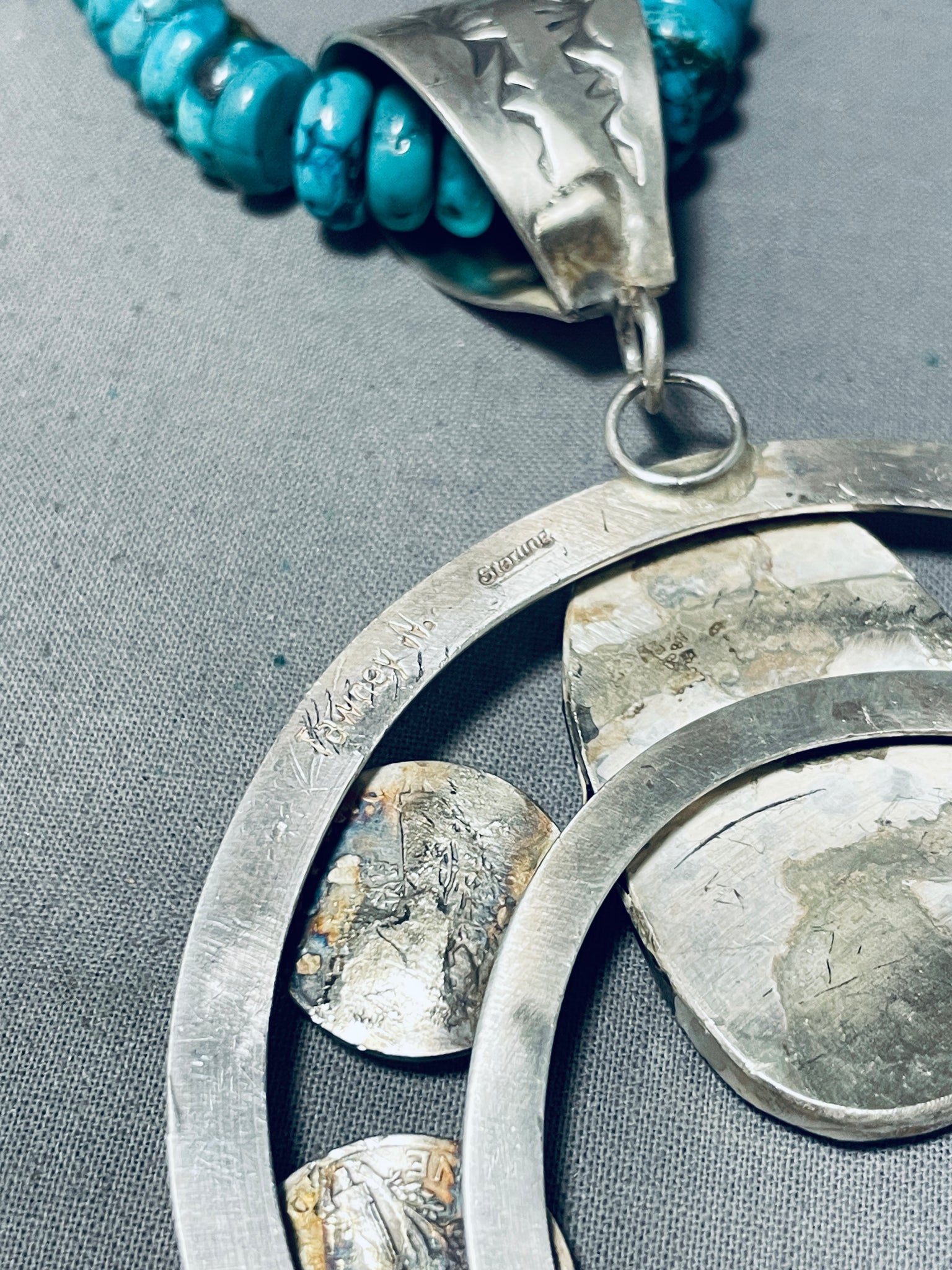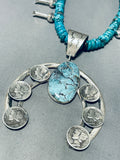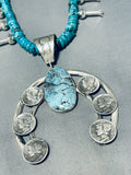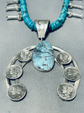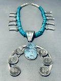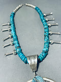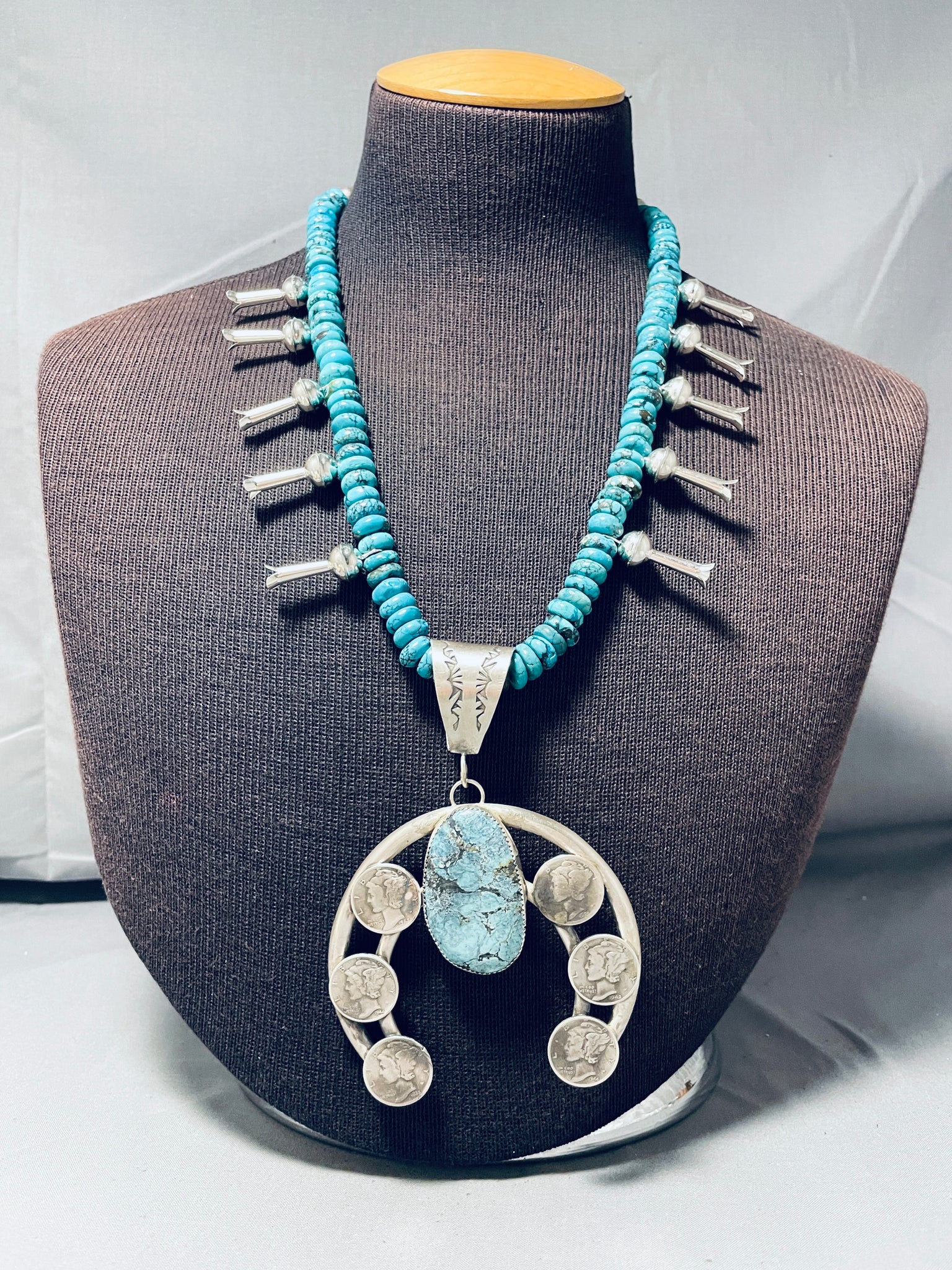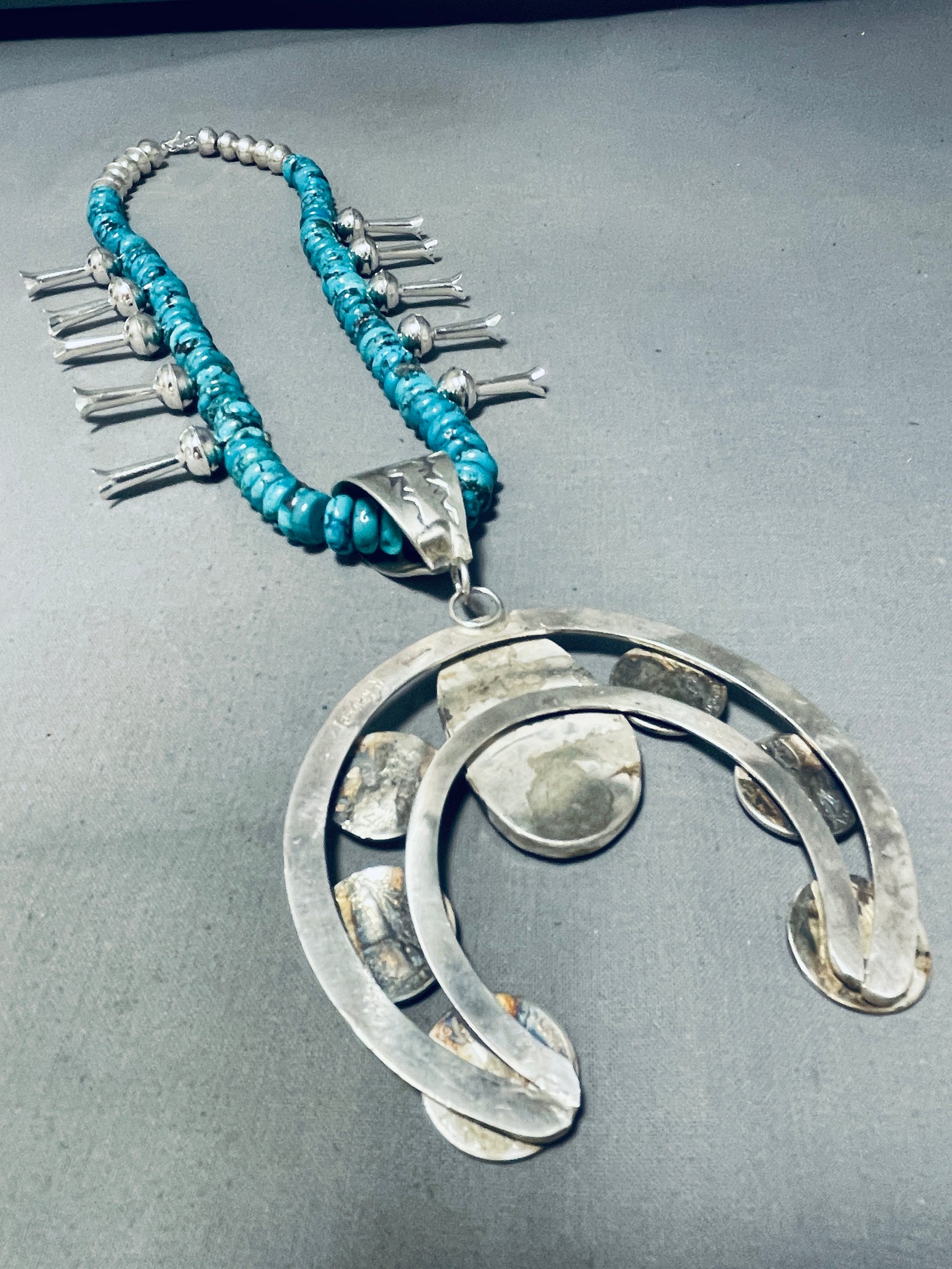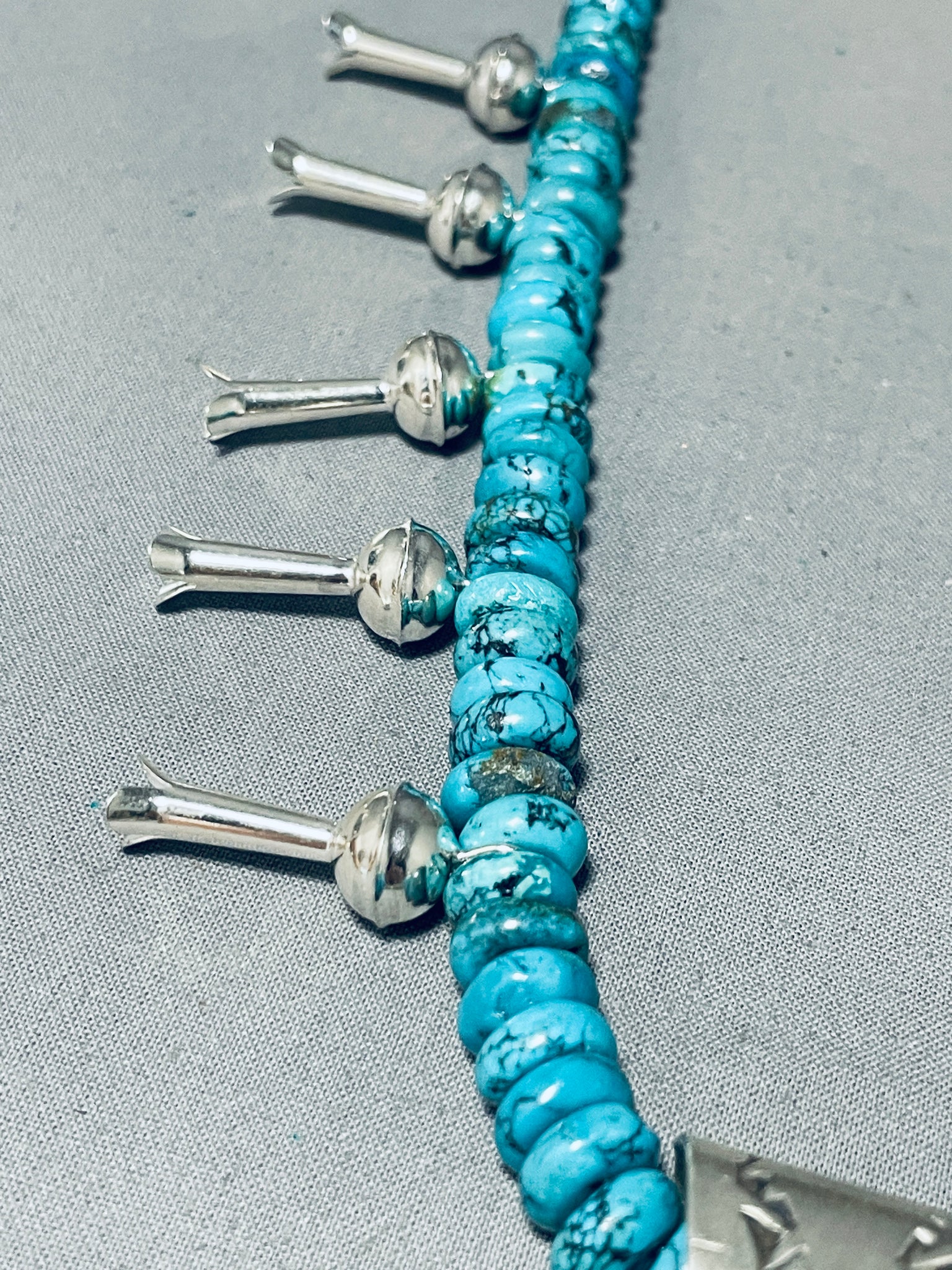 Signed Native American Navajo Blue Diamond Turquoise Sterling Silver Squash Blossom Necklace