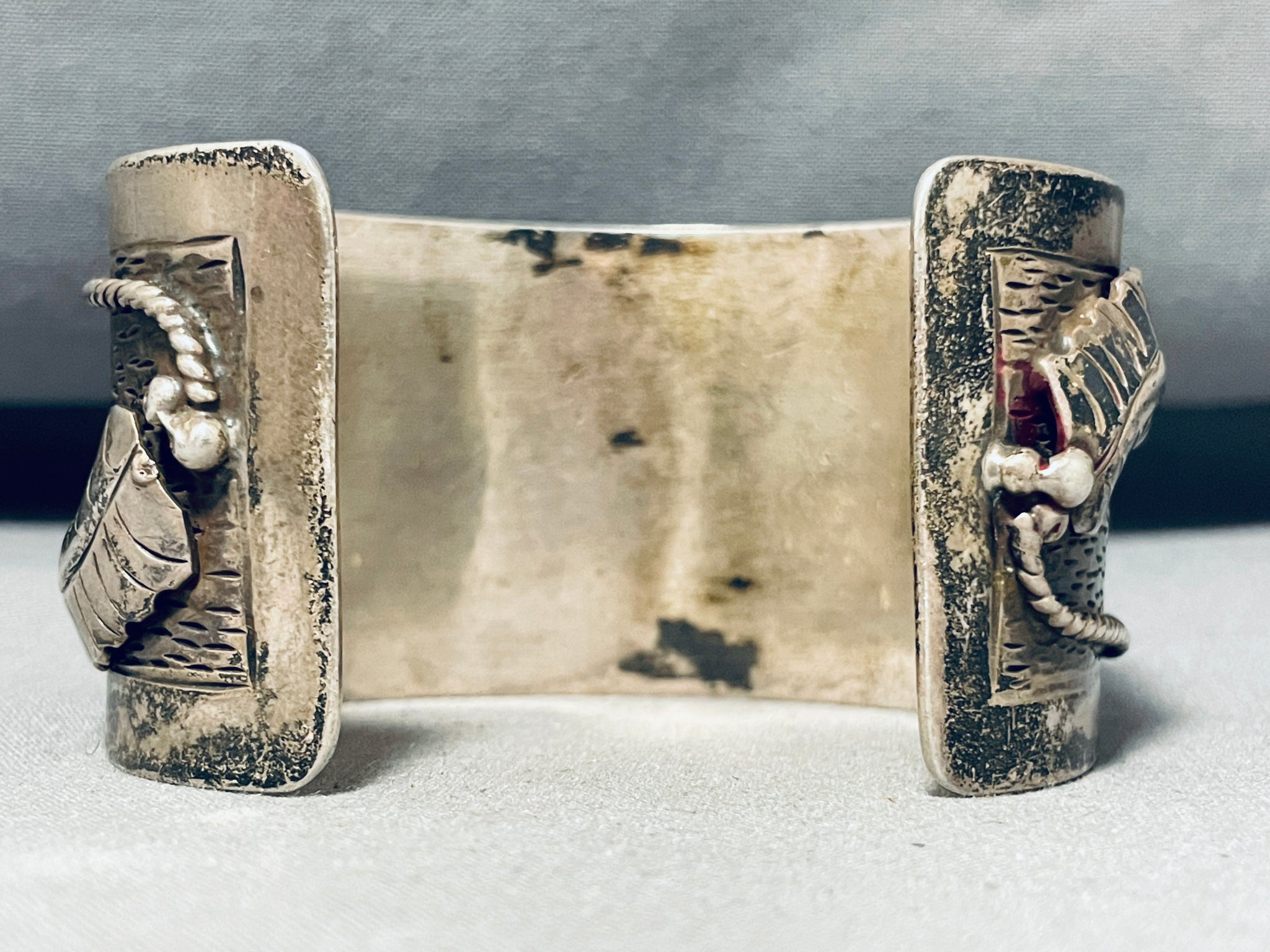 The Morenci and Royston turquoise mines, both located in Nevada and Arizona, are celebrated for their distinctive and high-quality turquoise stones that have left a lasting mark on the world of jewelry. The Morenci mine, situated in southeastern Arizona, is renowned for its deep blue turquoise interspersed with sparkling pyrite inclusions, creating a dramatic and highly sought-after appearance. In contrast, the Royston mine in Nevada is famous for its wide range of colors, from rich blues to vibrant greens, often adorned with intricate spiderweb matrices. While the Morenci mine's turquoise is prized for its striking color and rarity, the Royston mine offers a diverse palette of hues and patterns, making it a favorite among jewelers and collectors. Both mines have played pivotal roles in the history of turquoise mining, contributing beautiful and unique stones to the jewelry market and embodying the rich cultural heritage of the American Southwest. The center stone measures around 3/4" x 1/2". The width of the bracelet measures around 1-1/2". Sterling silver. The inside end to end measures around 5-3/4" with an additional 1-3/4" gap. Sturdy 107 grams. Cir. Mid Century +