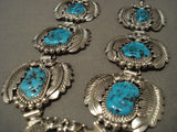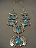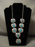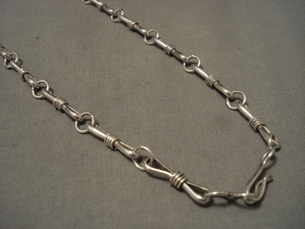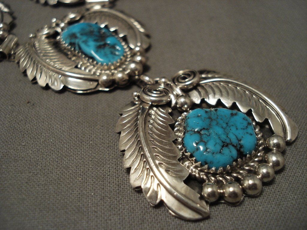 This is a marvelous modernistic Navajo Native American jewelry Native American jewelry "garden of leaves" silver necklace. This outstanding silver necklace contains 8 fabulous silver segments that each contains a beautiful Old Kingman turquoise stone. Surrounding each stone are superior silver leaves with accenting silver swirls and raindrops. Check out that impressive handmade silver link chain, beautiful infinity patterns. Each pendant measures around 1-1/4" X 1-1/4" and the average turquoise stone measures around 5/8" X 1/2". Sterling silver, marked. Signed by Navajo Native American jewelry Native American jewelry artist, H. Etsitty . The length of the necklace measures around 29". Sturdy 101 grams. LAYAWAYS- We are happy to work with you and are more flexible than anyone on the net. Simply send us an email for more information.