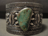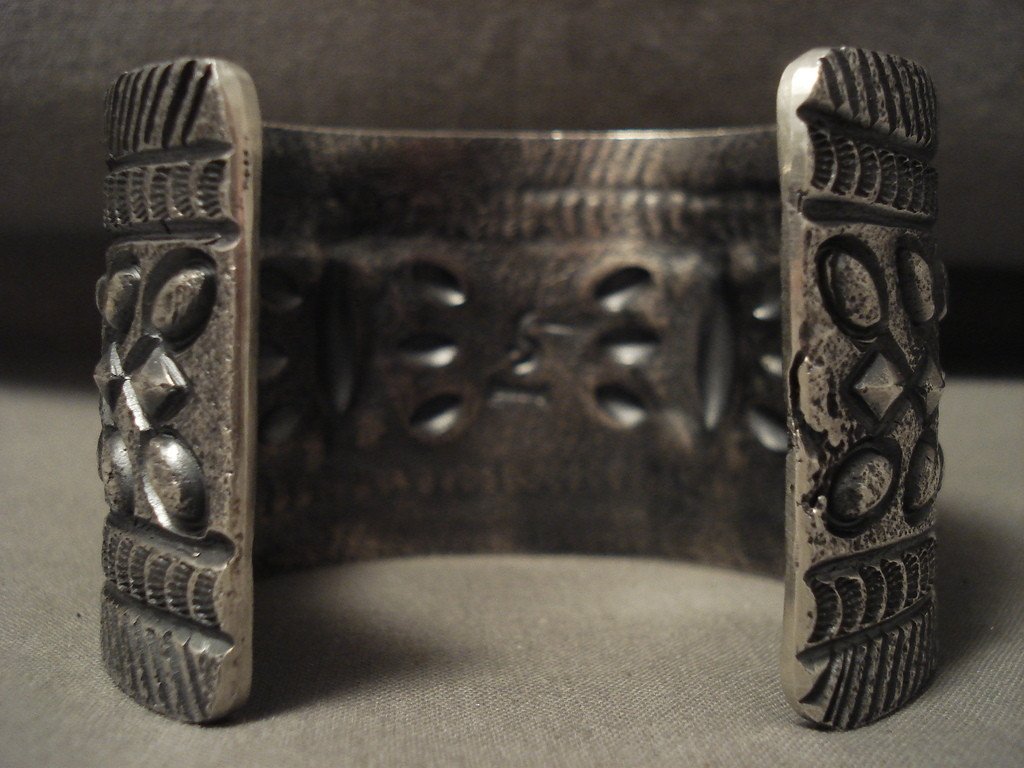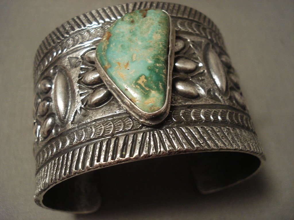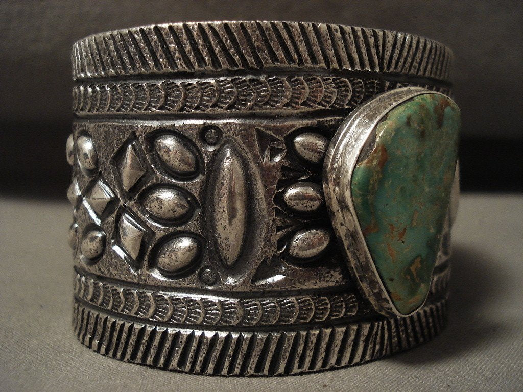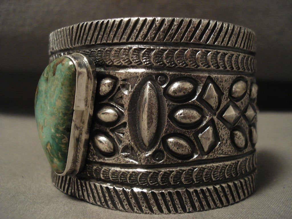 This is a museum quality vintage Navajo Native American jewelry Native American jewelry tufa cast silver bracelet. This piece contains a huge natural Royston turquoise stone. The bracelet weighs a mind blowing 132 grams! Resting on the cuff are remarkable hand repoussed silver shells. Bordering the cuff are stunning slanted line segments with surrounding sun patterns. The center stone measures around 1-1/8" x 3/4". The width of the bracelet measures around 1-3/4". Signed by Navajo Native American jewelry Native American jewelry artist, Stue Billie . Sterling silver. The inside end to end measures around 5-3/4" with an additional 1-1/4" gap. Sturdy 132 grams. LAYAWAYS- We are happy to work with you and are more flexible than anyone on the net. Simply send us an email for more information.