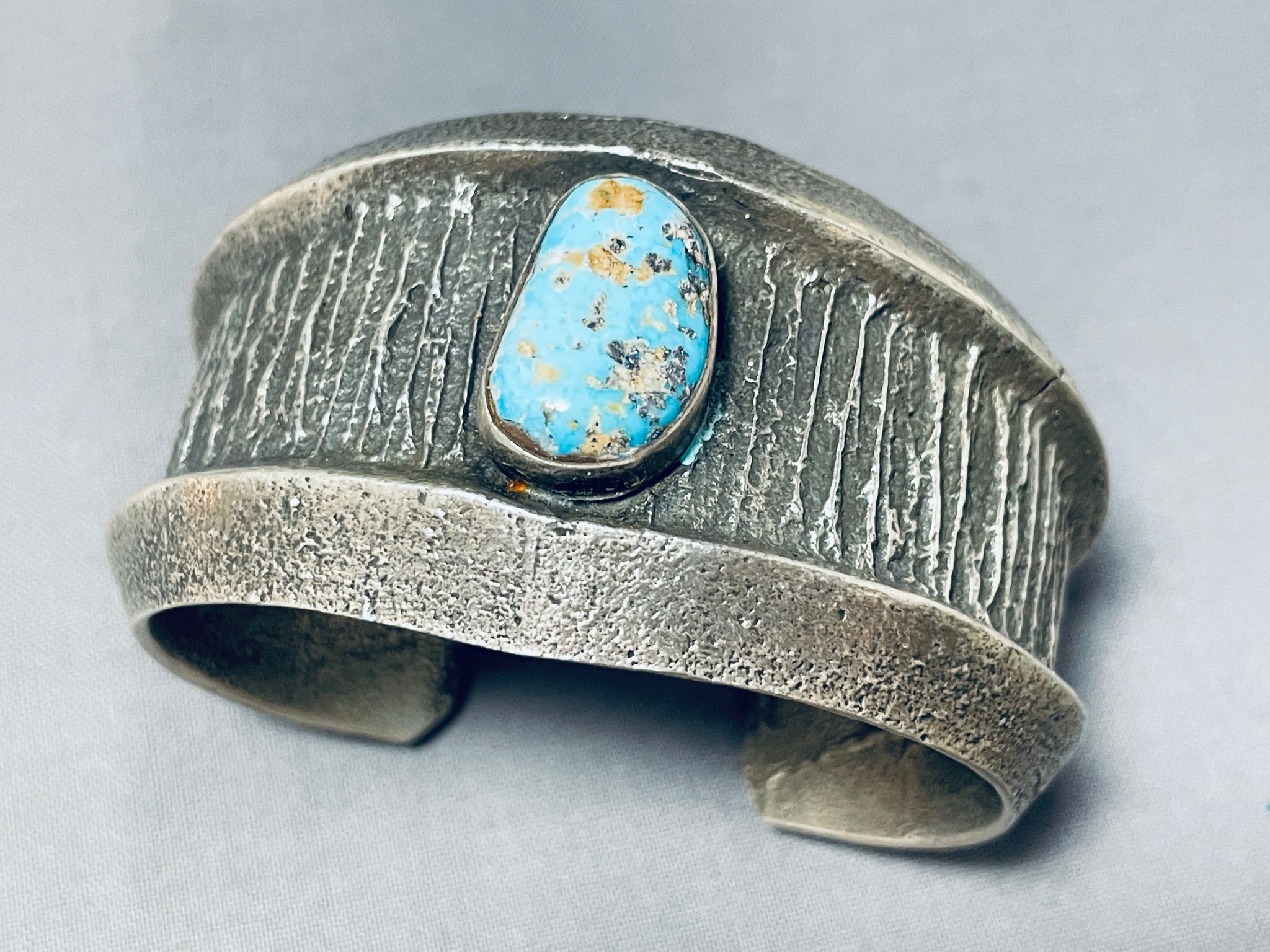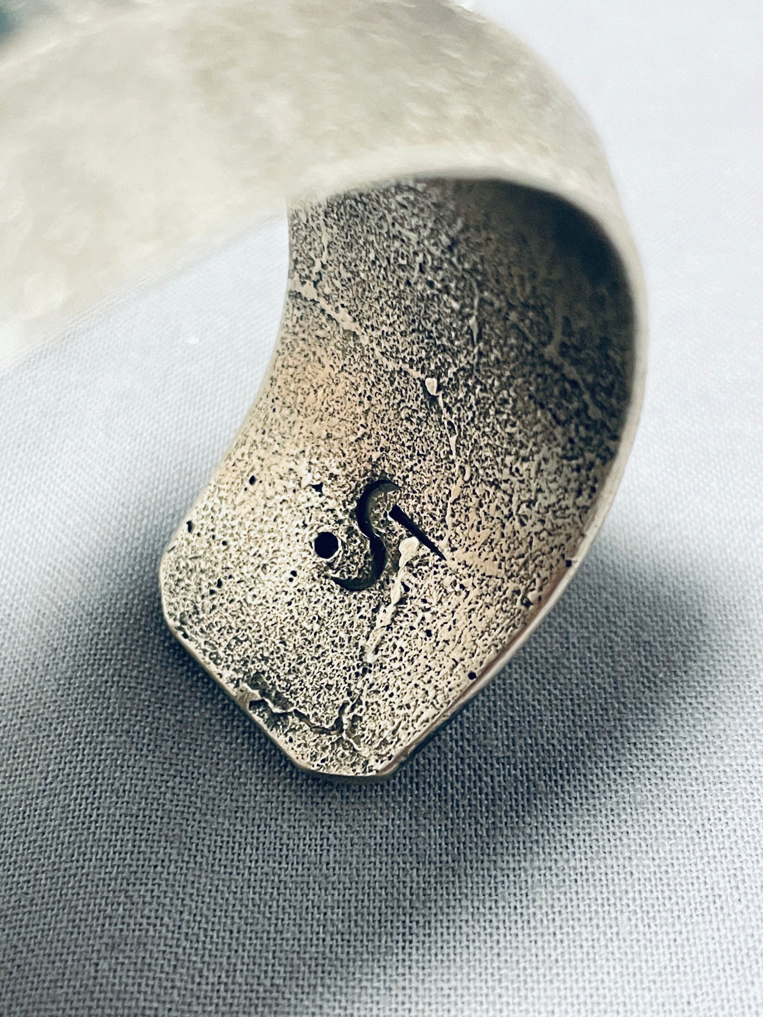 This is a wonderful Navajo very large and heavy silver cuff bracelet. This remarkable bracelet contains a beautiful center chunky Old Kingman turquoise stone. I absolutely love the textured cuff running from one end to the other, so remarkable. The edges of the cuff protrude out from the cuff giving the bracelet that much more character. The center stone measures around 3/4" x 1/2". The width of the bracelet measures around 1-1/2". Signed by Navajo artist, Stu Billie. Sterling silver. Cir. 1980's+. The inside end to end measures around 5-1/2" with an additional 1" gap. Sturdy 137 grams.